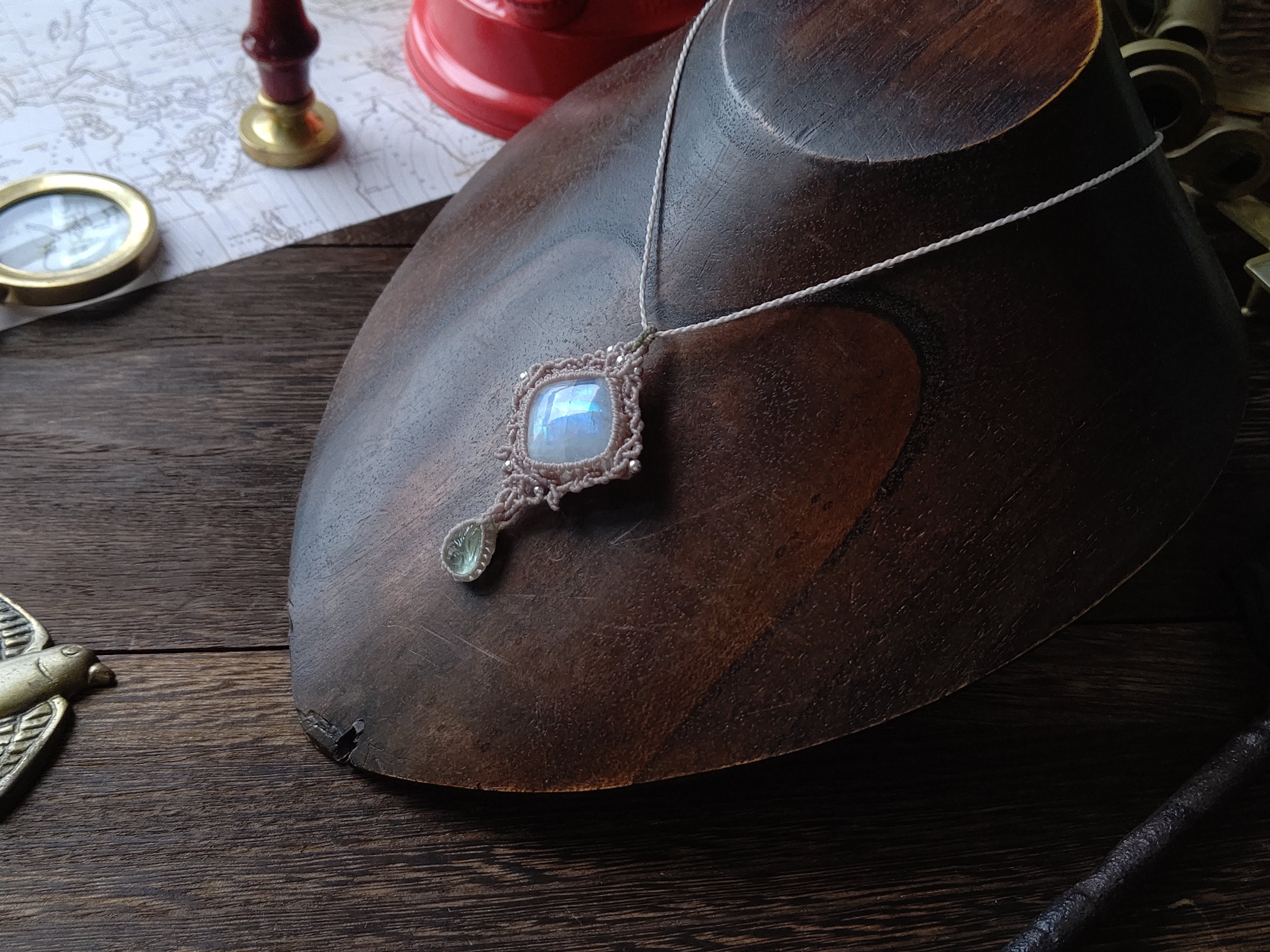 大粒で美しいシラーが見られるスクエア型のレインボームーンストーン(ホワイトラブラドライト)に羽模様が彫り込まれたグリーンベリルを組み合わせてペンダントにしました。