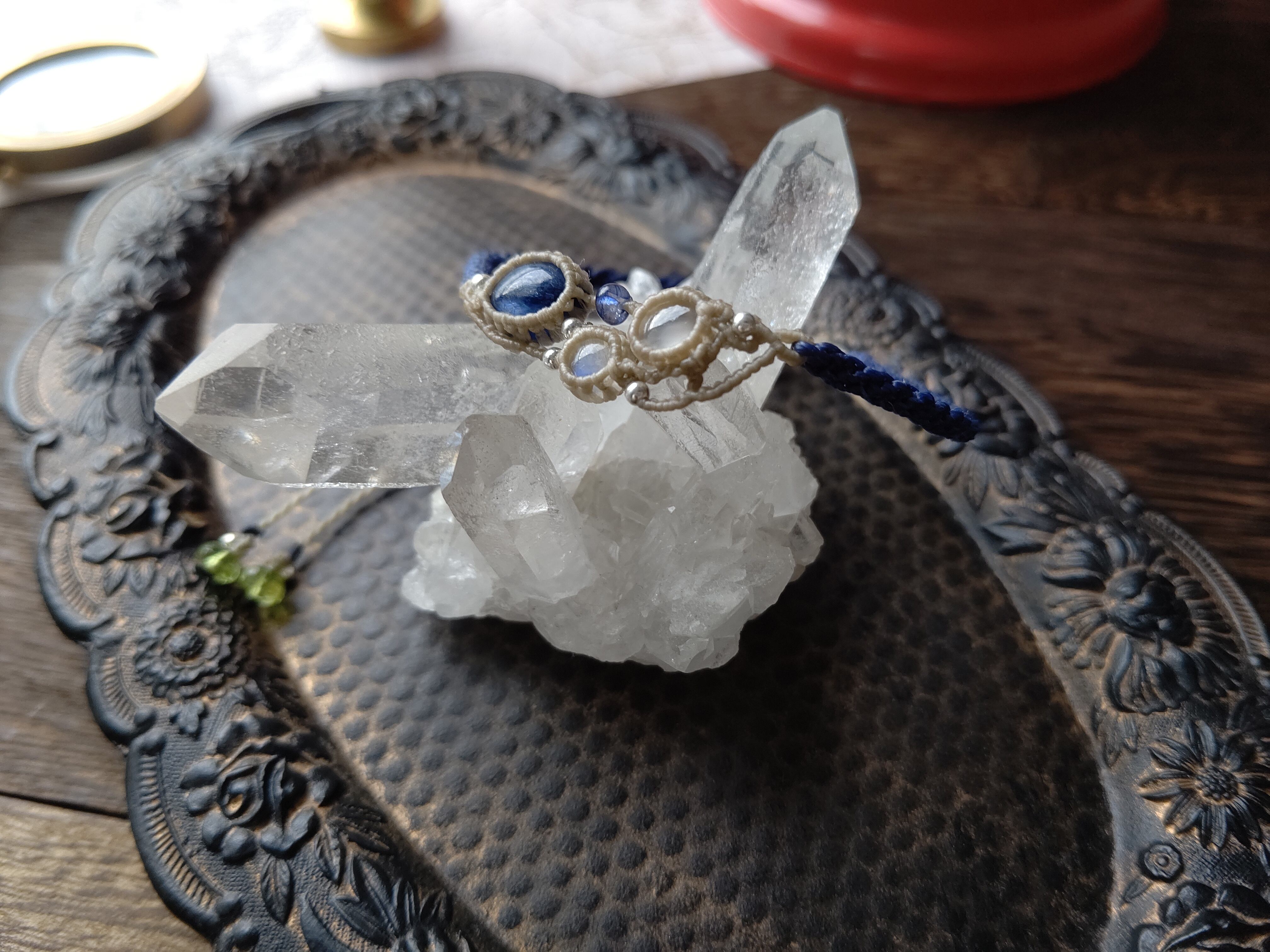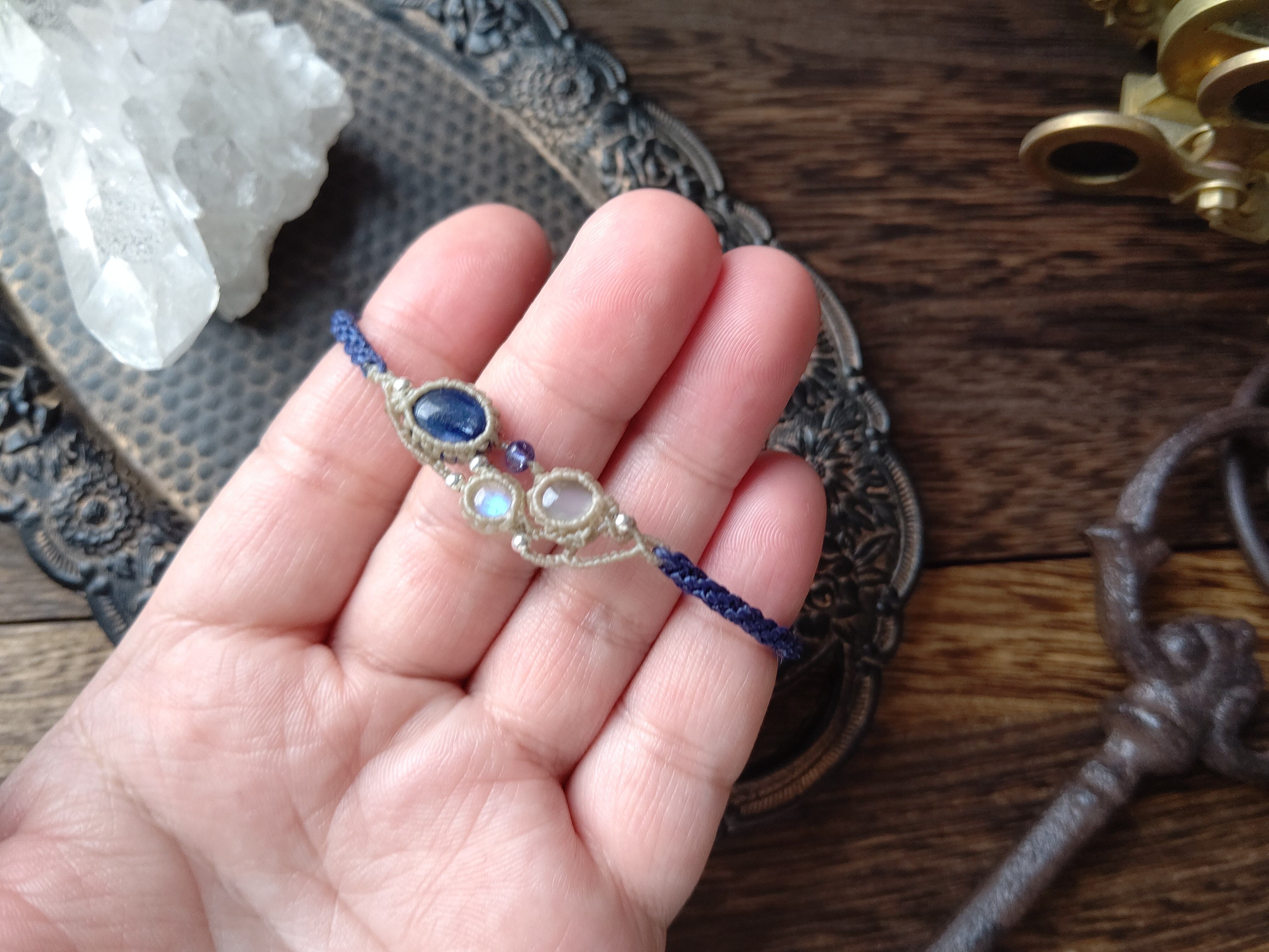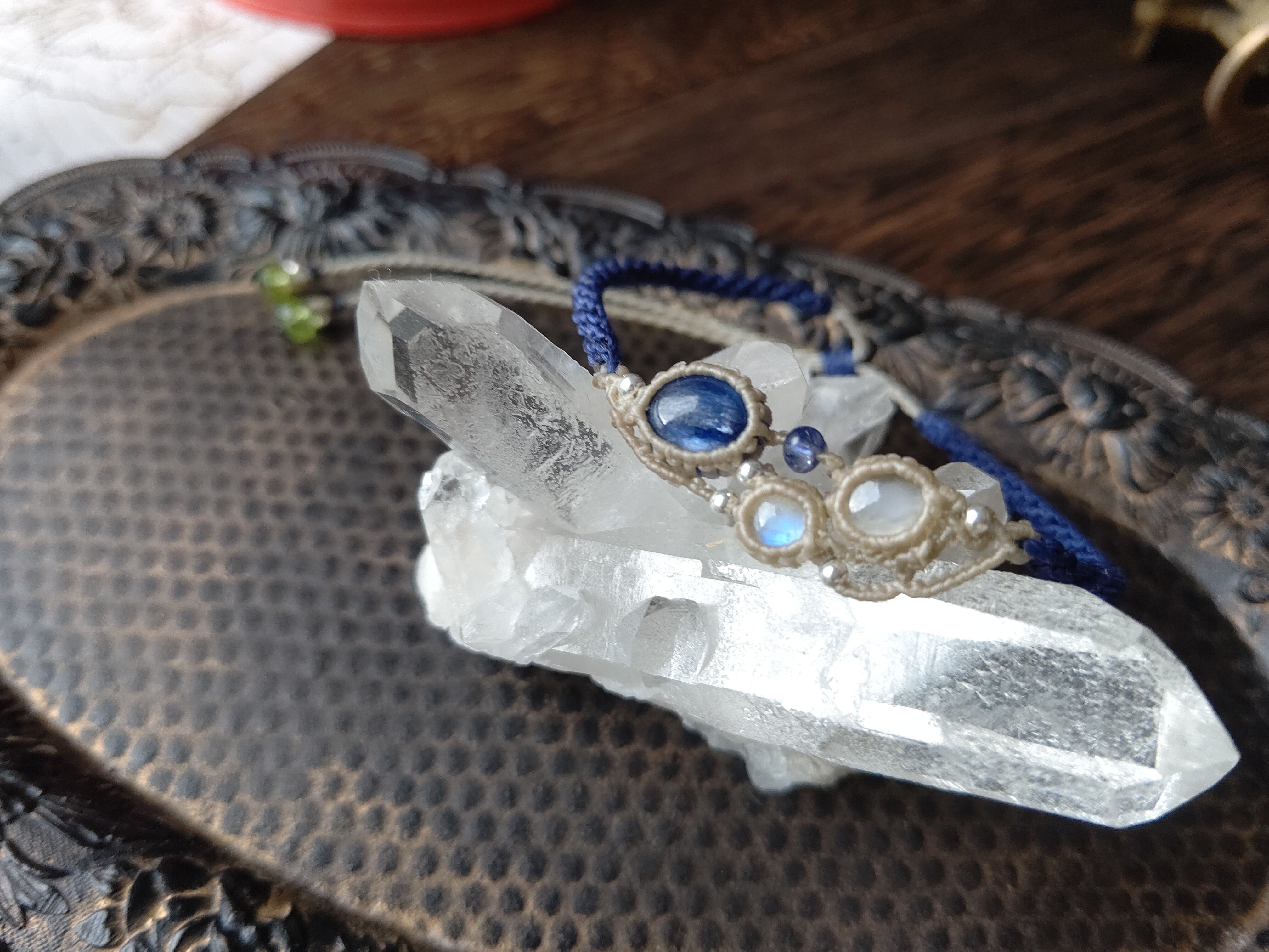 青の宝石(カイヤナイト×サファイア×ブルームーンストーン×ホワイトムーンストーン)のマクラメブレスレット