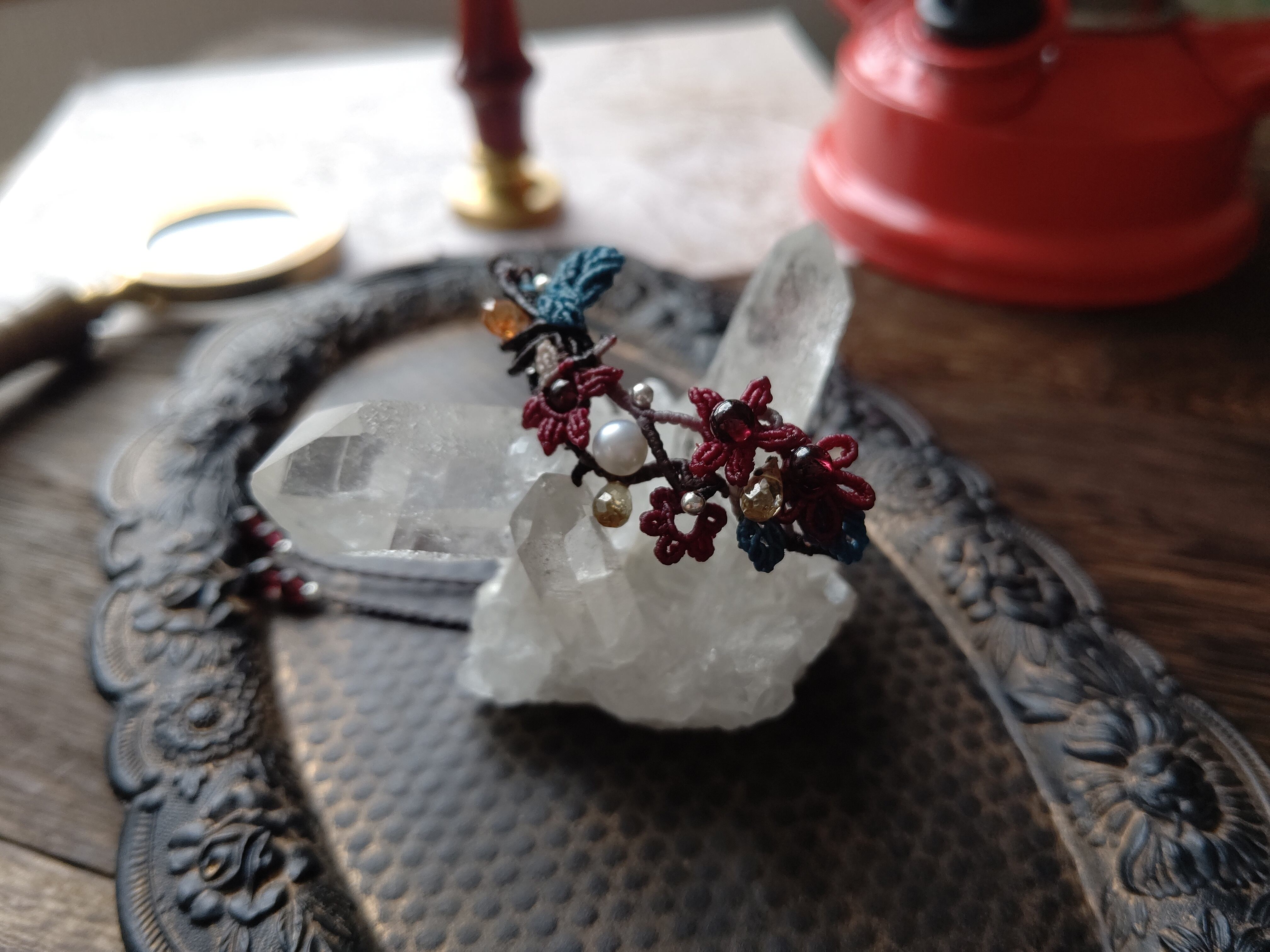 宝石質のジルコン、宝石質のホワイトラブラドライト、真珠、1月の誕生石のガーネットをちりばめたブレスレットを編み上げました。一つ一つモチーフをまず編み上げてから枝や花、葉のように連結をさせました。