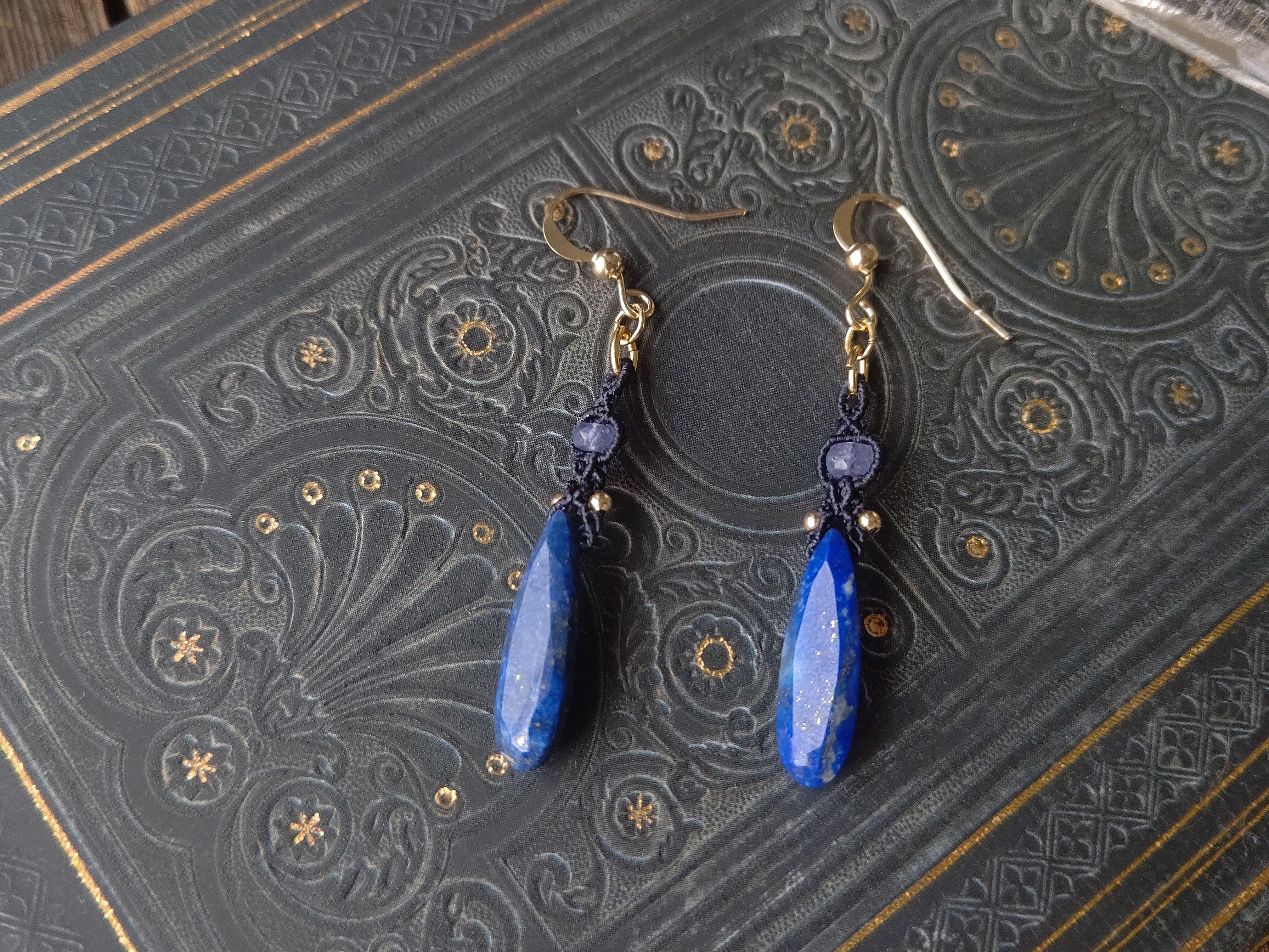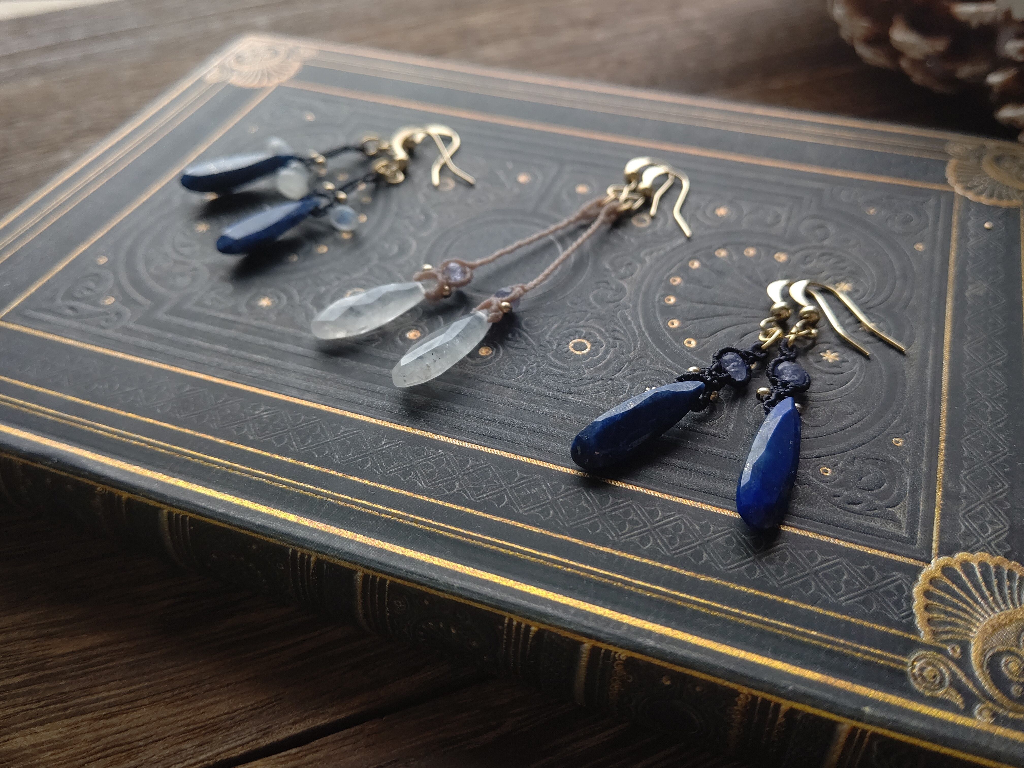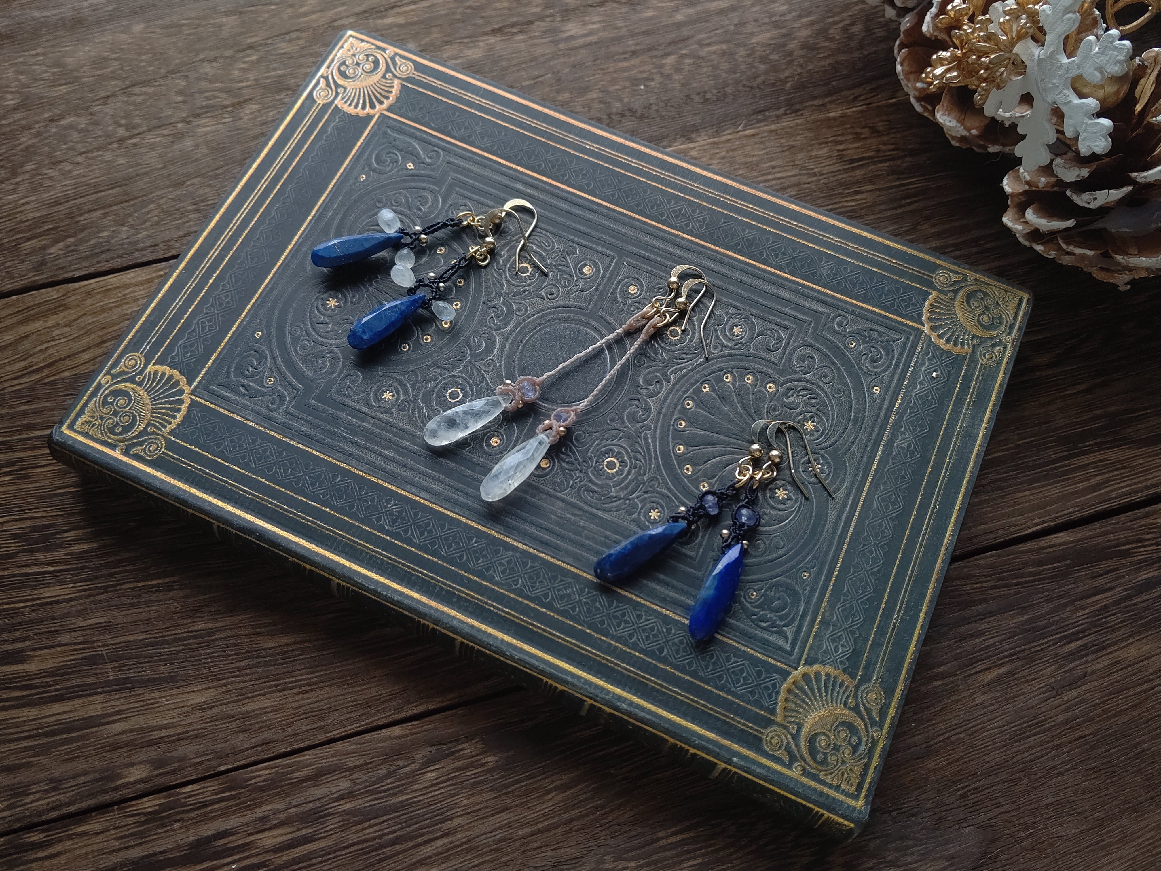 深い群青色に金箔のようなパイライトが煌めくラピスラズリとタンザナイトを使い、耳元でゆらゆら揺れる耳飾りを製作しました。