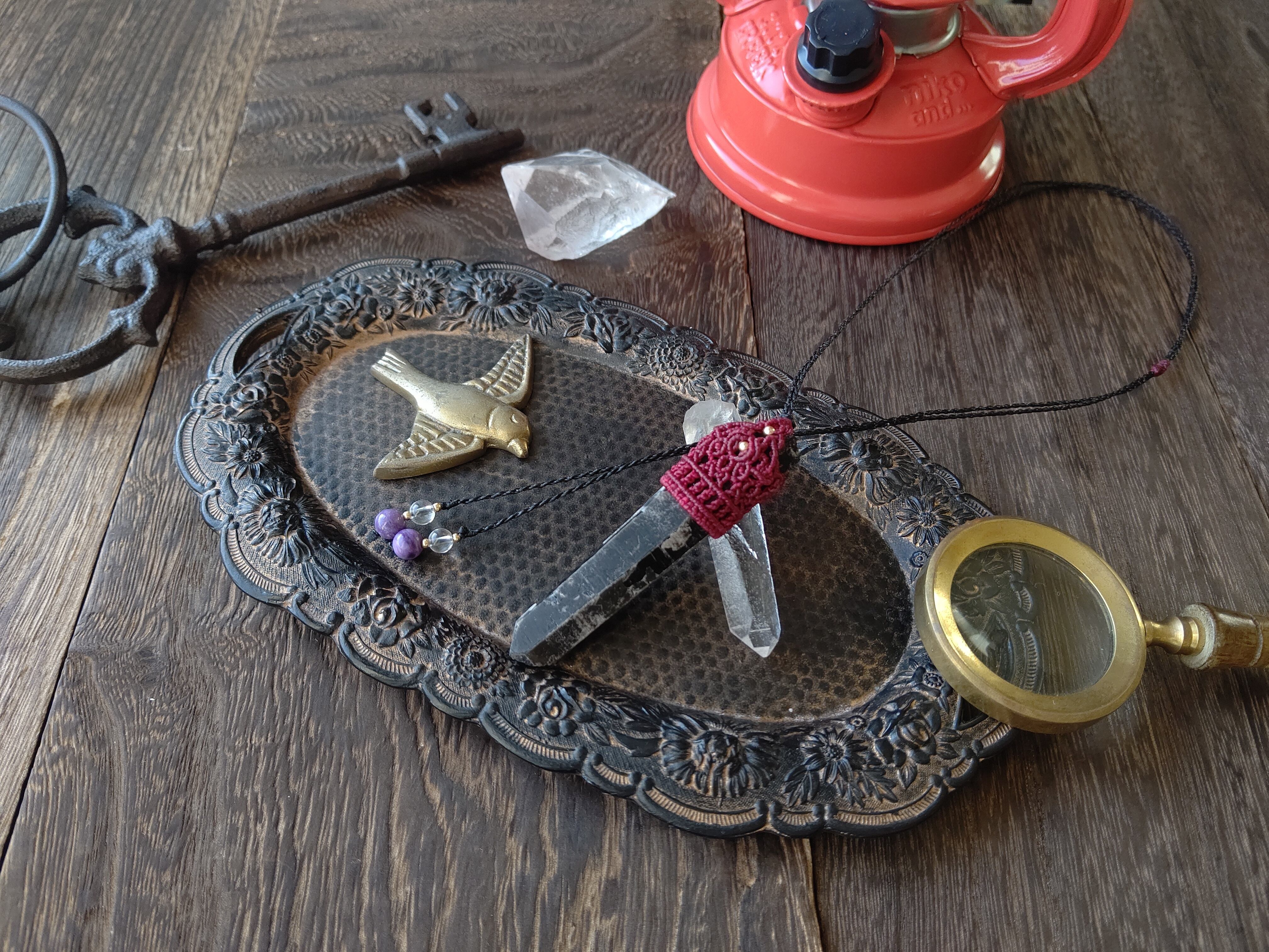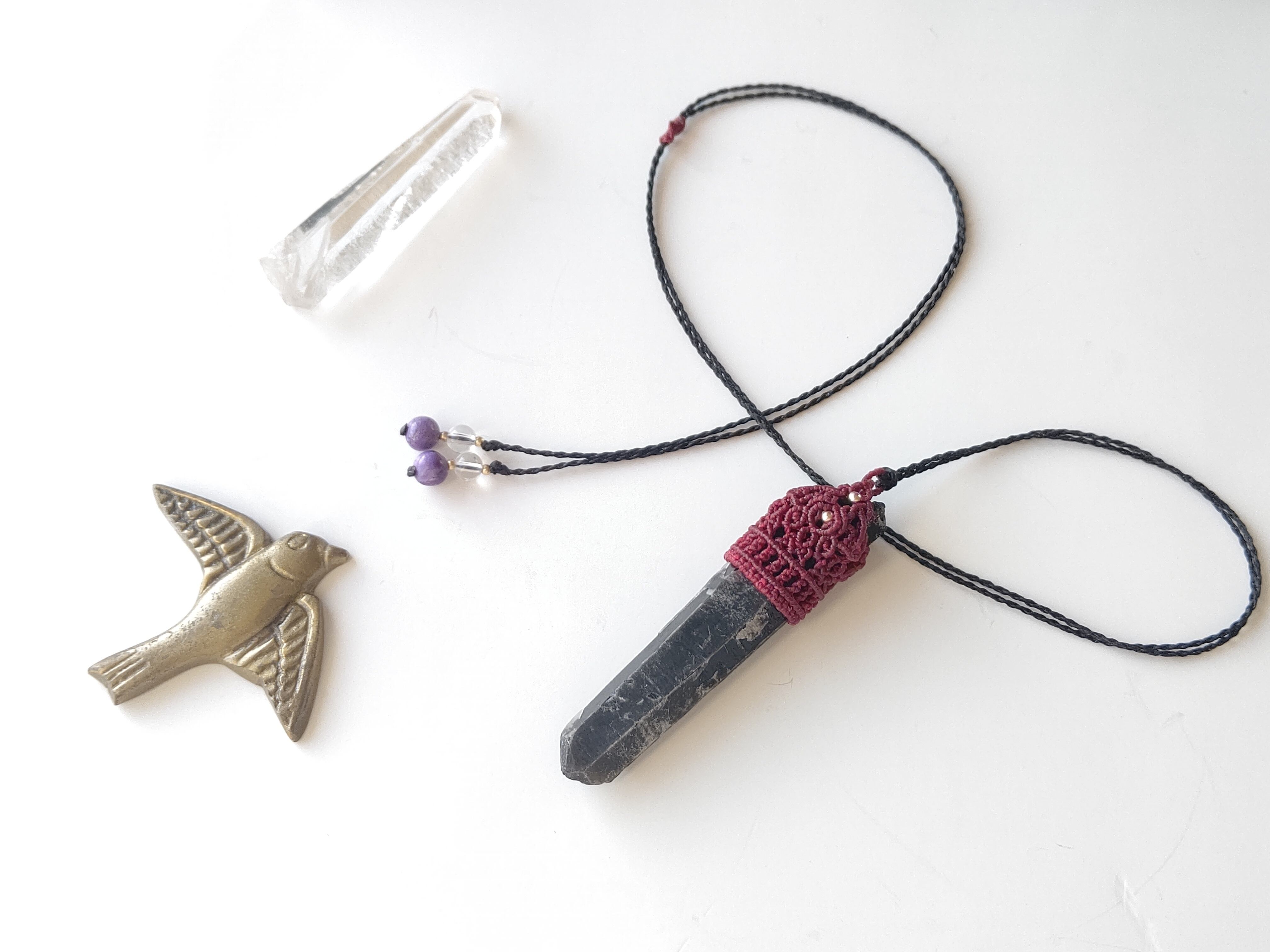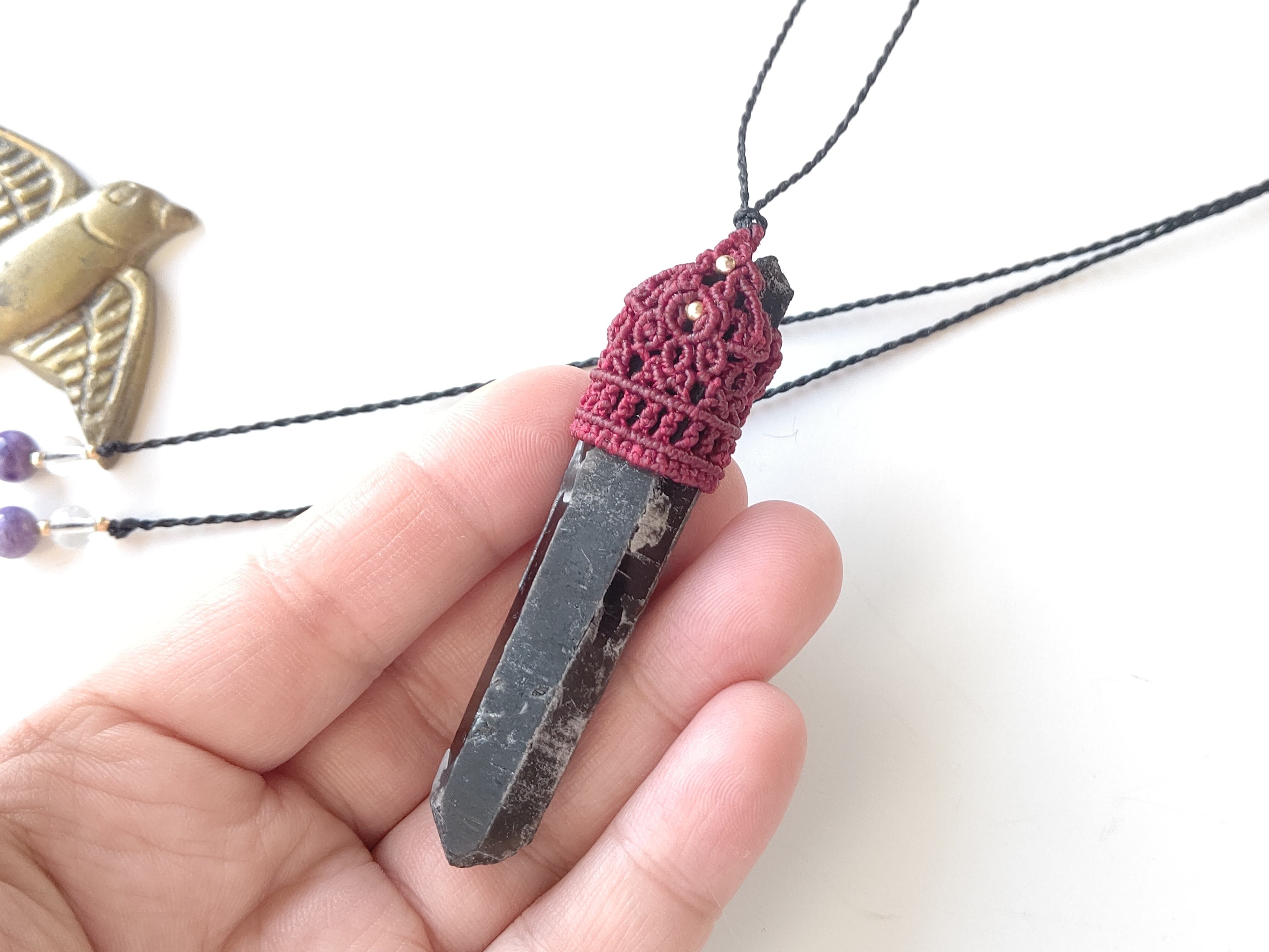 【原石】黒水晶モリオンのマクラメペンダント;赤