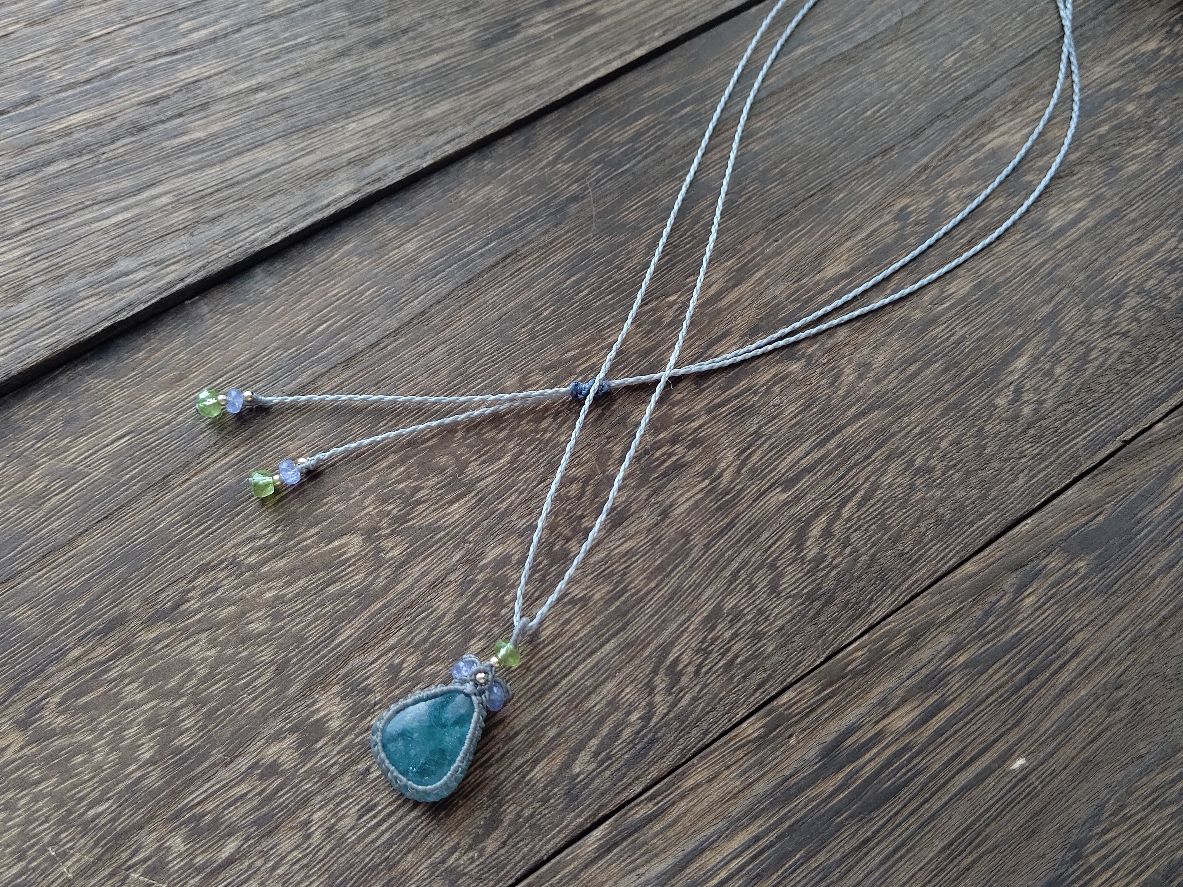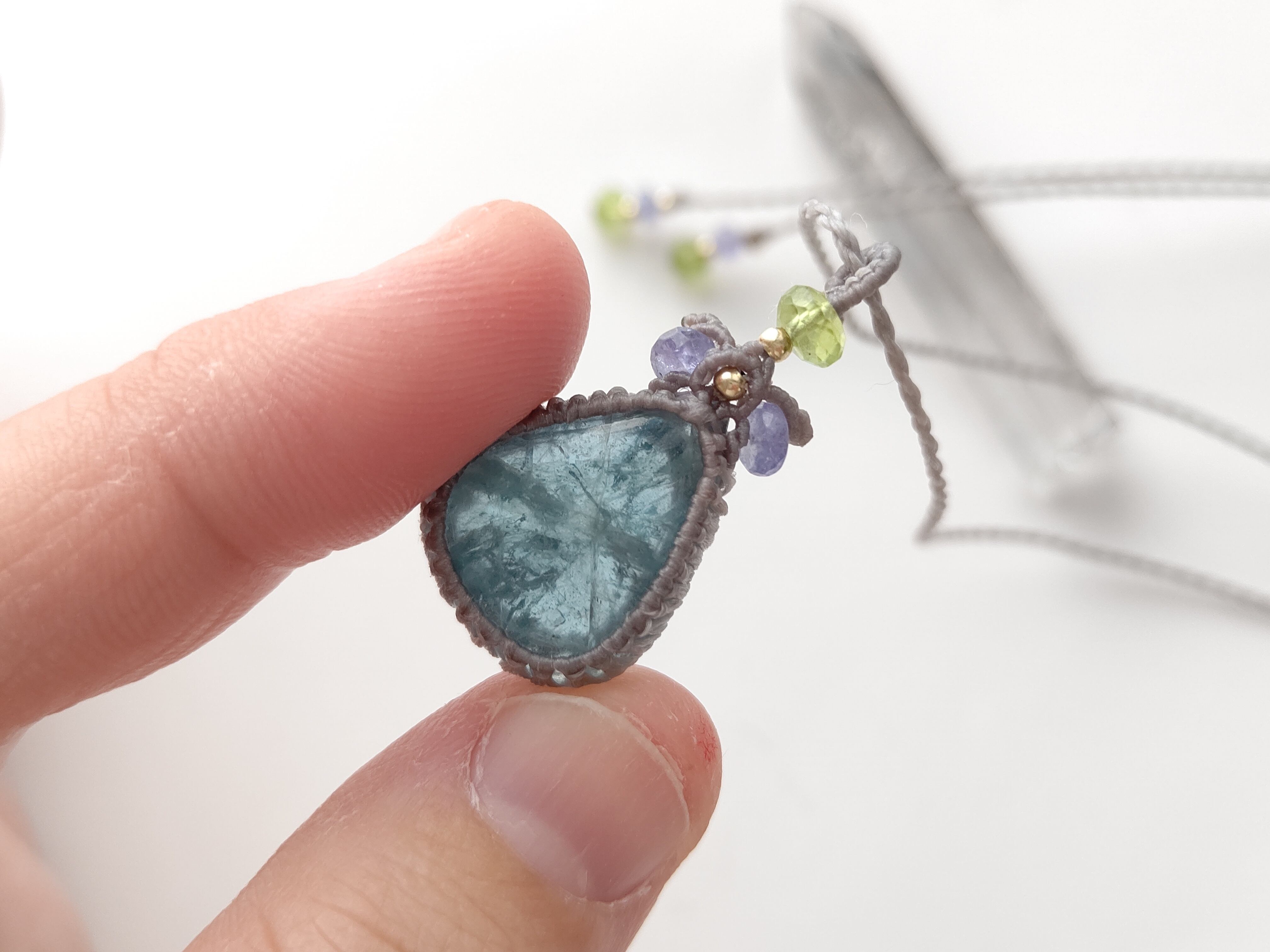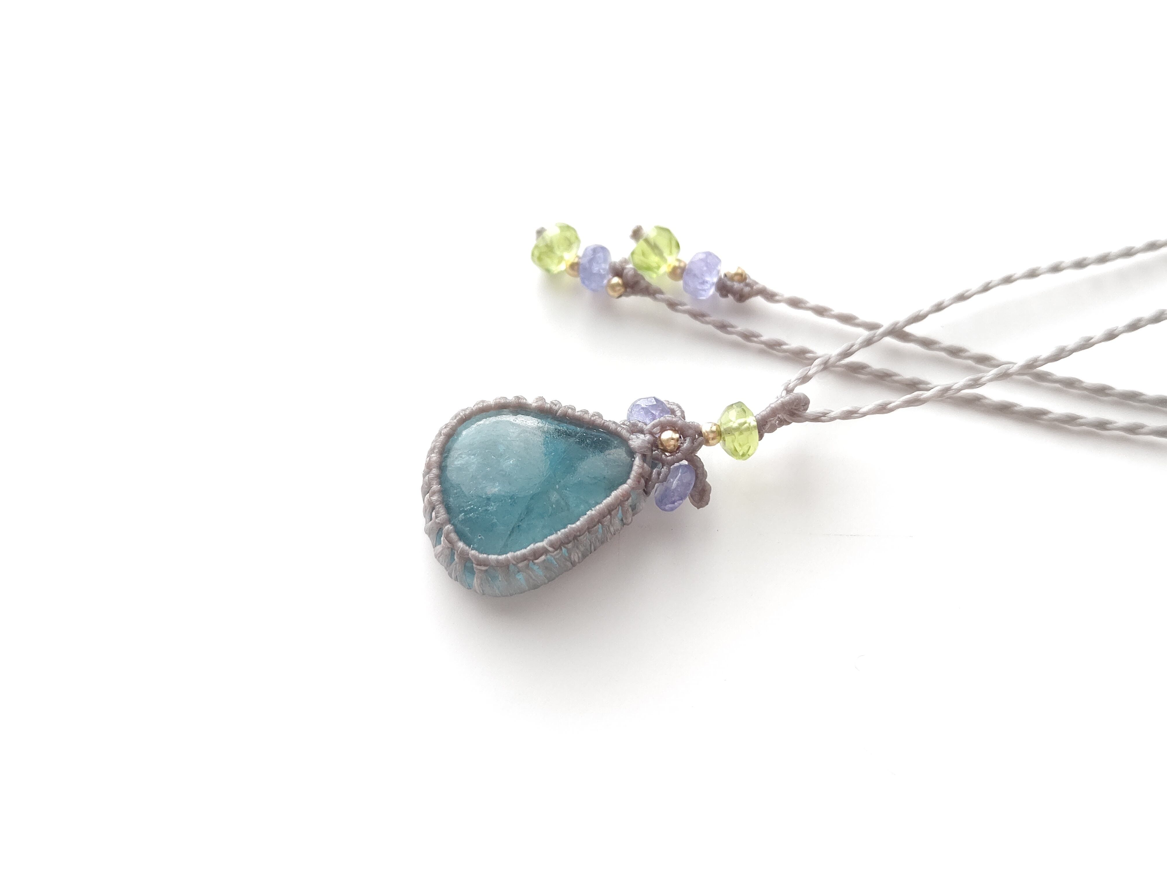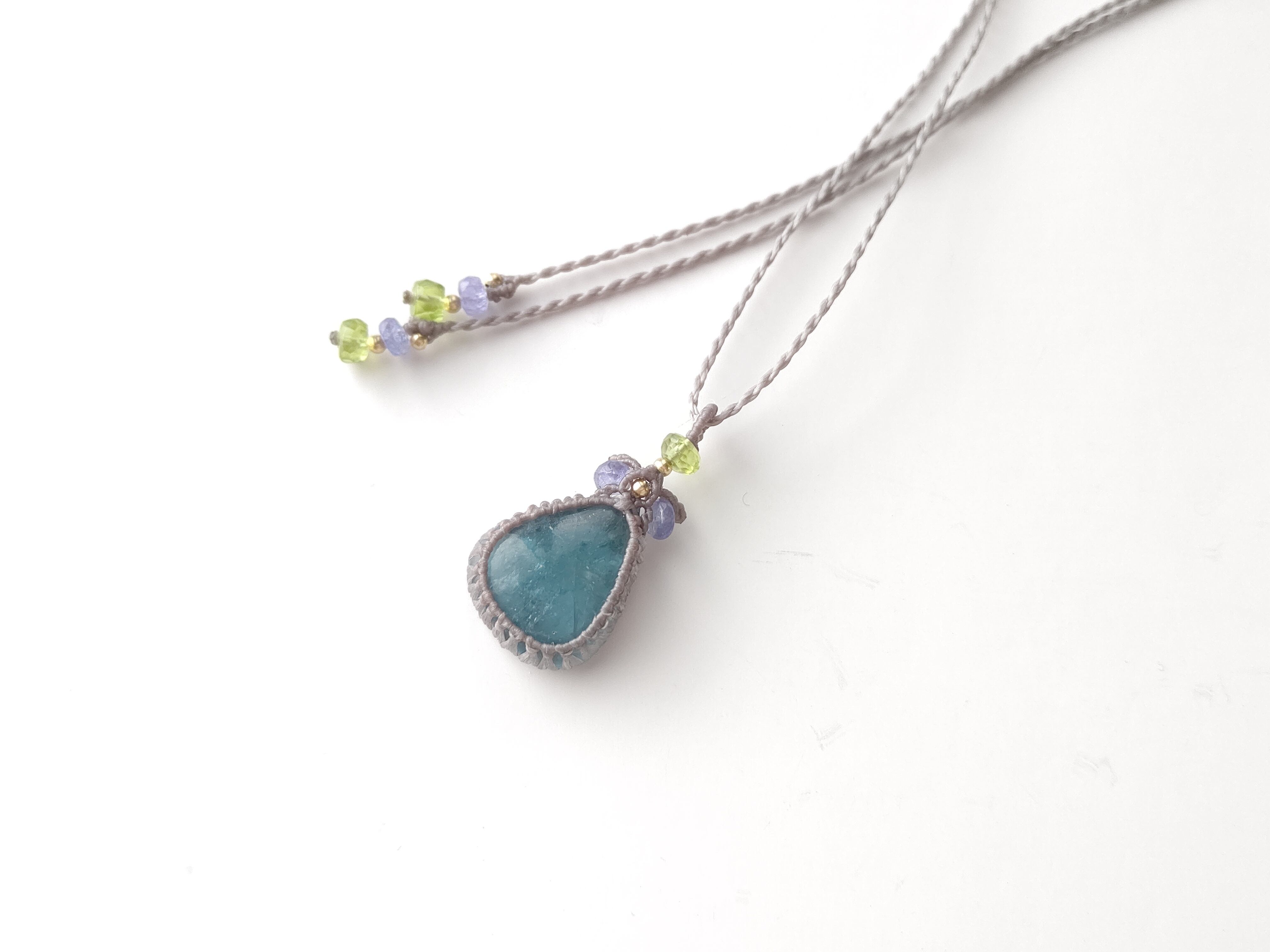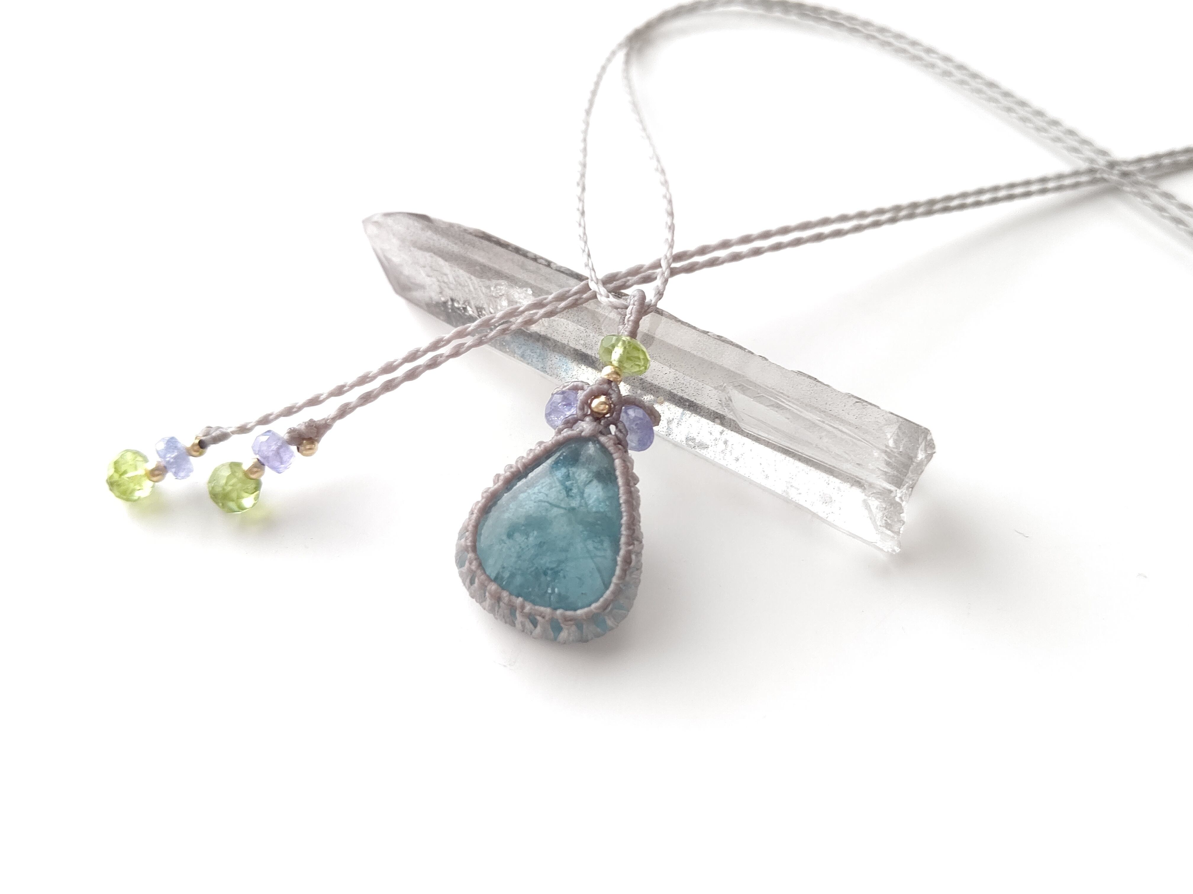 非加熱アクアマリンとタンザナイト×ペリドットのマクラメペンダント