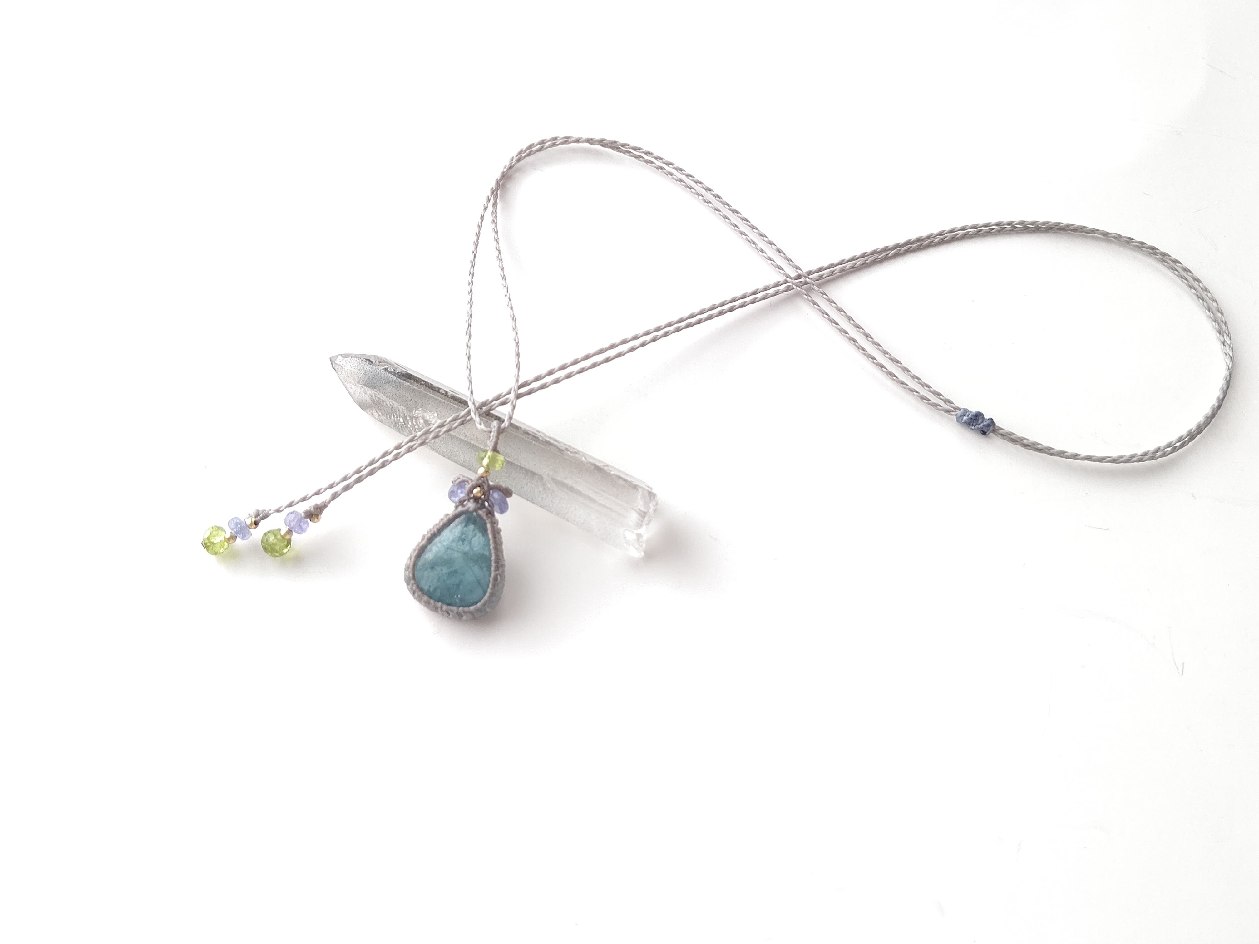 淡い水色の非加熱アクアマリンを日常でもたくさんお使いいただけるようなペンダントに仕立てました。ペリドットやタンザナイトの天然石ビーズをアクセントに編み込んだ、ワンポイントとして使いやすいデザインです。