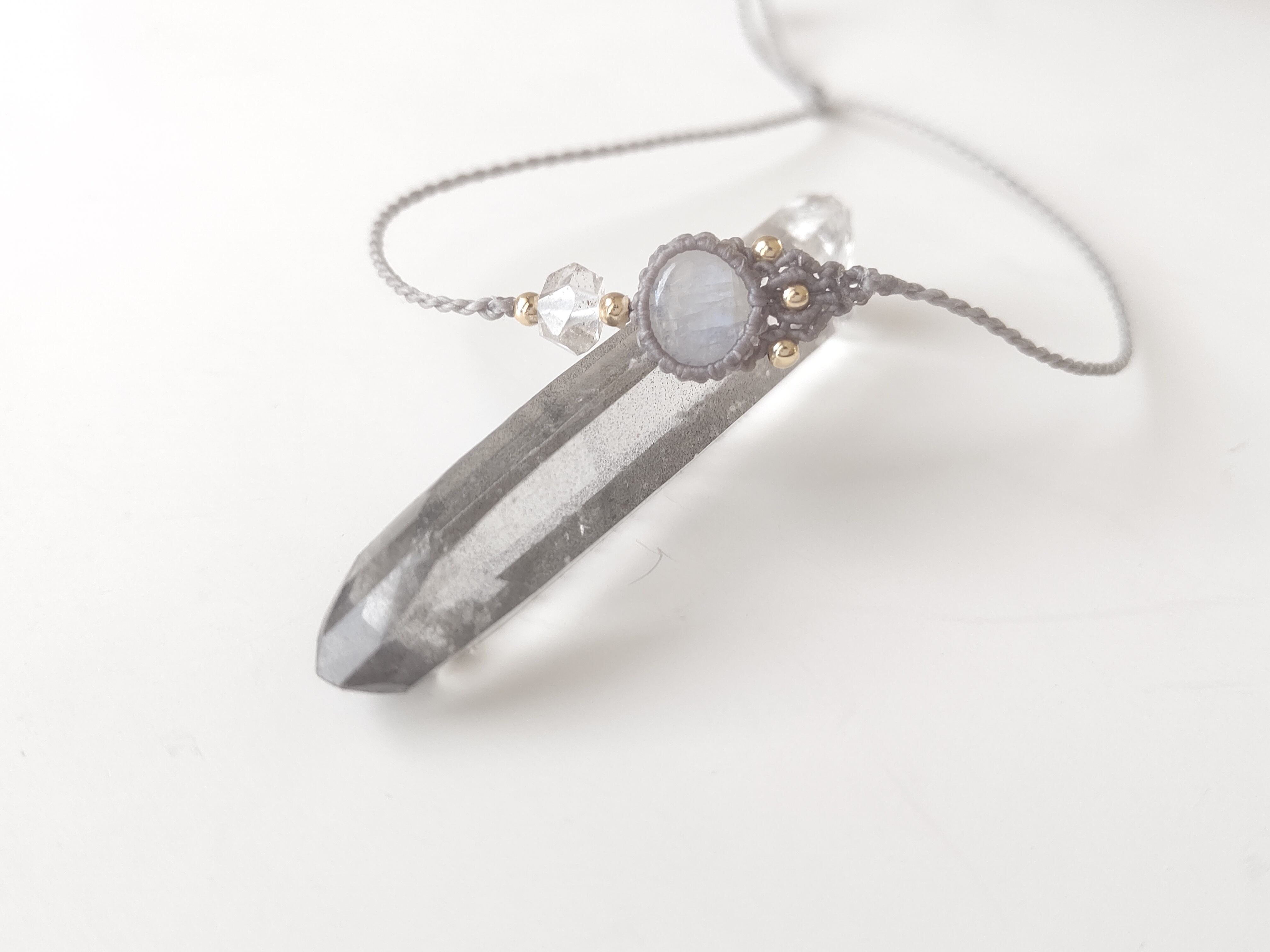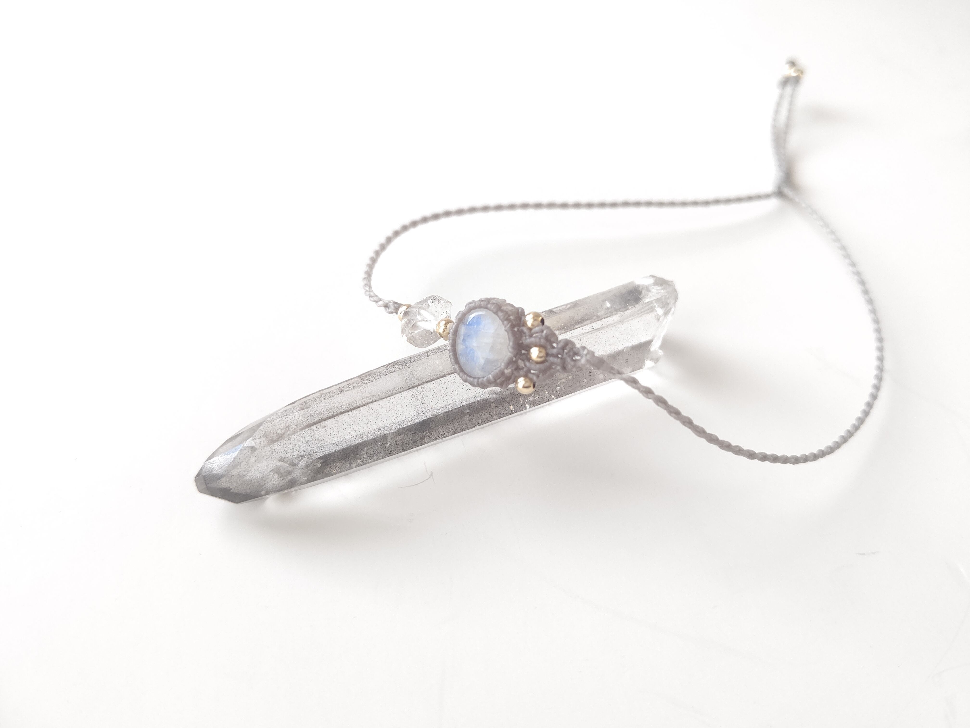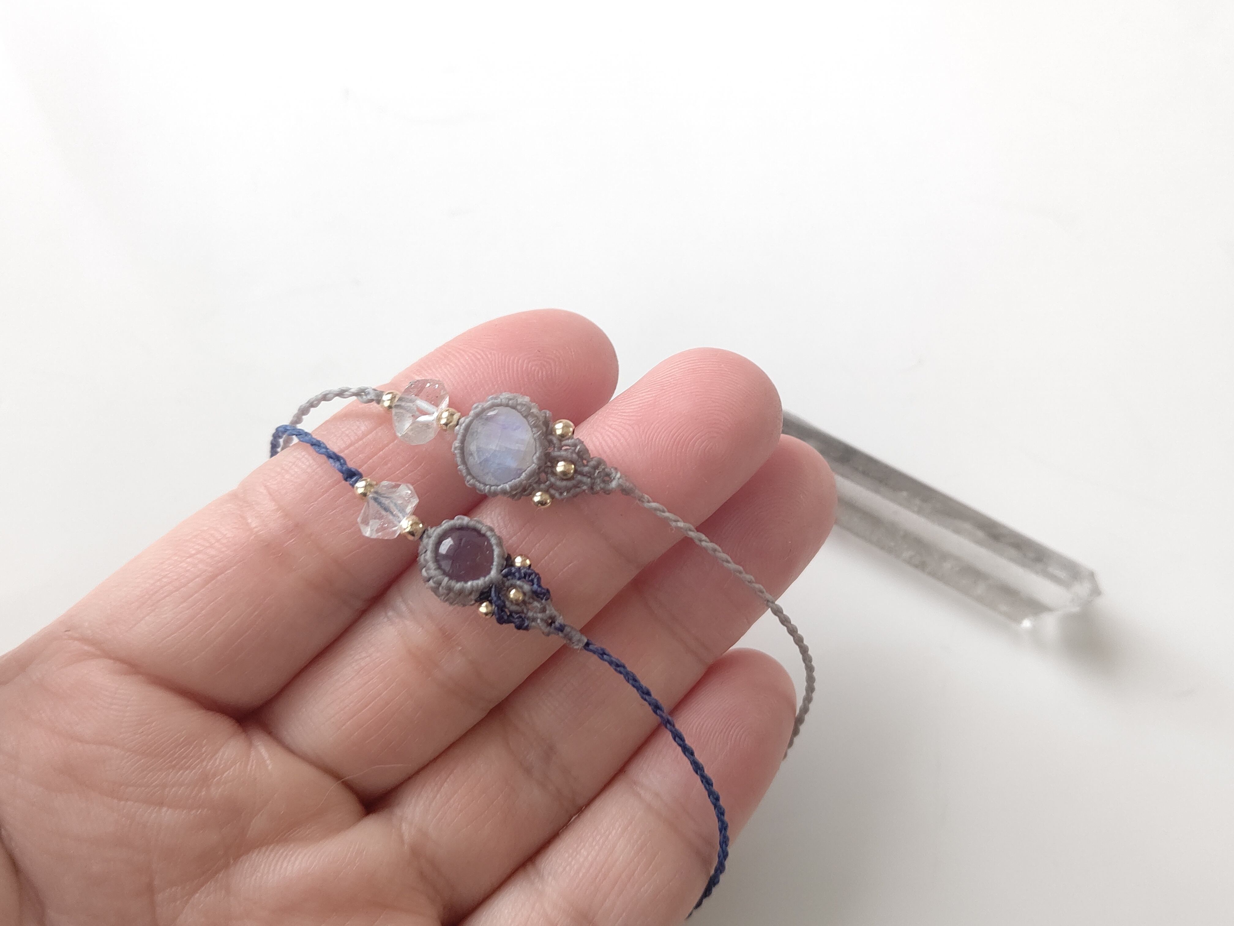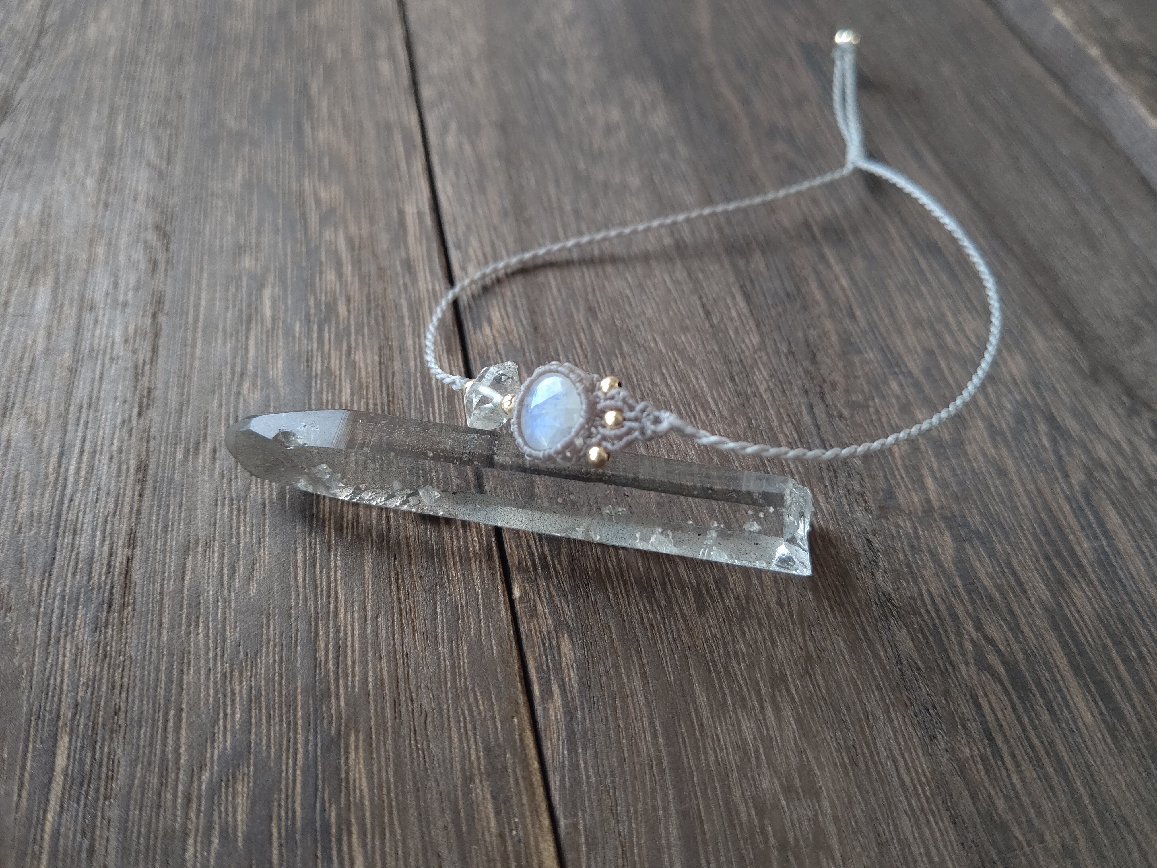 ハーキマーダイヤモンドの原石とホワイトラブラドライトを組み合わせスッキリとした細身のデザインのアシンメトリーブレスレットを製作しました。