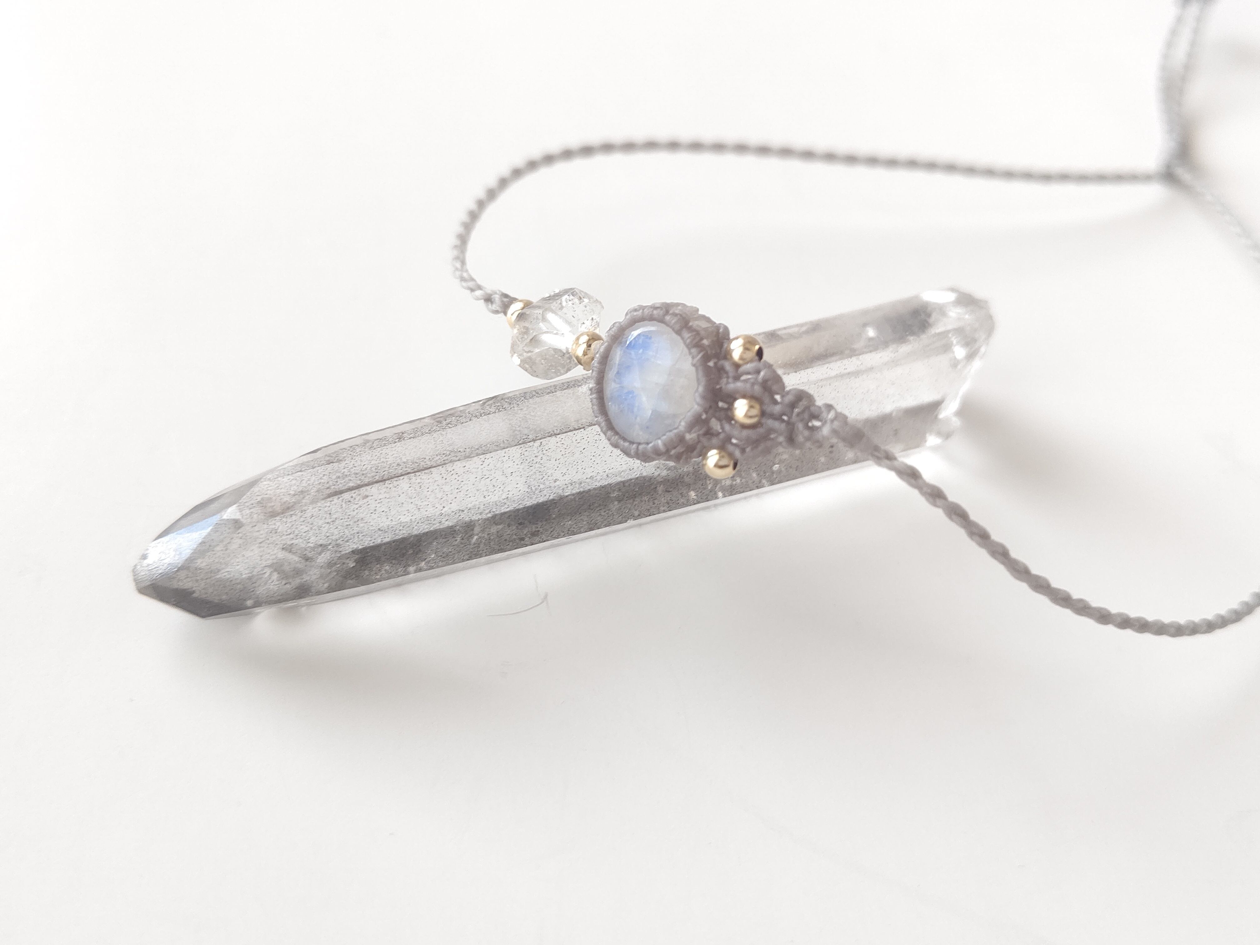 ホワイトラブラドライトは淡いブルーのシラーがうっすらとご覧いただける、ころんとかわいらしいルースです。ハーキマーダイヤモンドは両錐の美しい透明感のある結晶です。