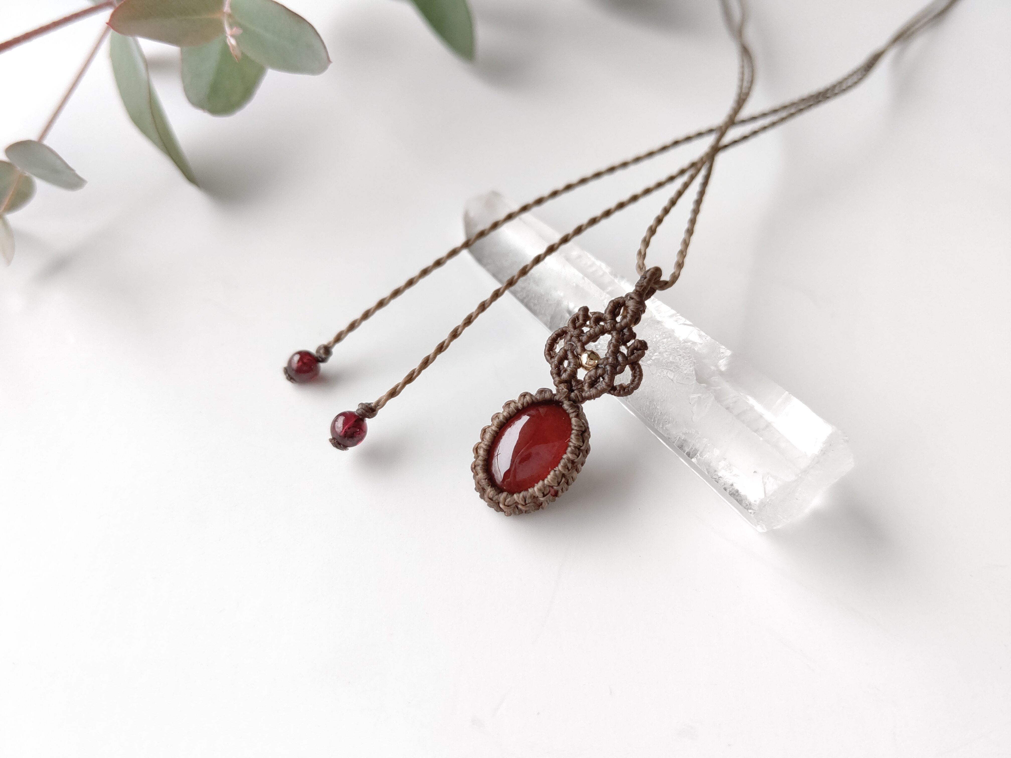 深みのある深紅のヘソナイトガーネットでマクラメらしい編み込みのカジュアルなペンダントを製作しました。