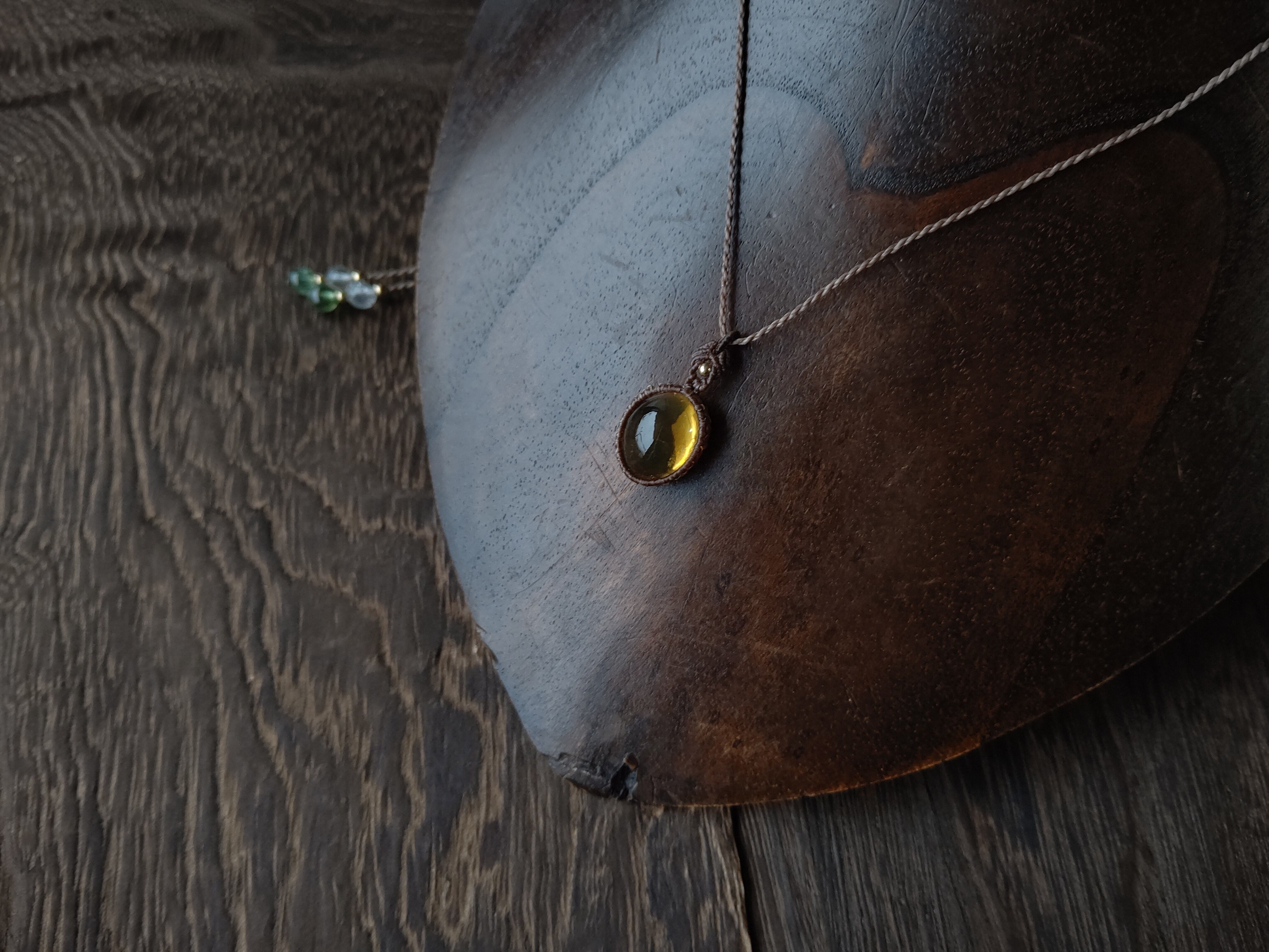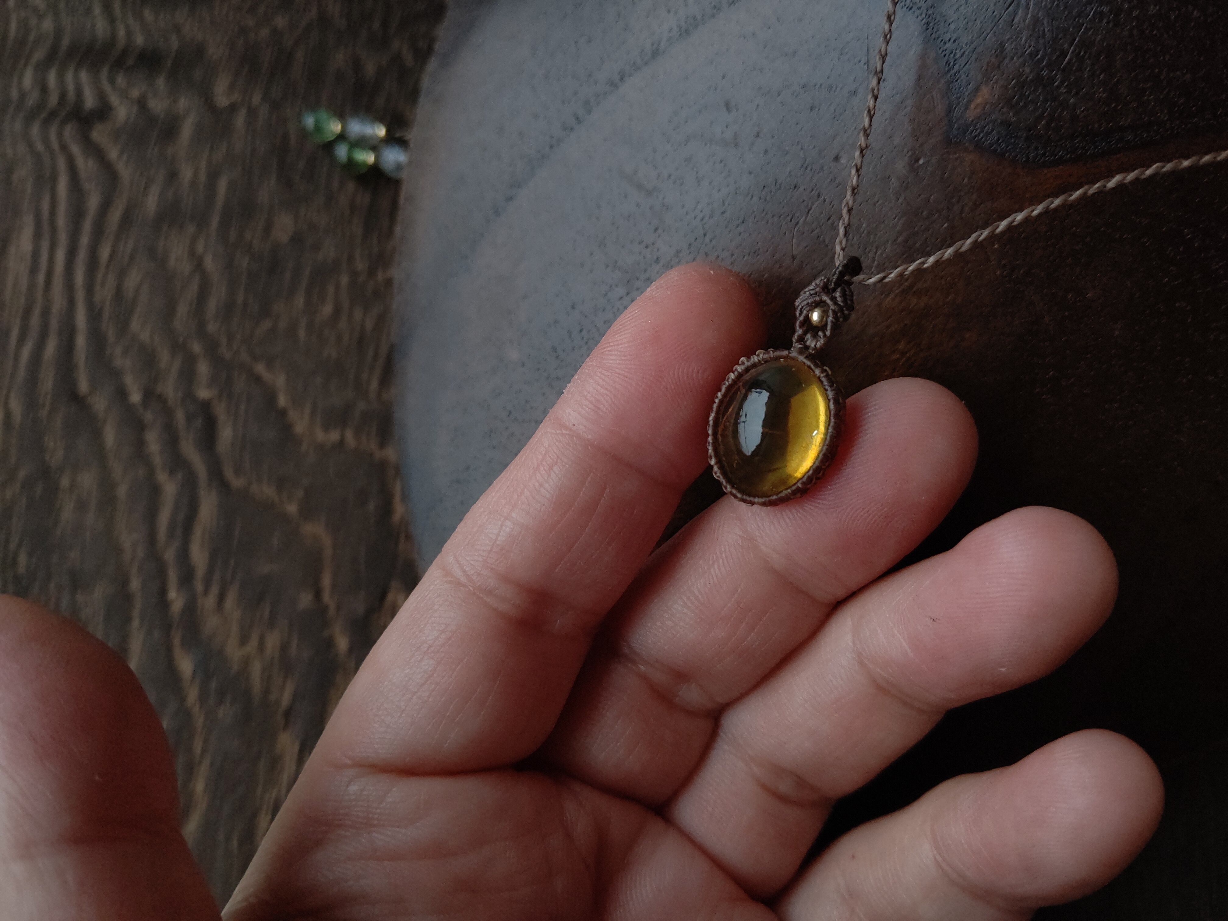 ブラジル産の非加熱シトリンでマクラメらしい編み込みのカジュアルなペンダントを製作しました。