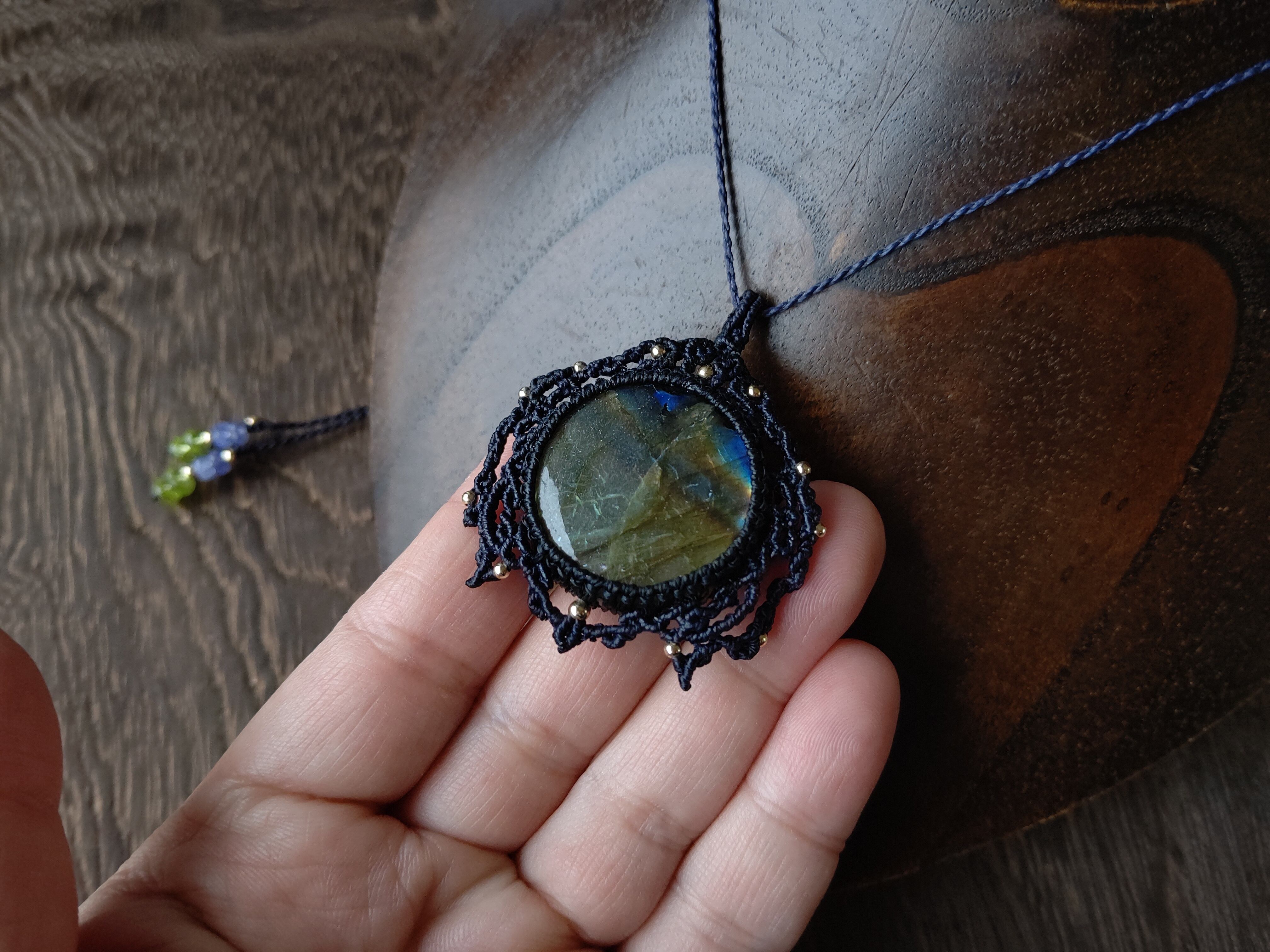 角度によってシラーが強く見える角度やそうでない角度はあるのですが、大粒で迫力のある色合いをご覧いただけます。雰囲気のある美しいルースをダークネイビーの糸でしっかりと編み込み、12星座に見立てて、12個14kgfビーズを編み込んでいます。結び石は宝石質のタンザナイトとペリドットです。