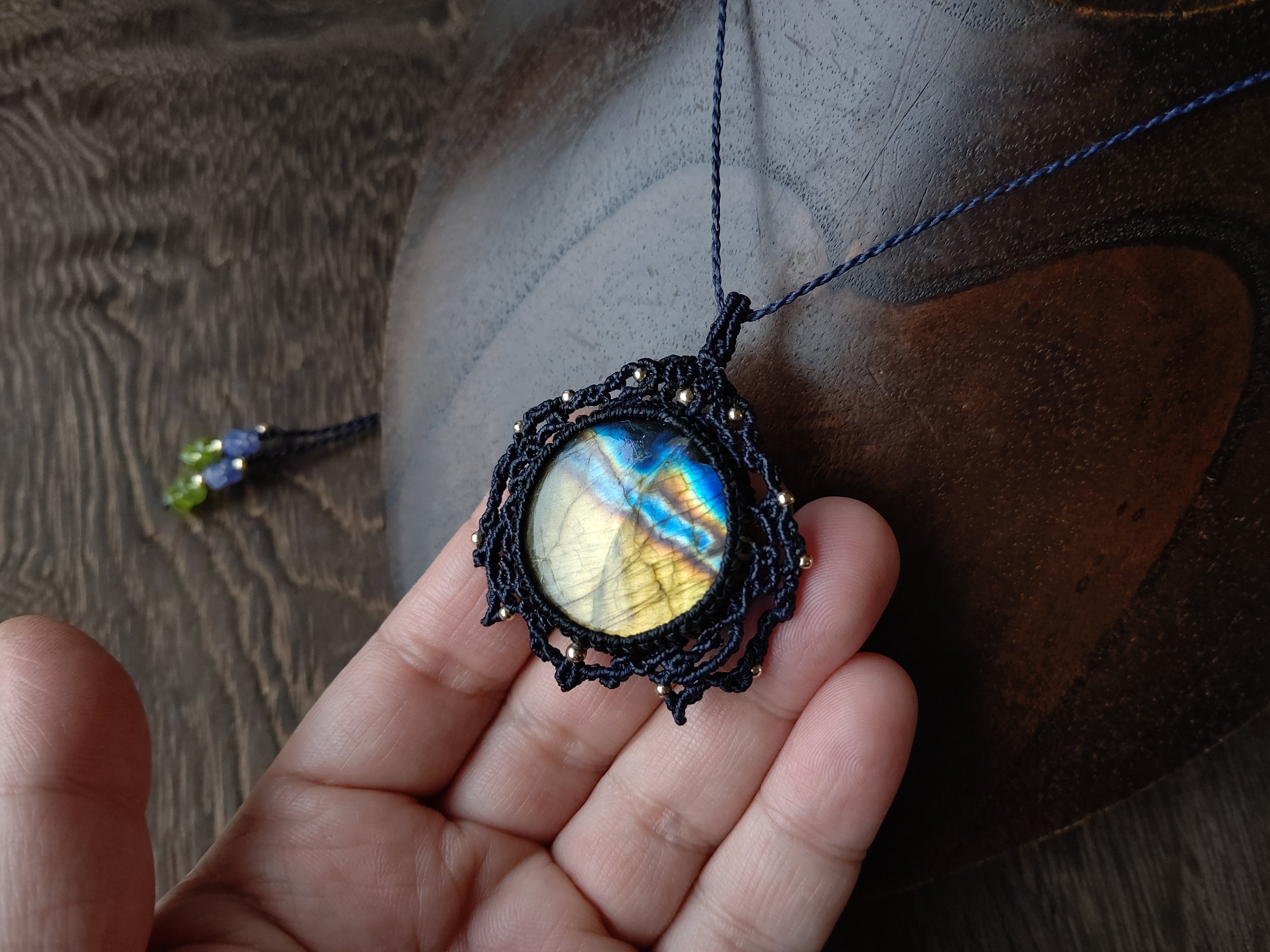 金の穂の海と青い空を閉じ込めたような印象的な絵画のようなスペクトロライトを曼荼羅風のペンダントに仕立てました。