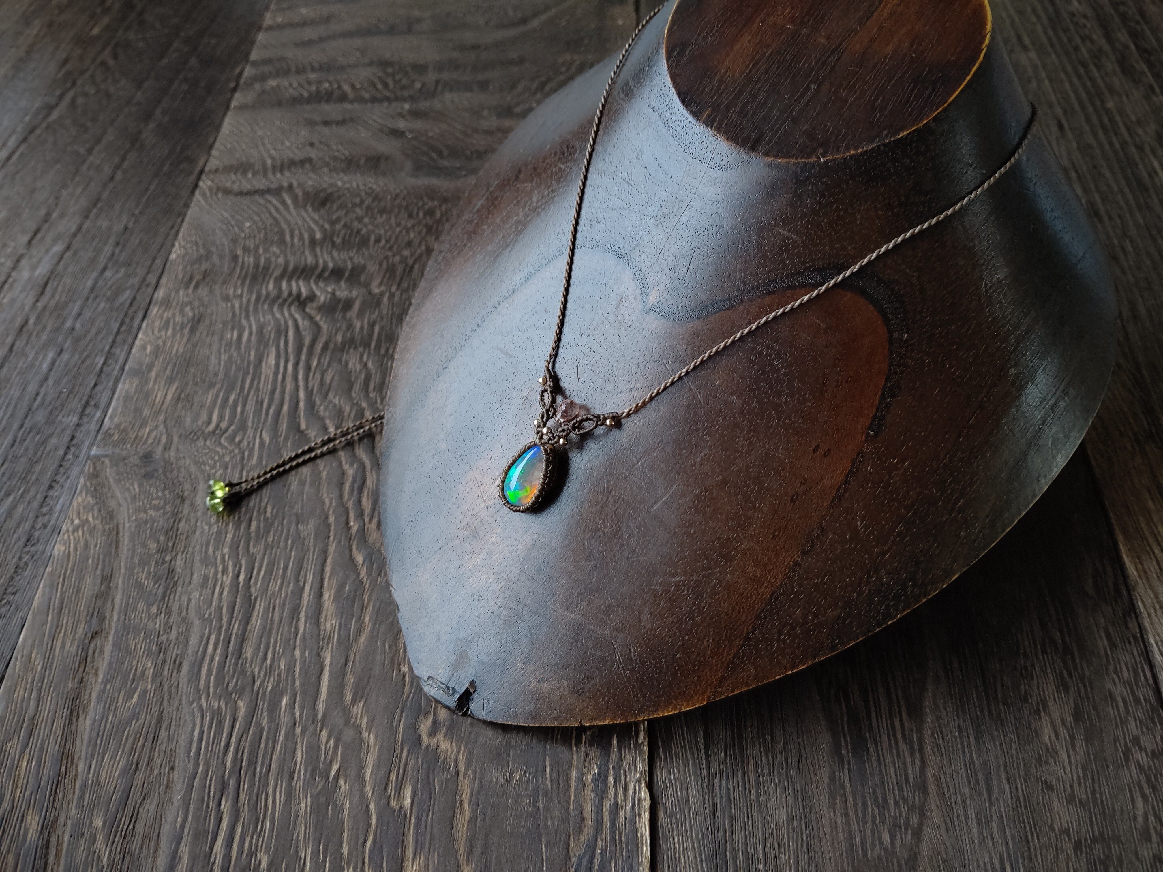 虹の雫を閉じ込めたような、美しい遊色がご覧いただける大きめのエチオピア産オパールをペンダントに仕立てました。
