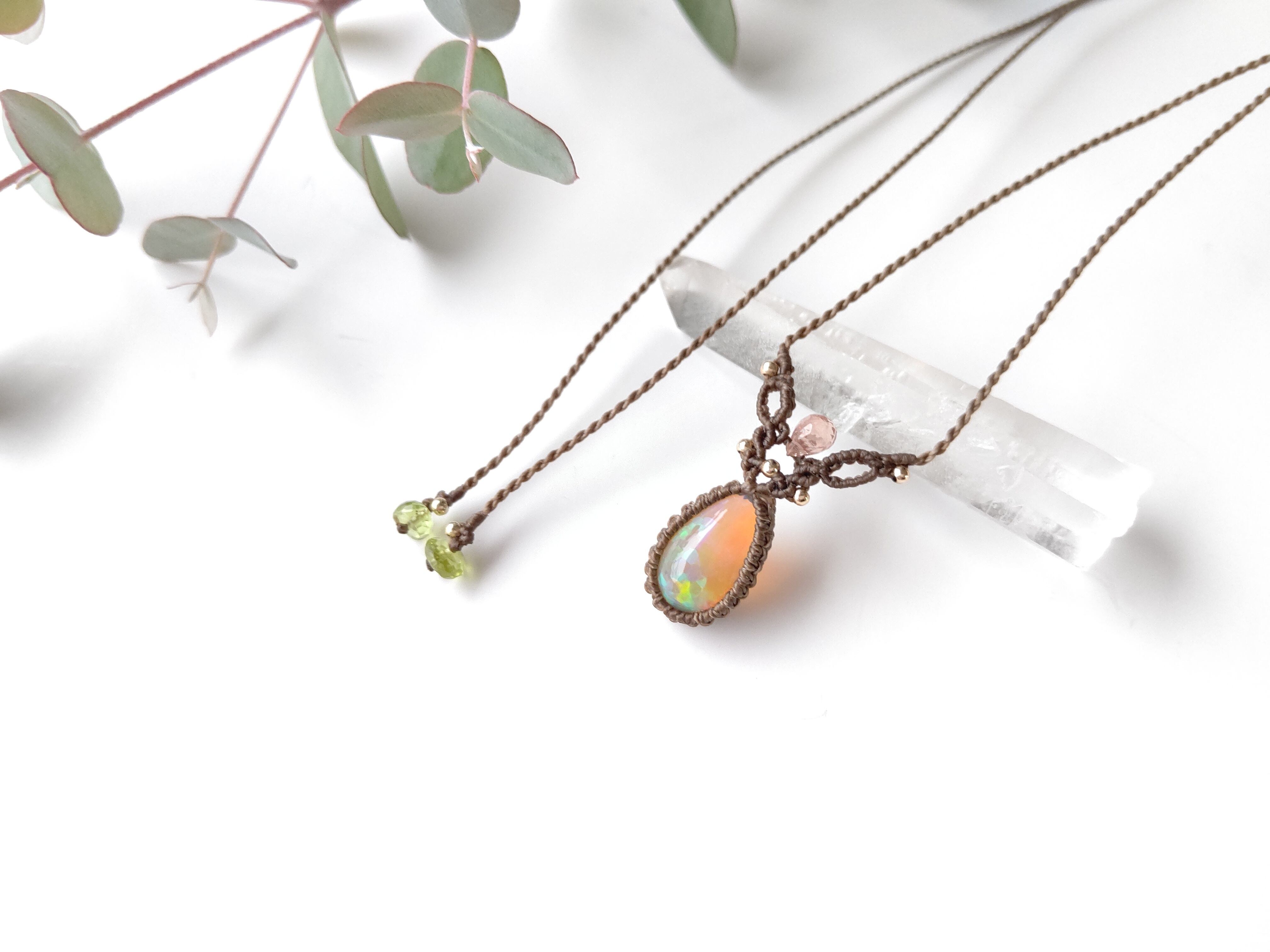 ペンダントには宝石質のピンクトルマリンをワンポイントにあしらい、オパールの美しさをたくさんお楽しみいただけるように、マクラメらしいデザインでしっかりと編み上げております。