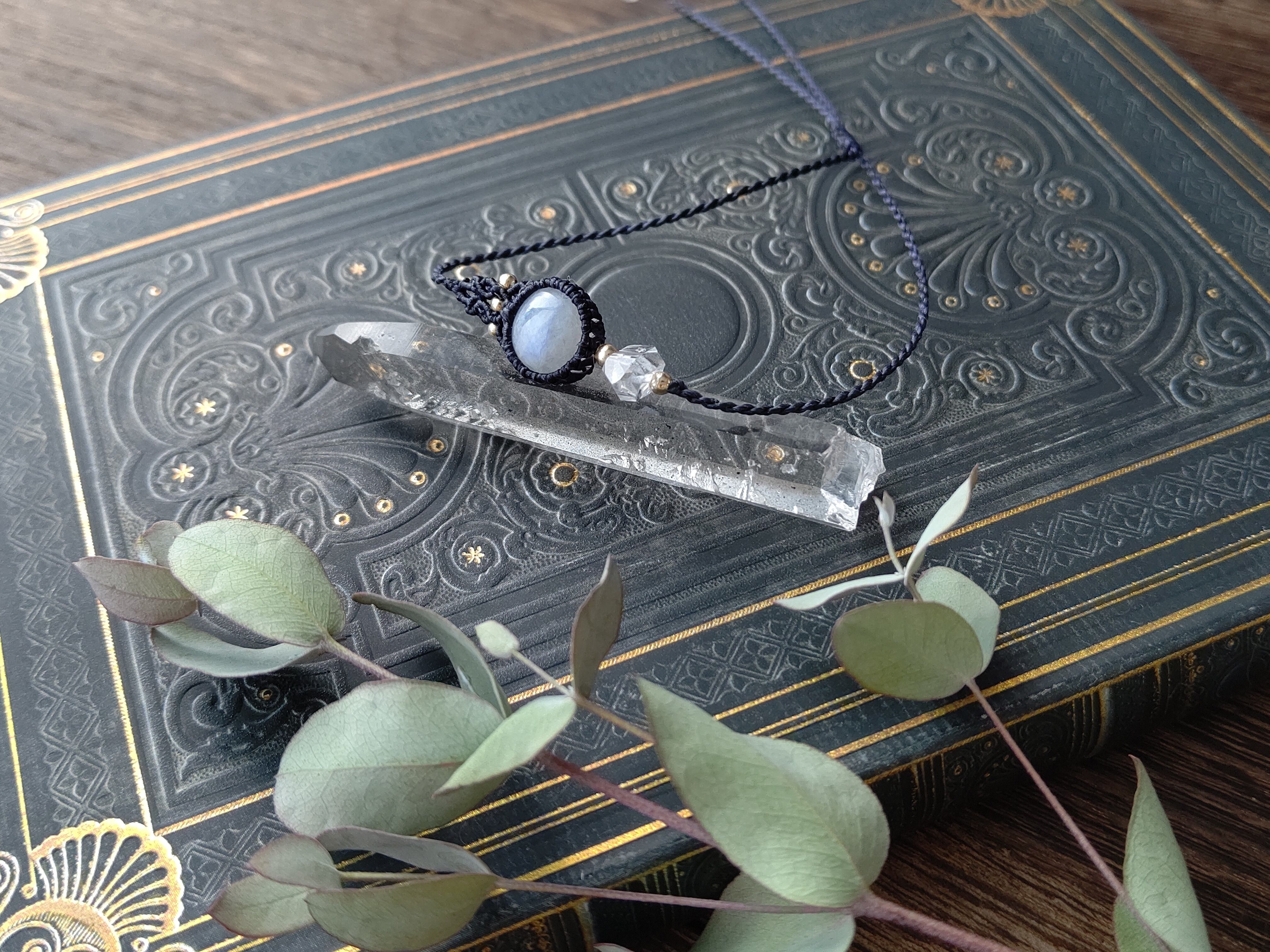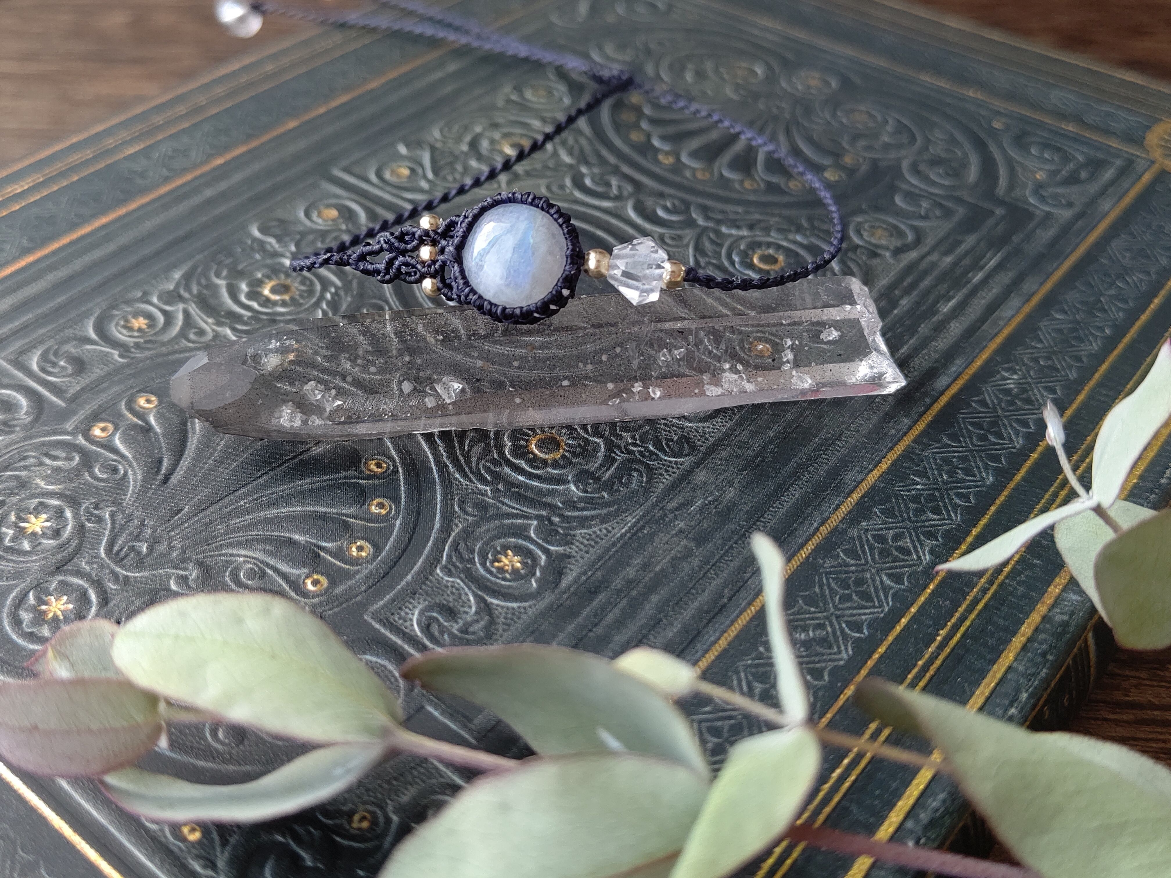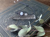 ホワイトラブラドライトは淡いブルーのシラーがうっすらとご覧いただける、ころんとかわいらしいルースです。ハーキマーダイヤモンドは両錐の美しい透明感のある結晶です。