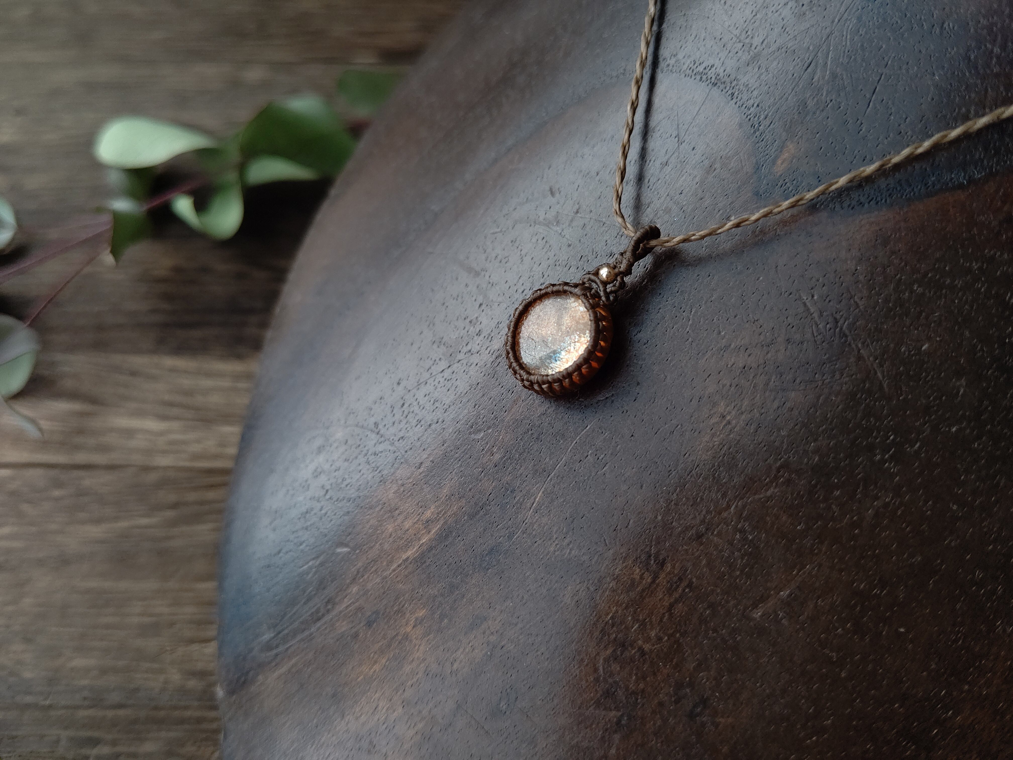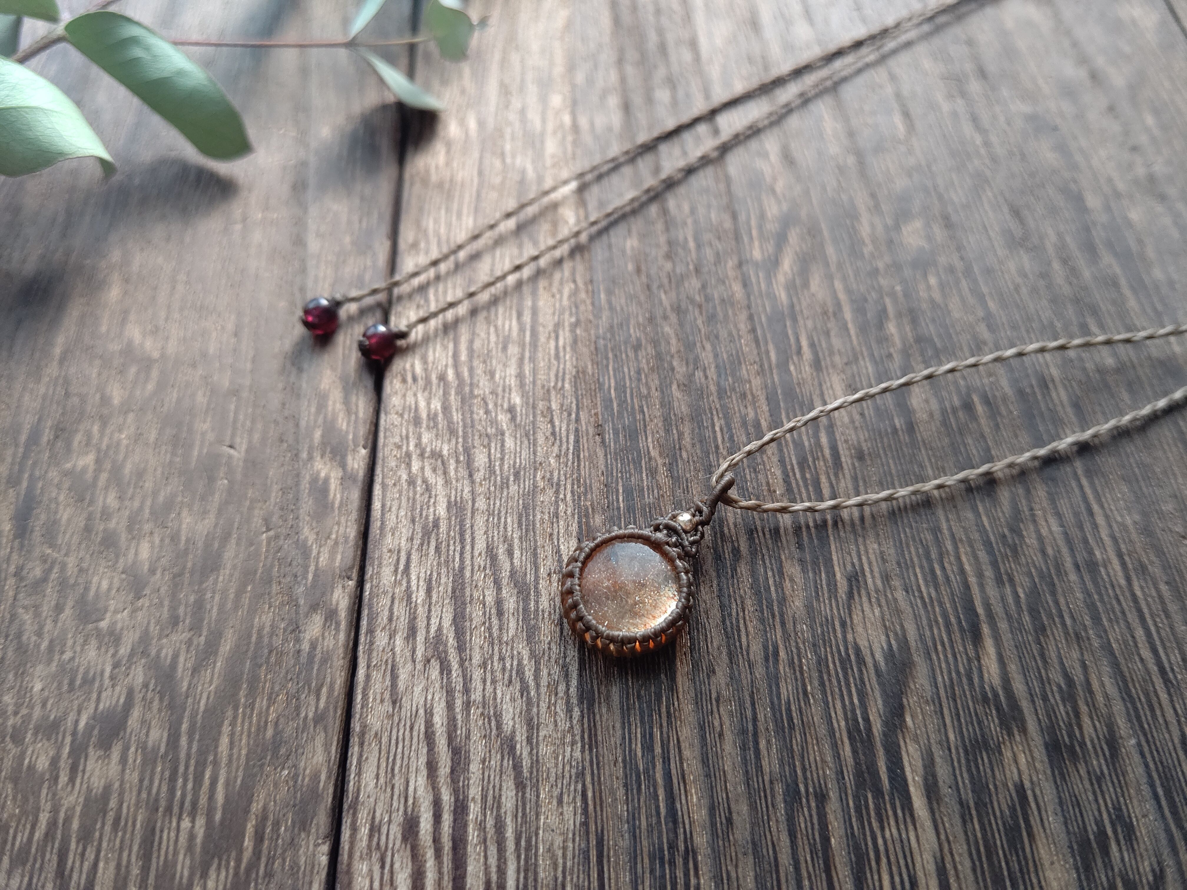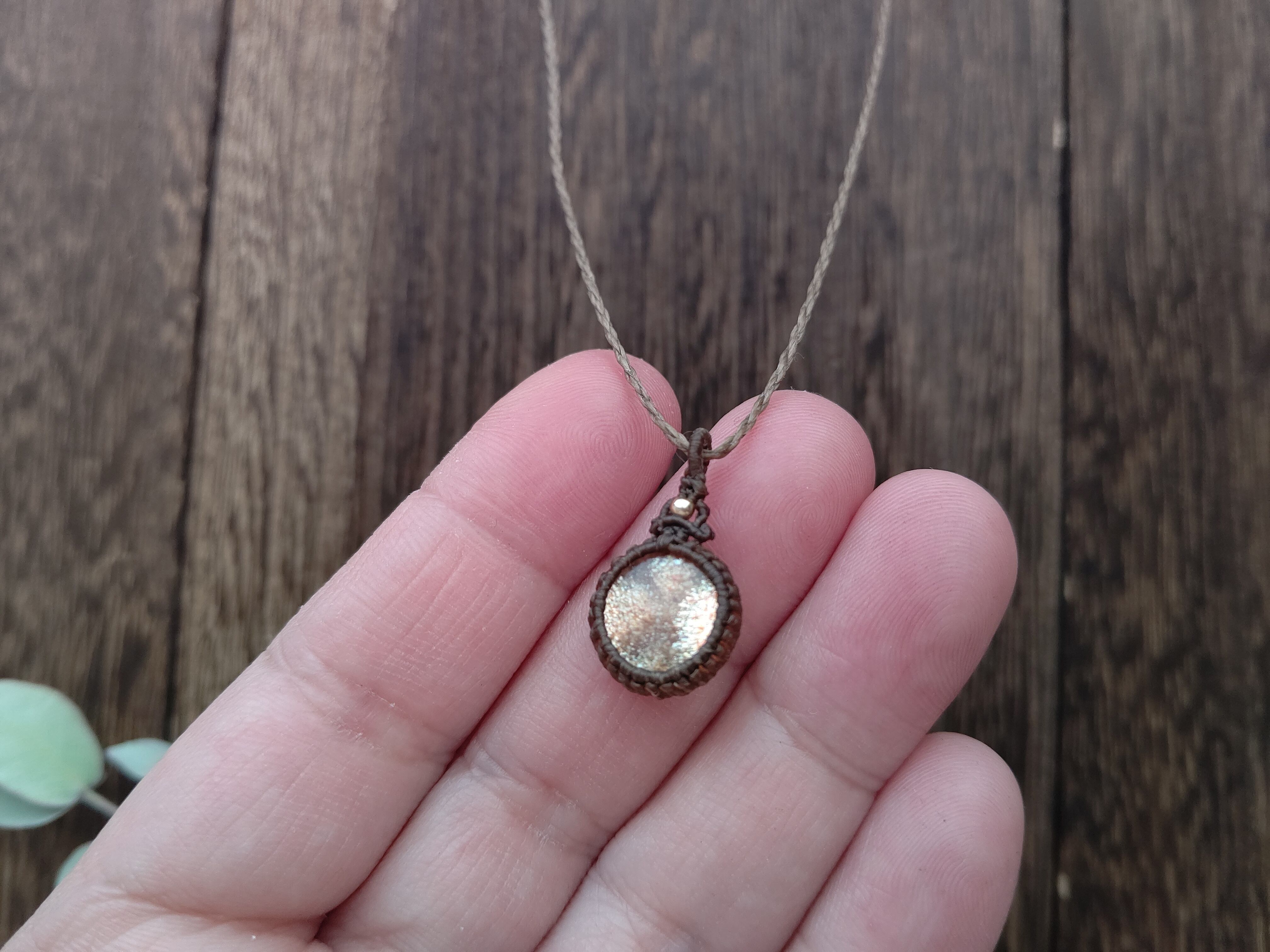 小さな金貨のようなサンストーンでマクラメらしい編み込みのカジュアルなペンダントを製作しました。