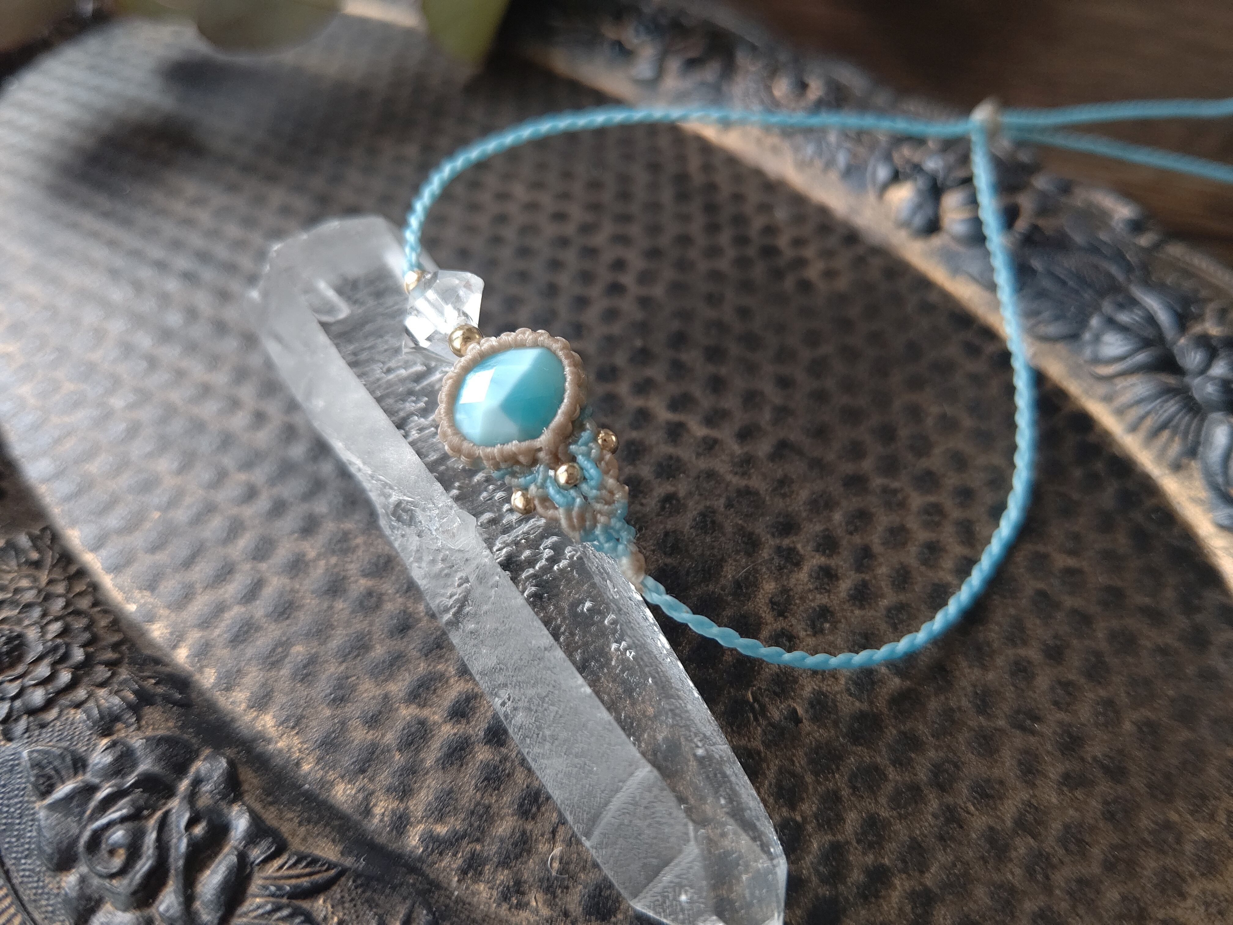 ハーキマーダイヤモンドの原石とラリマー(ブルーペクトライト)を組み合わせスッキリとした細身のデザインのアシンメトリーブレスレットを製作しました。