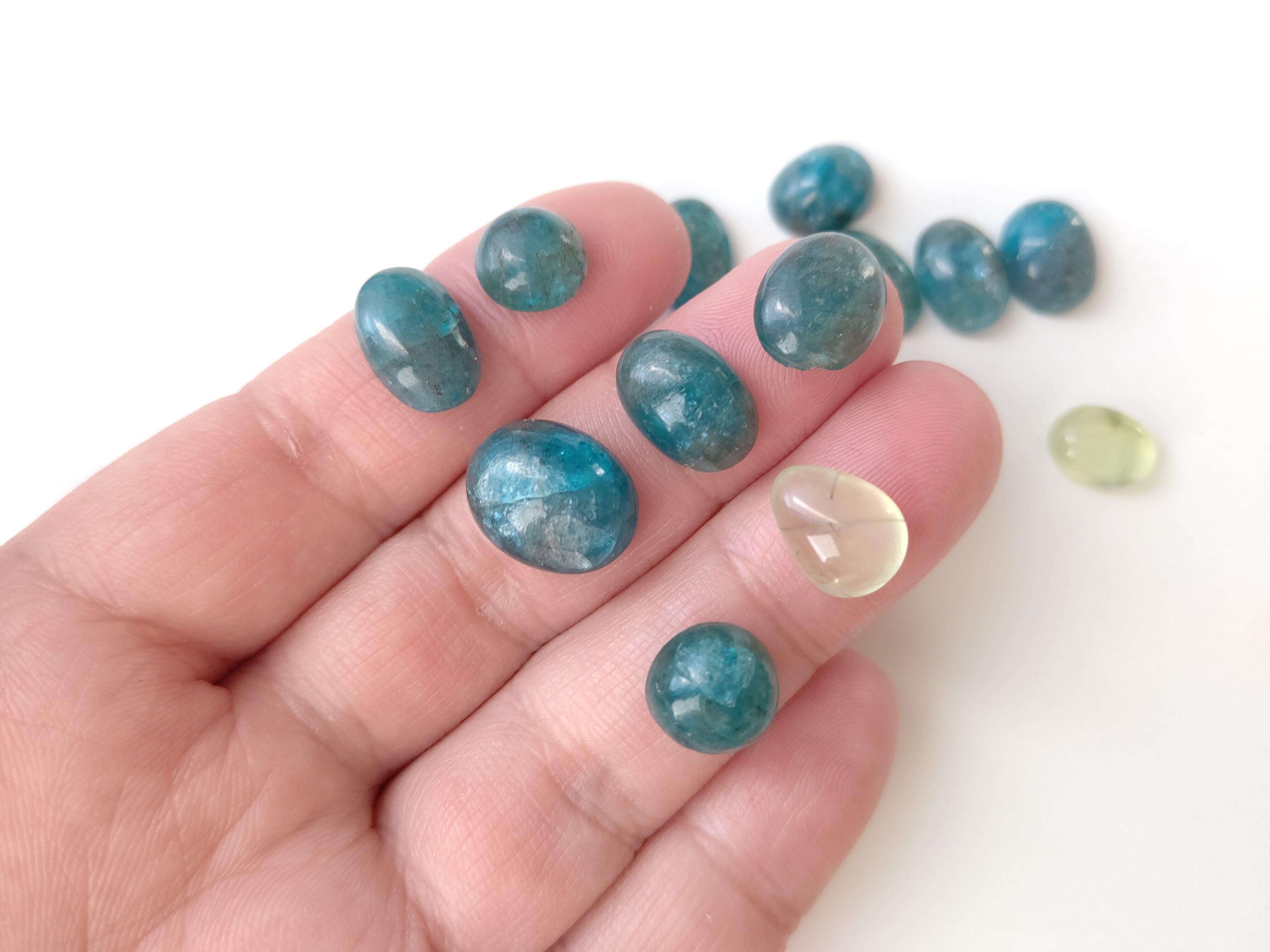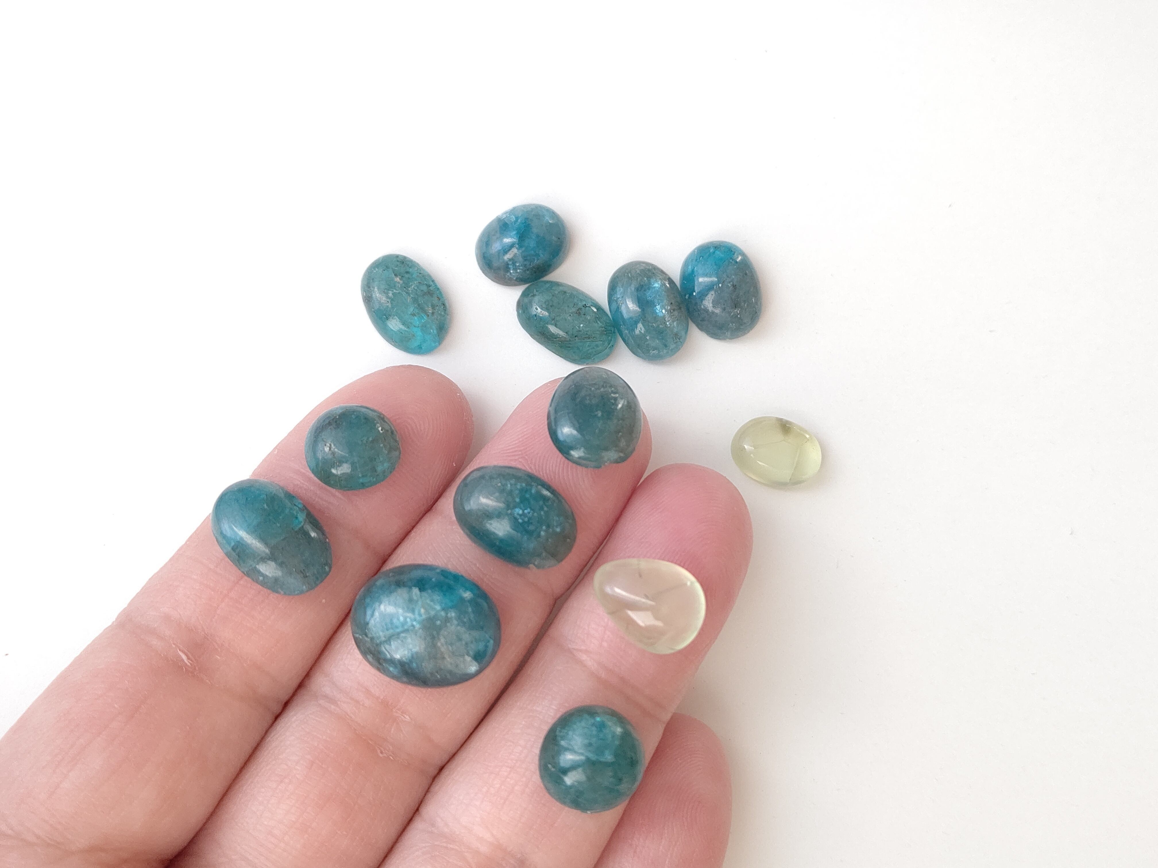 ブルーアパタイトとプレナイトのルースセットです。欠けやクラック、インクルージョンを含みます。
