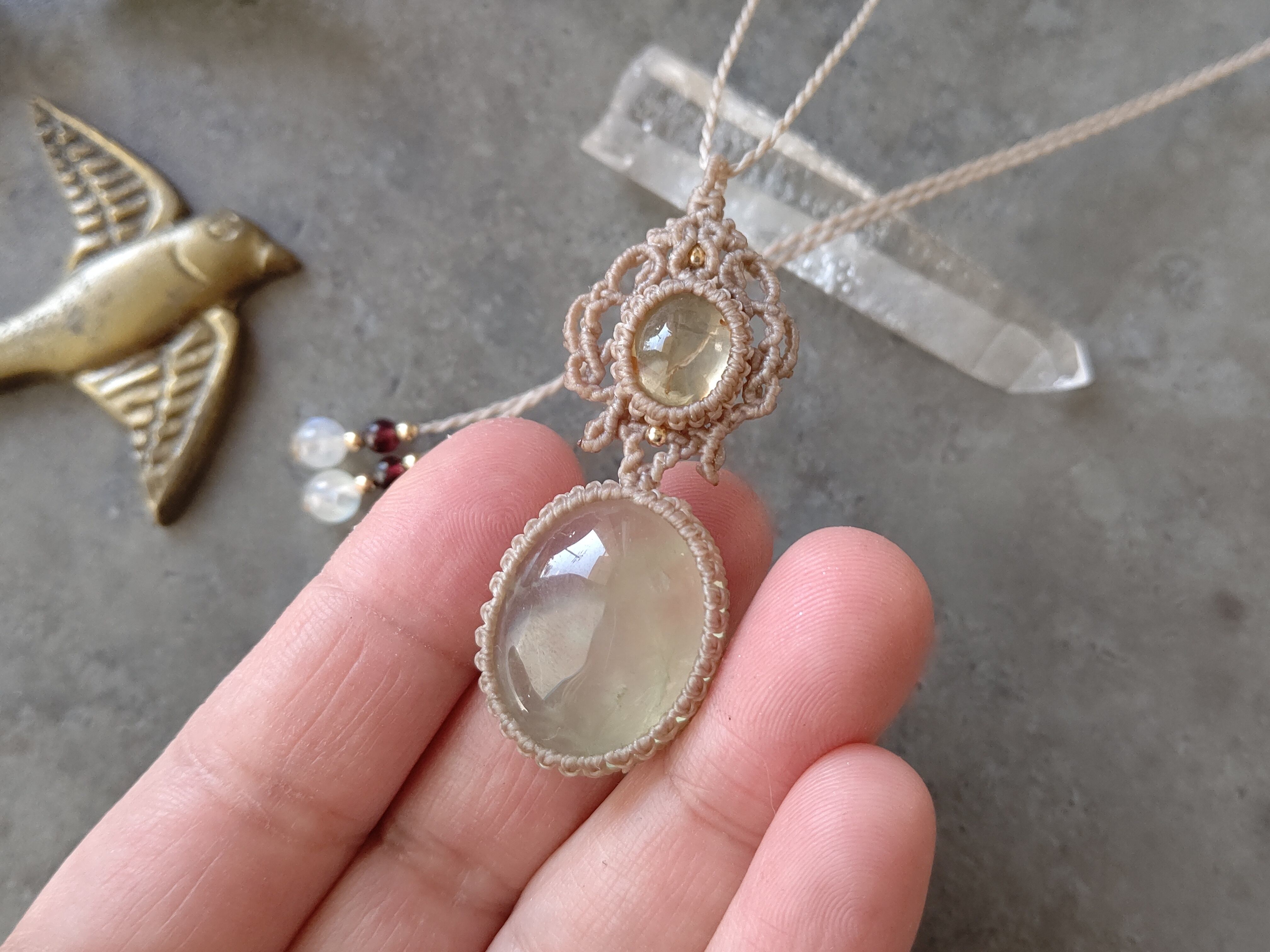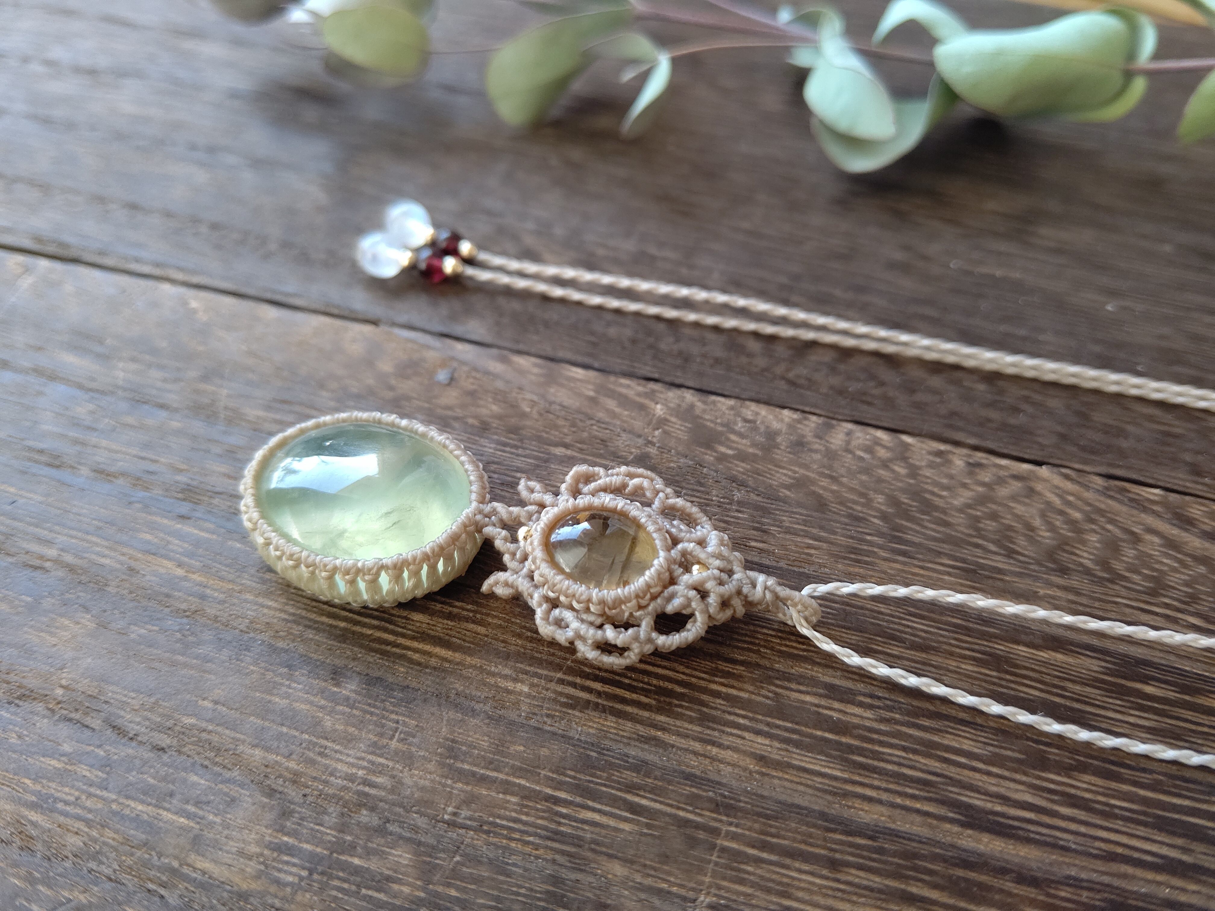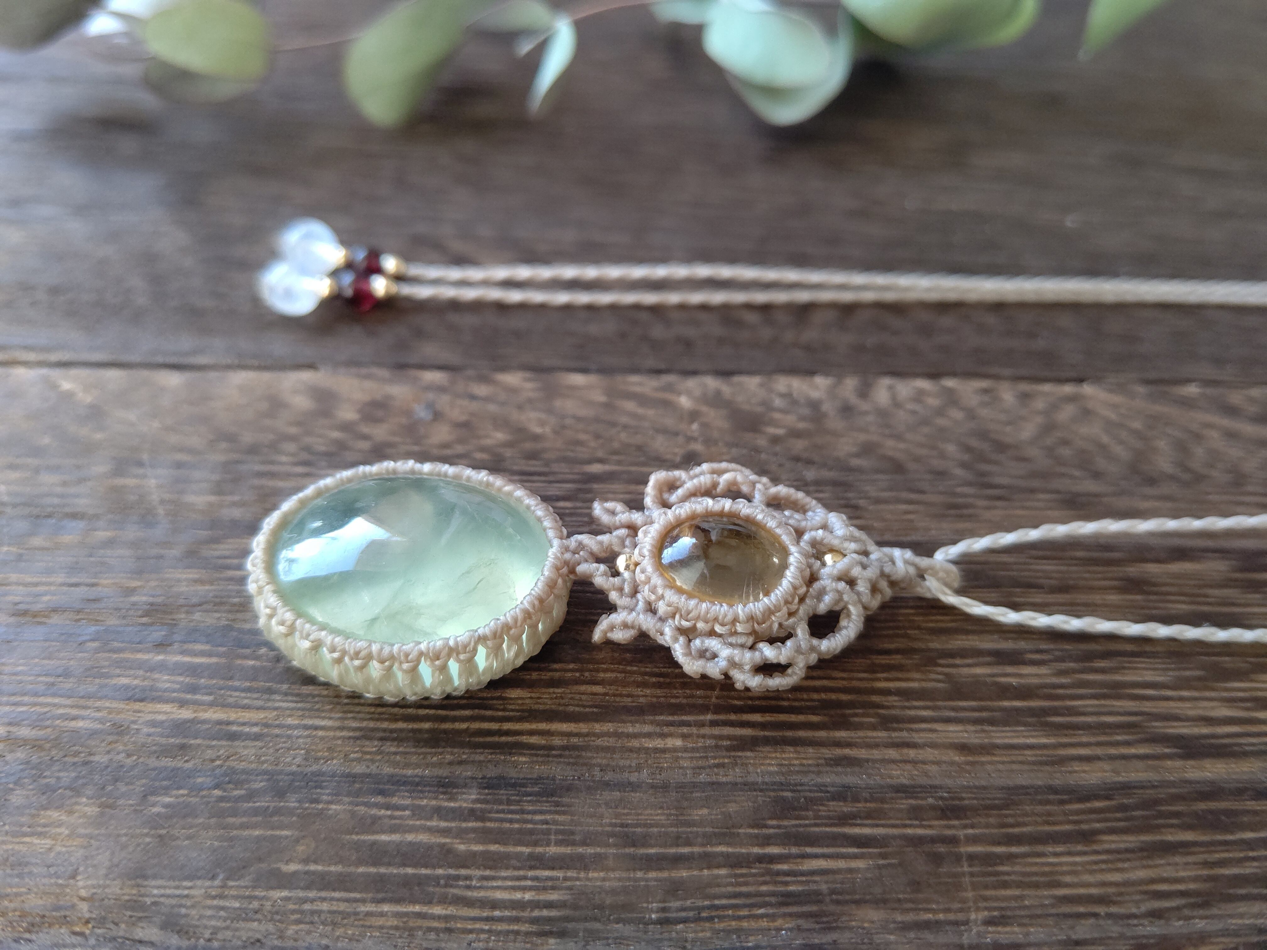 大粒のプレナイトとシトリンでマクラメらしい編み込みのカジュアルなペンダントを製作しました。