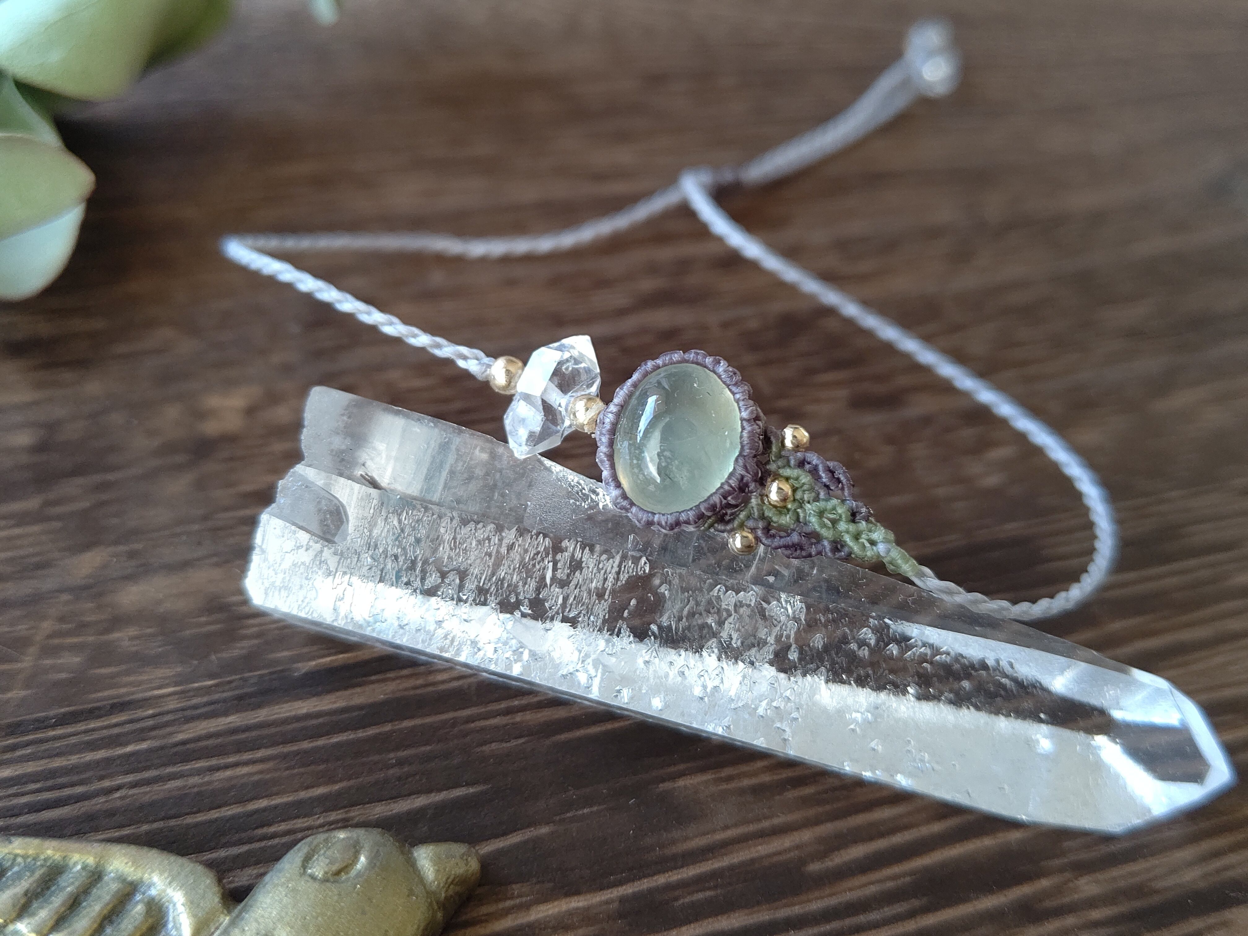 プレナイトは優しい若草のような色合いで、宝石質に近いクオリティのためインクルージョンはございますが、光沢が美しいルースを選びました。ハーキマーダイヤモンドは両錐の美しい透明感のある結晶です。
