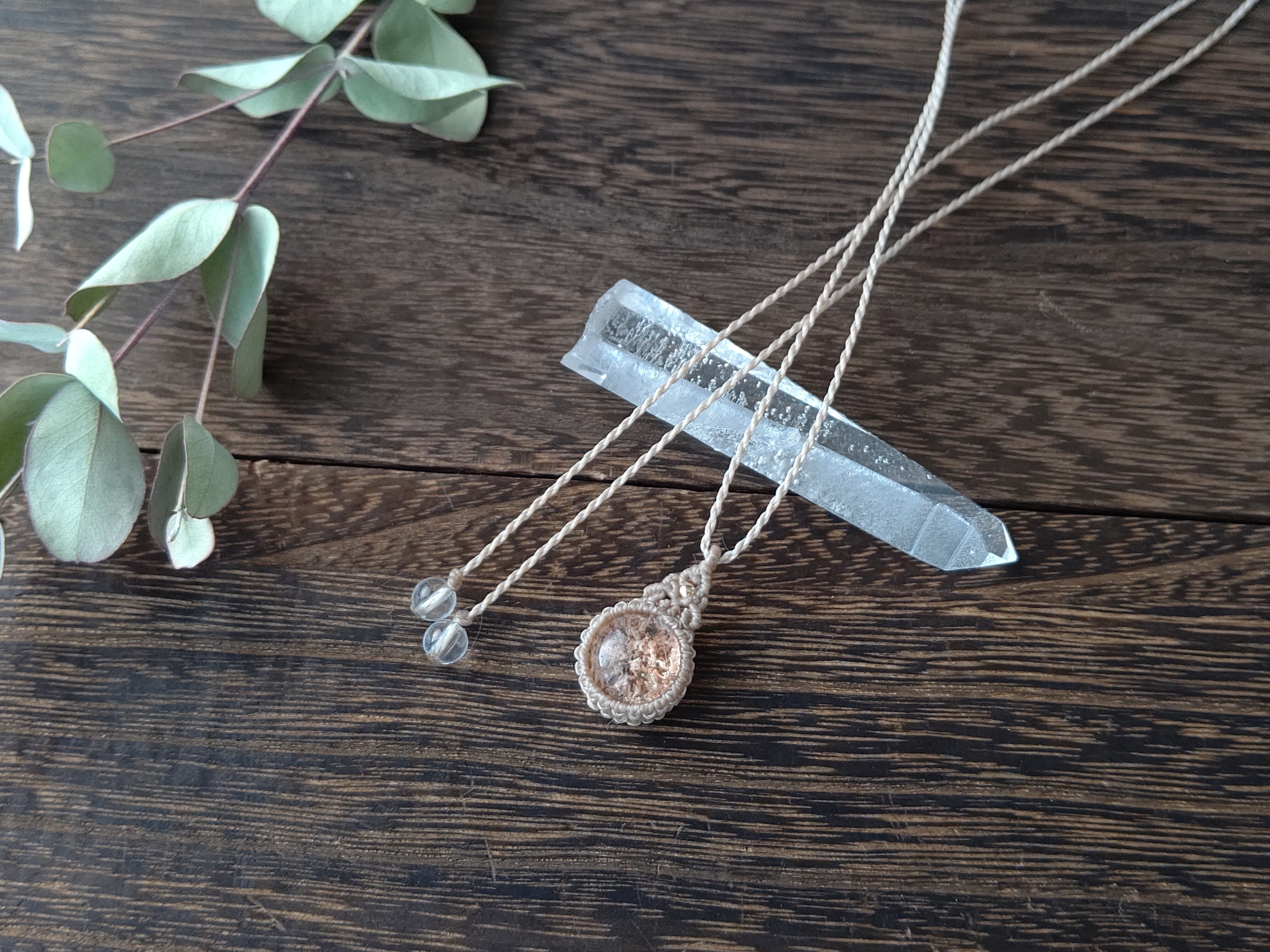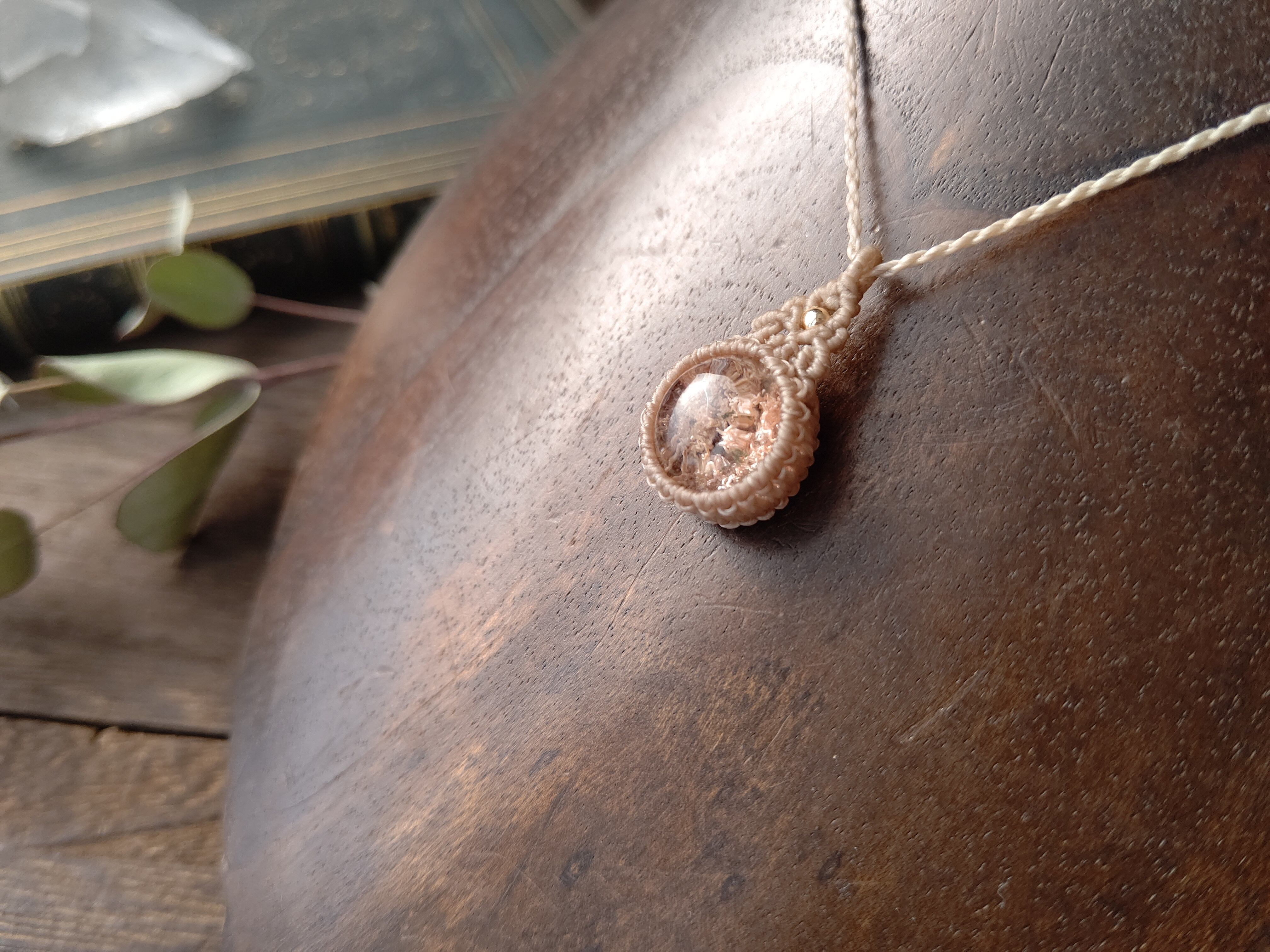 ふんわりとした梅色のような内包物のあるガーデンクォーツでシンプルな編み込みのカジュアルなペンダントを製作しました。