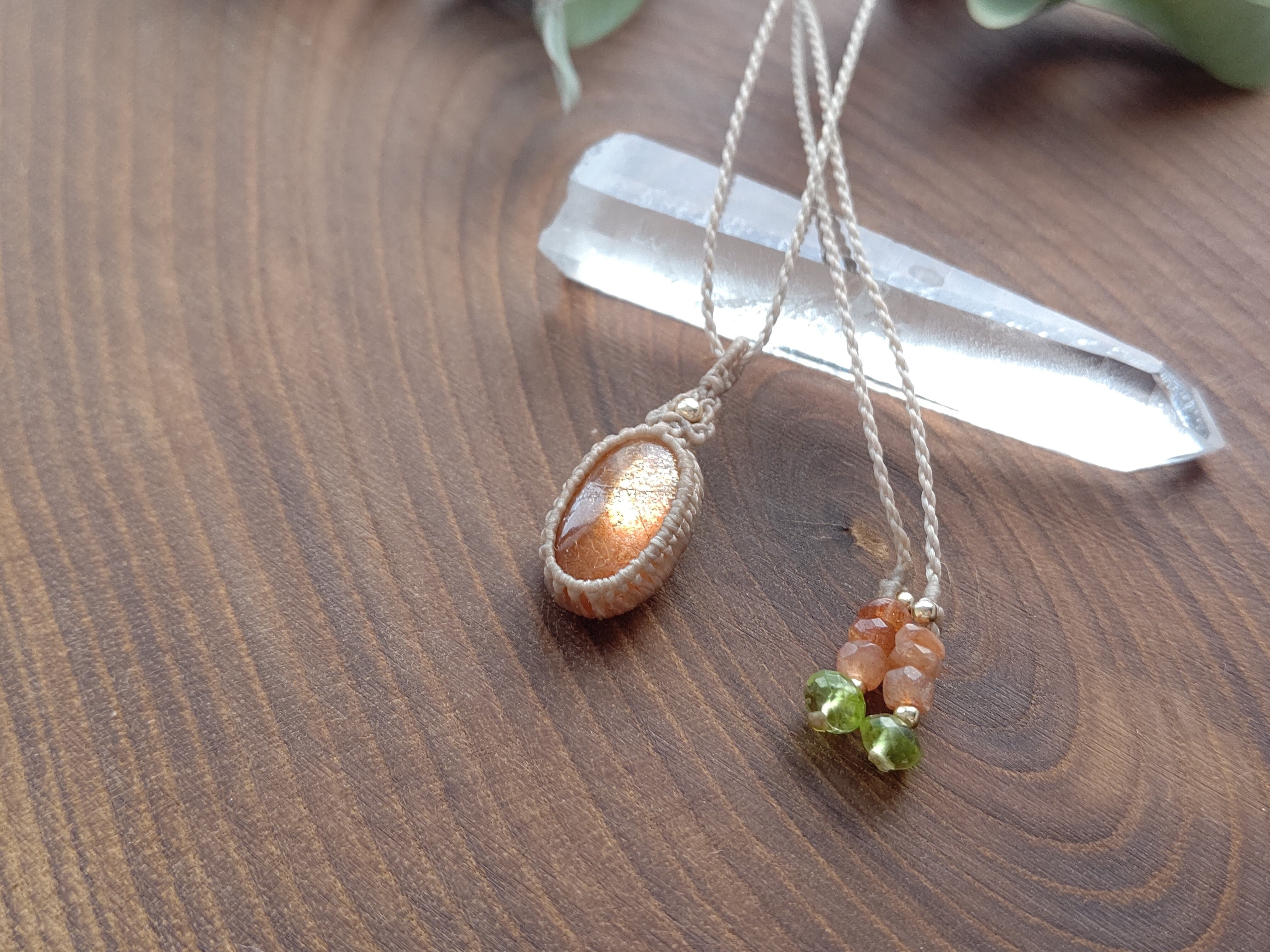 滑らかな金色と虹色の美しい光が走るサンストーンでマクラメらしい編み込みのシンプルなペンダントを製作しました。