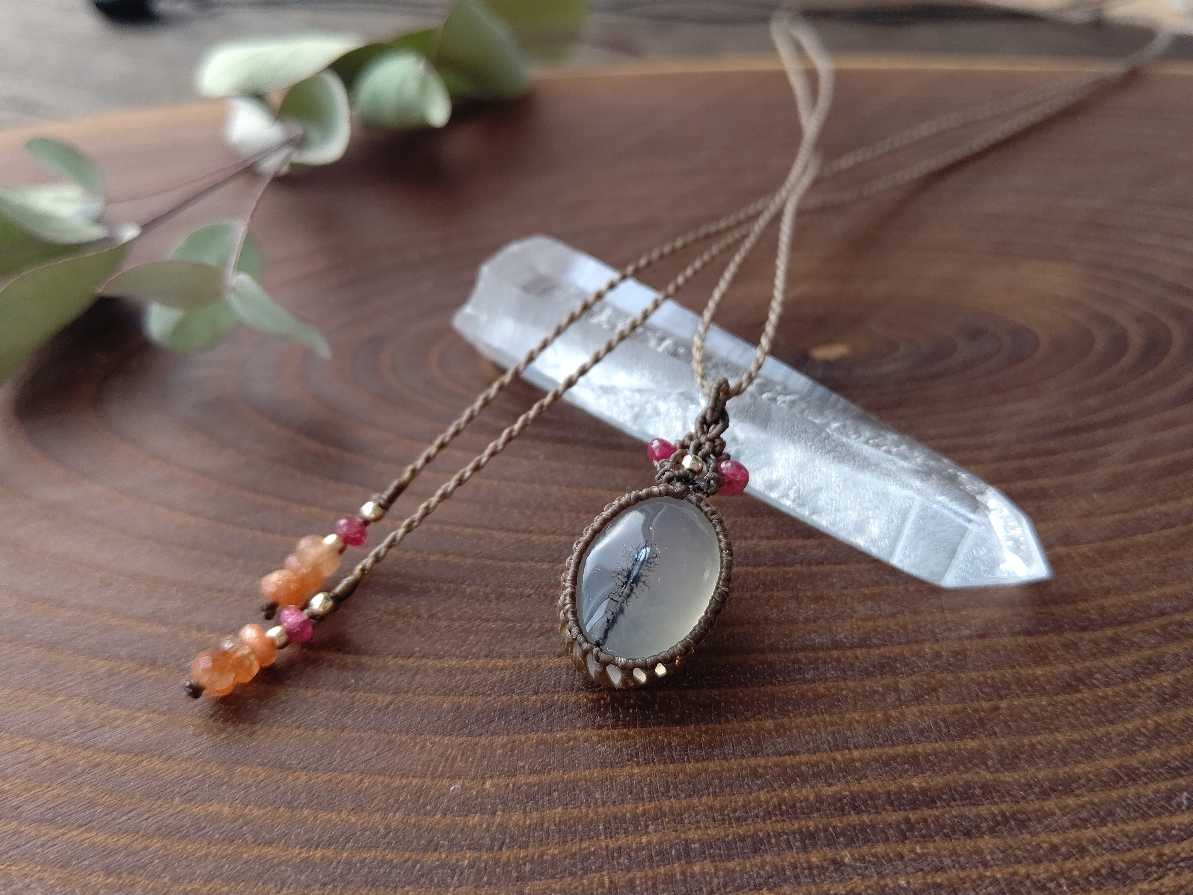 透明感のある乳白色のアゲートにまっすぐ伸びる樹木のような模様のデンドライトアゲートでマクラメらしい編み込みのシンプルなペンダントを製作しました。