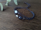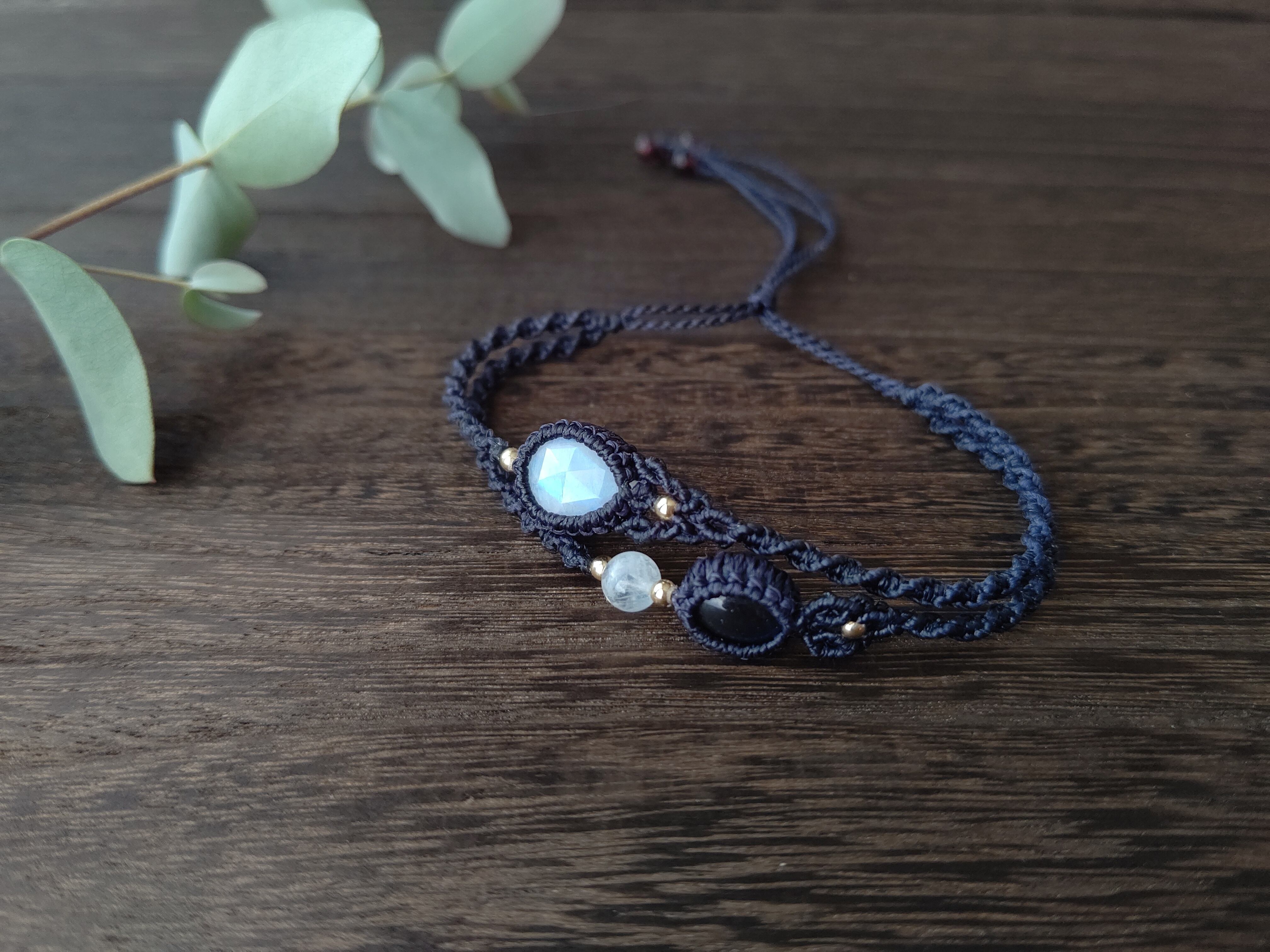 糸色はダークネイビーでブルーブラックラブラドライトの方にアクセントとしてレインボームーンストーンのビーズをひと粒あしらっています。レインボームーンストーンはローズカットが施されたルースで、角度によってブルーの淡いシラーがご覧いただけます。