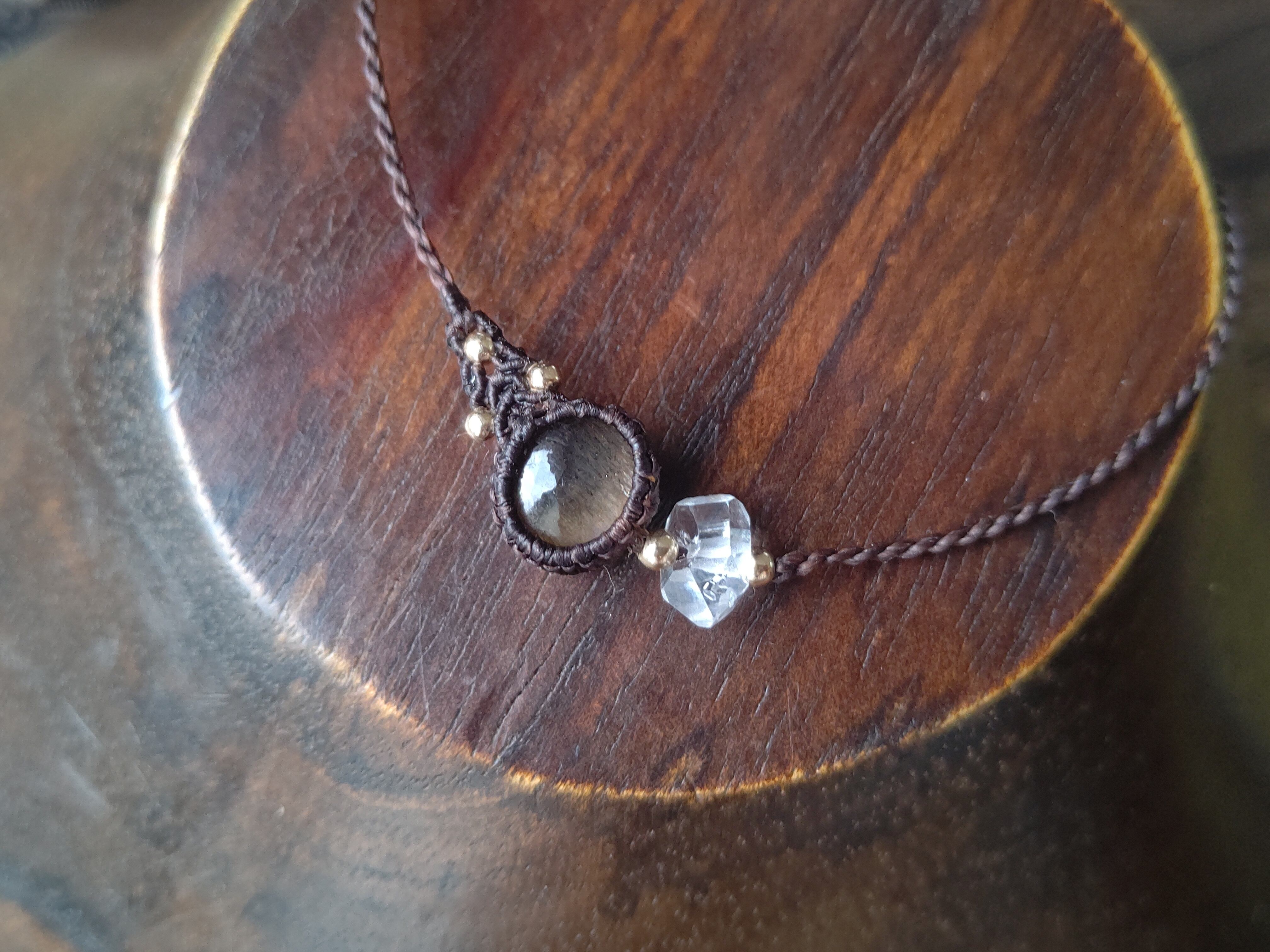 ブラックスターサンストーン×ハーキマーダイヤモンドのアシンメトリーブレスレット (糸:ダークチョコレート)
