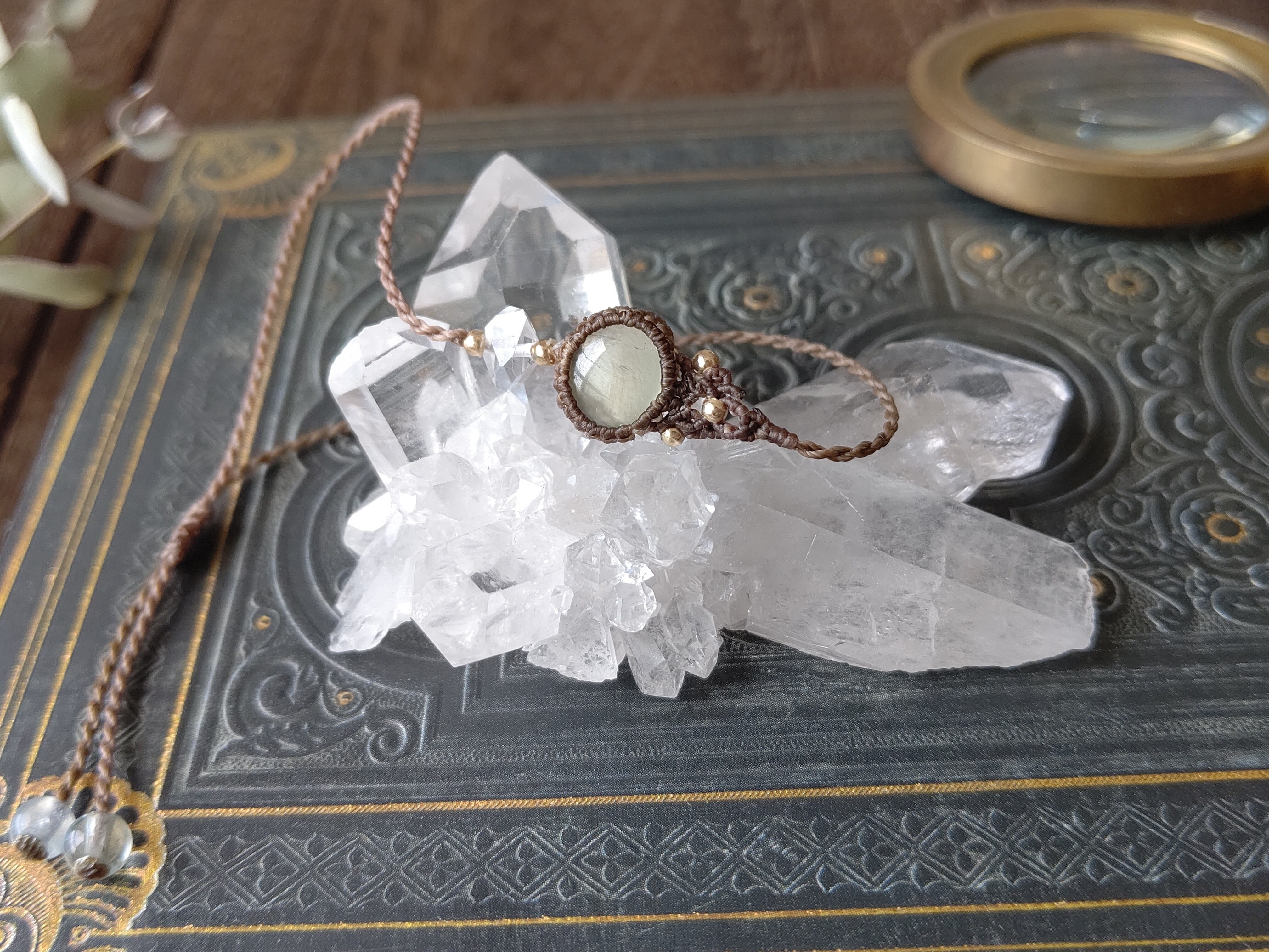 プレナイトは優しい若草のような色合いで、宝石質に近いクオリティで光沢が美しいルースを選びました。ハーキマーダイヤモンドは両錐の美しい透明感のある結晶です。