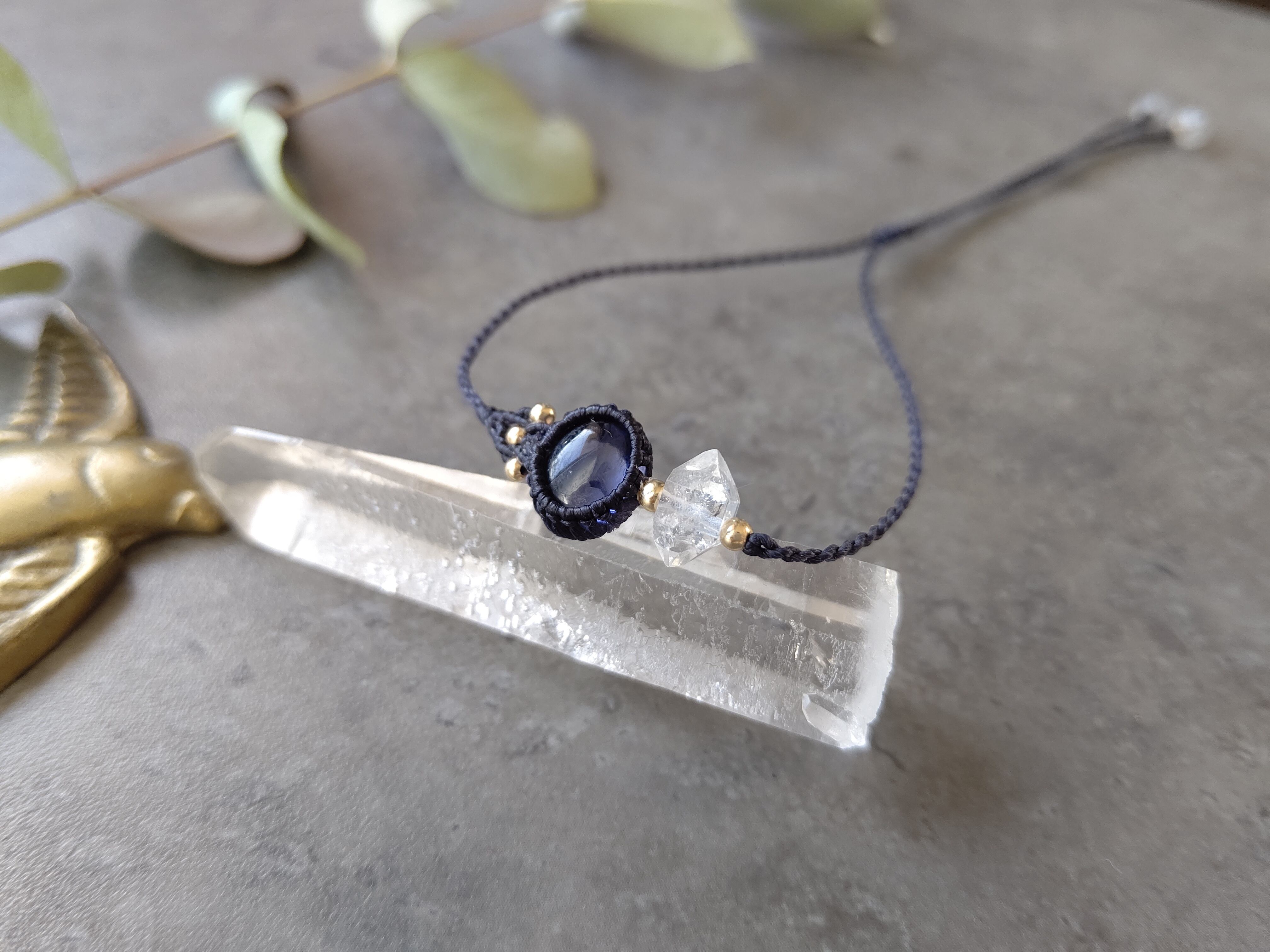 ハーキマーダイヤモンドの原石と宝石質のアイオライトを組み合わせスッキリとした細身のデザインのアシンメトリーブレスレットを製作しました。