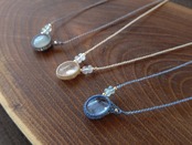 天使のはしご、と言われれているエンジェルラダークォーツをデコルテにフィットしやすいアシンメトリーデザインのネックレスに仕立てました。