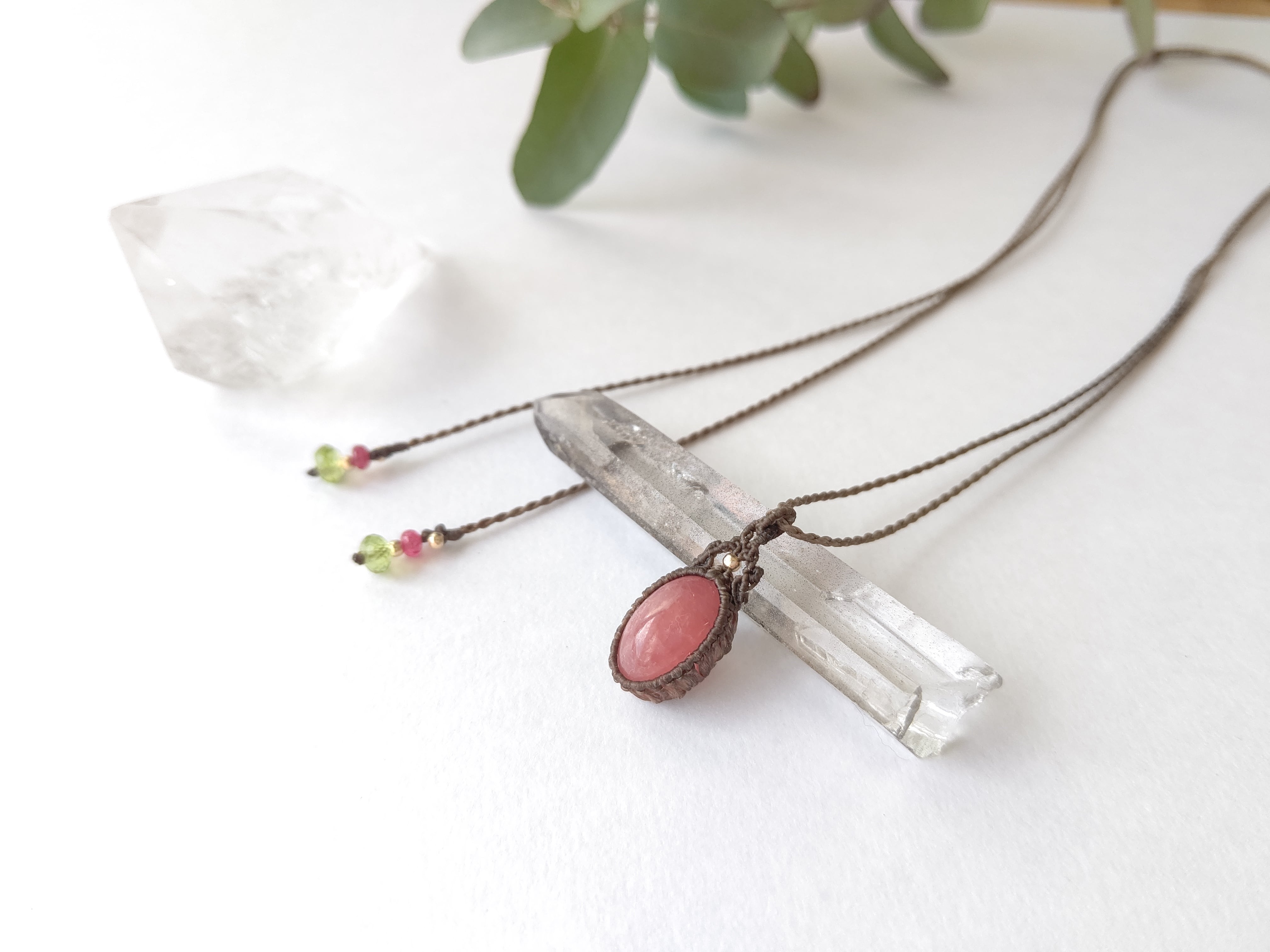 イチゴミルクをやや濃くしたようなガラス質の色合いや風合いを持つ、ハイクオリティのインカローズでシンプルな編み込みのカジュアルなペンダントを製作しました。