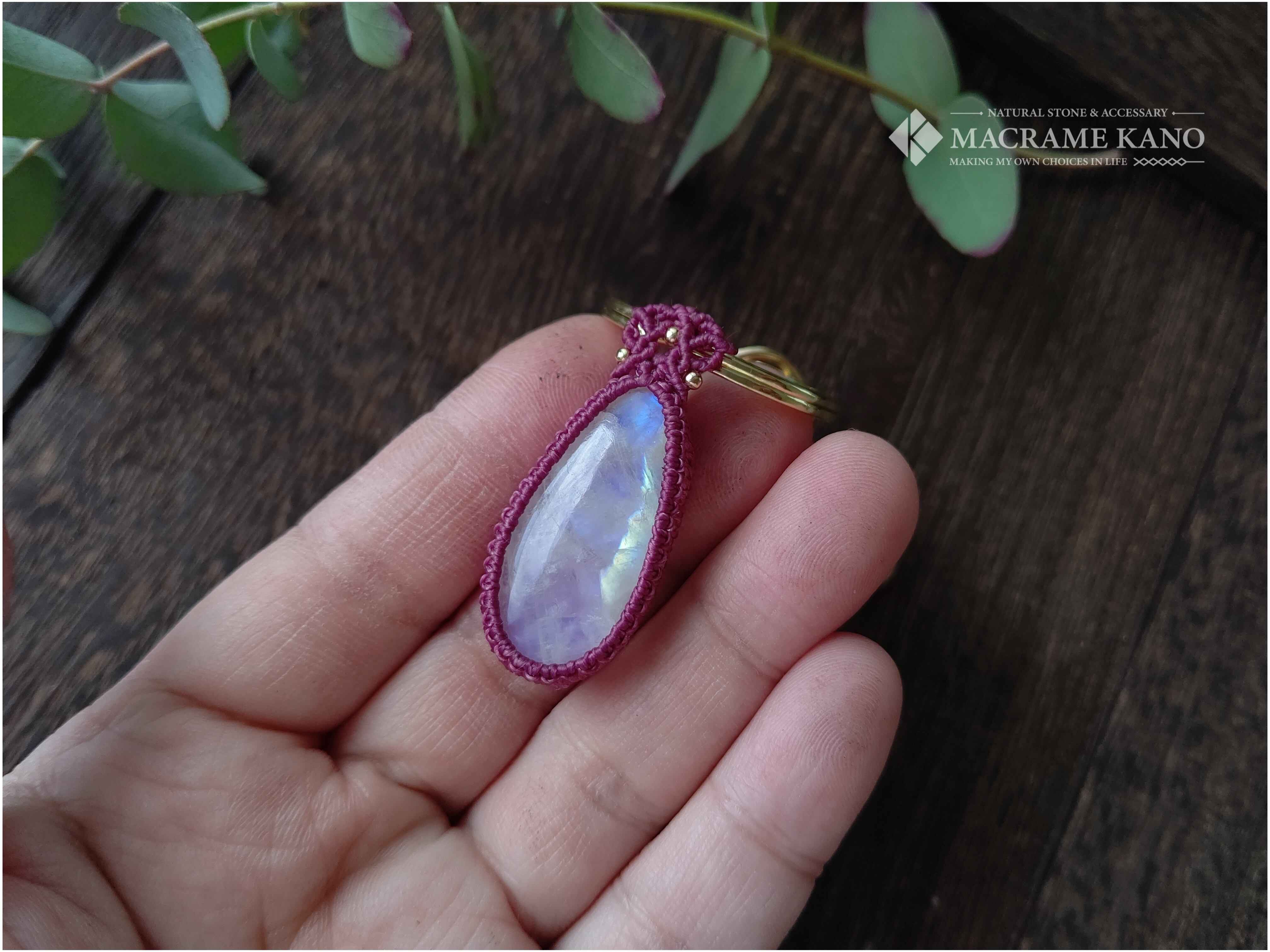 ペンダントにするには大きすぎ、着用の際首が凝ってしまうのでは・・・。と危惧をしてなかなか編むことができなかったルースですが、透明感とブルーノシラー、縁に見える虹色の輝きがとても美しい天然石です。