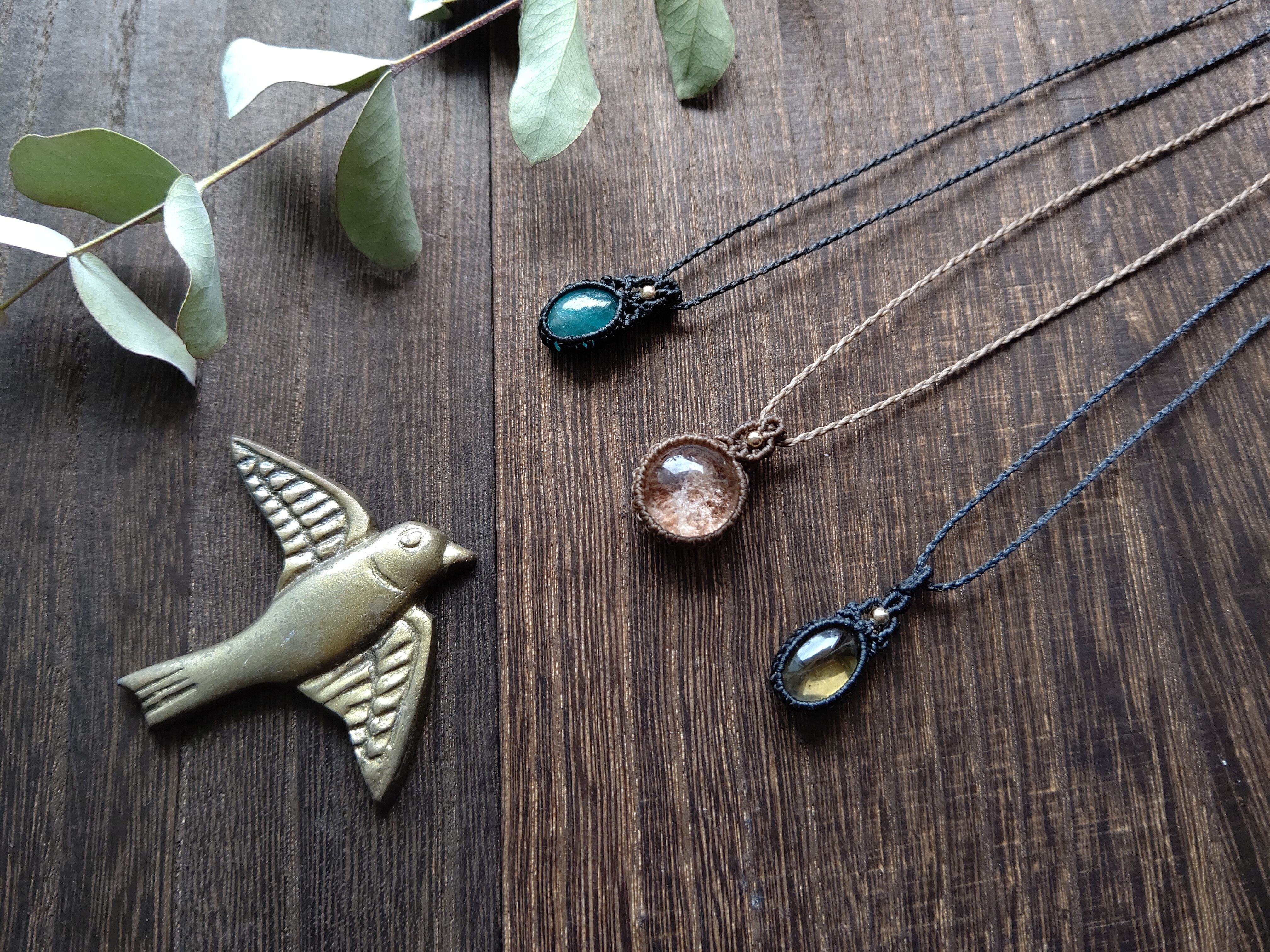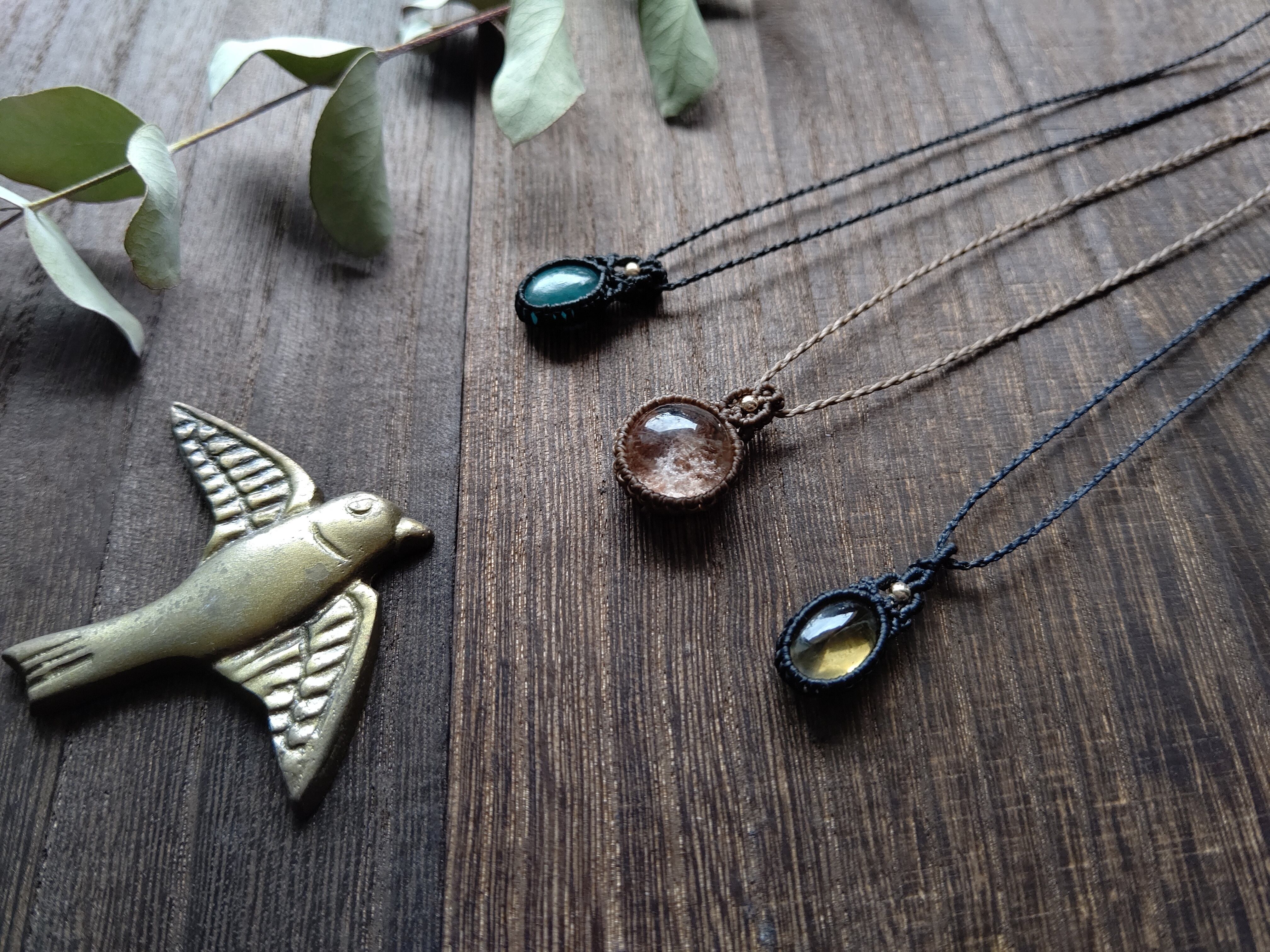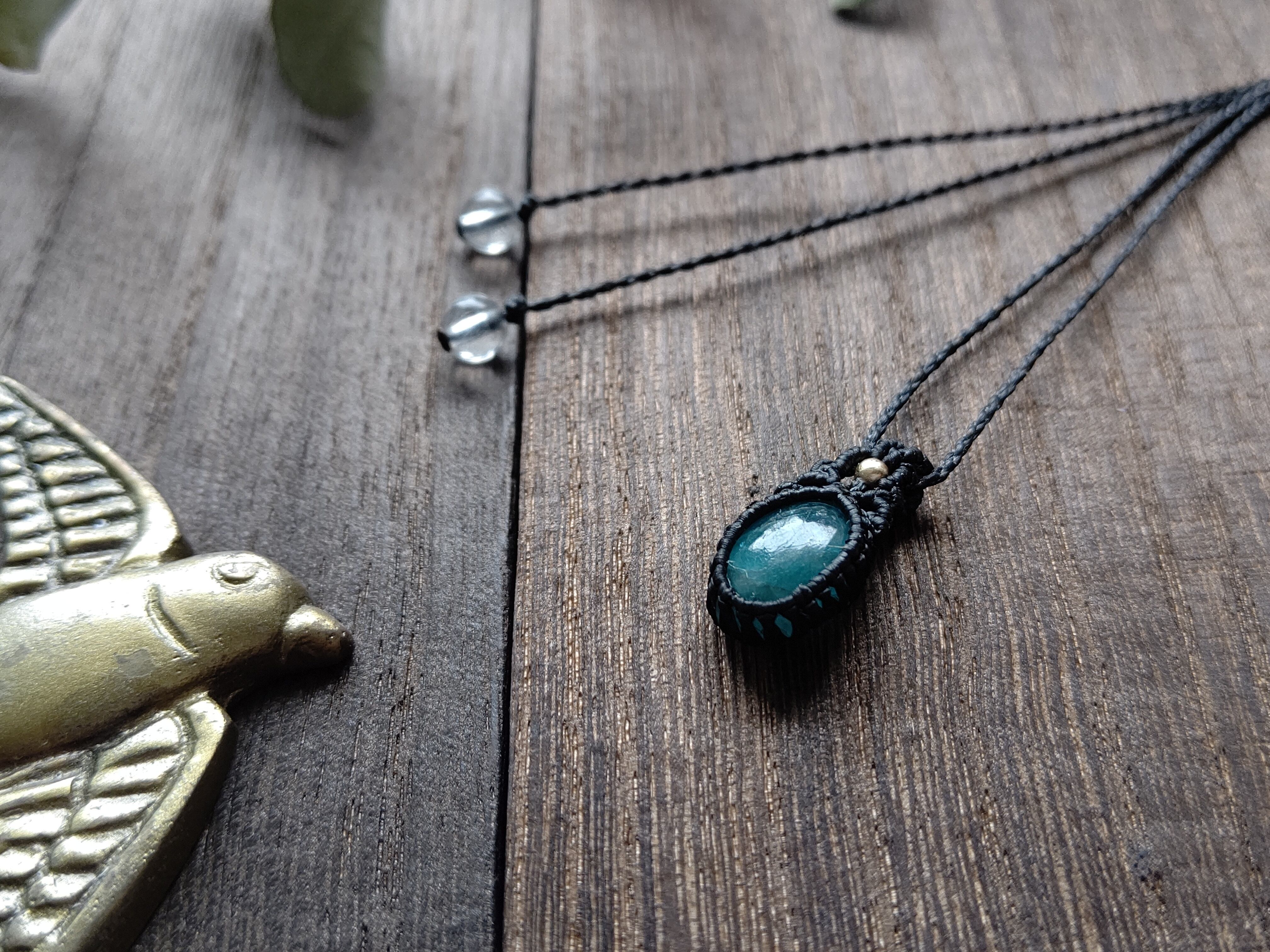 ブルーグリーンのアパタイトでシンプルな編み込みのカジュアルなペンダントを製作しました。
