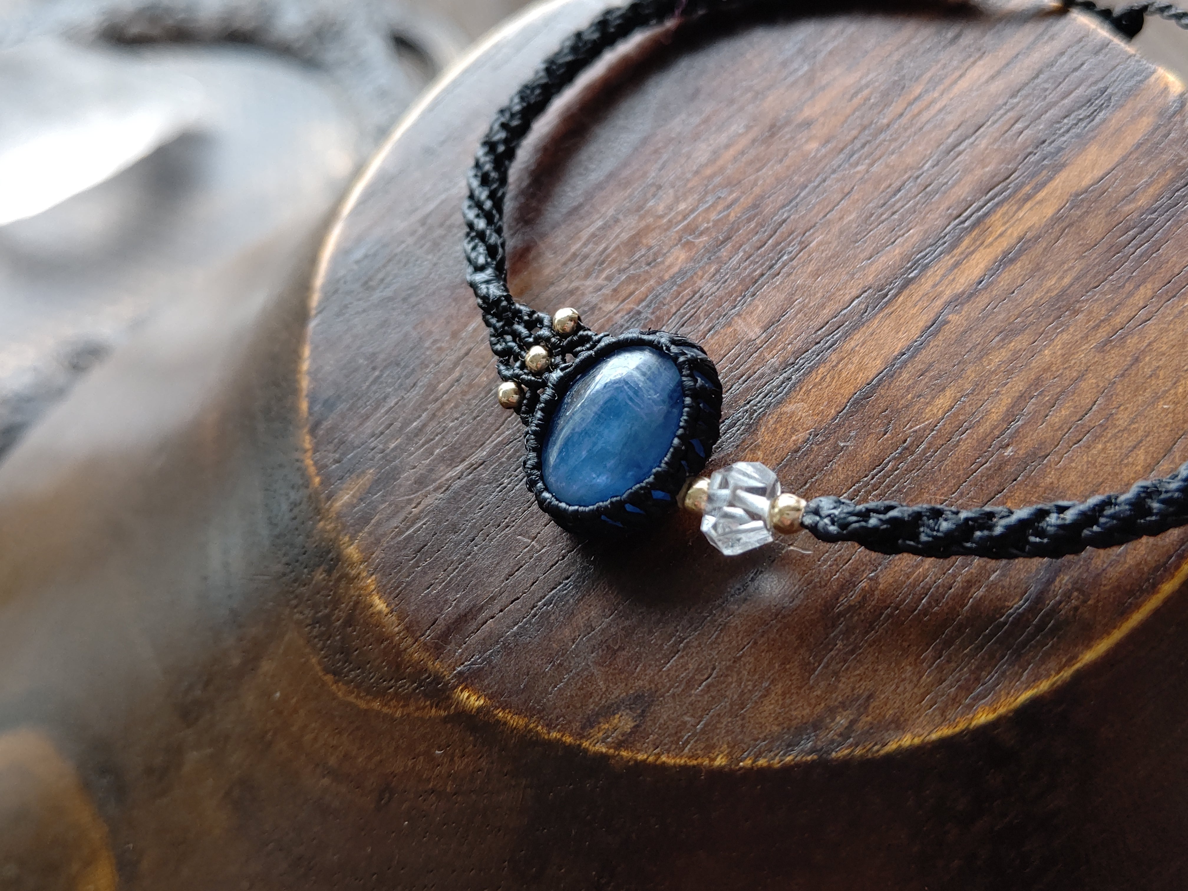 ブラジル産カイヤナイトとハーキマーダイヤモンドを組み合わせ手首にかっちり絡まるデザインのアシンメトリーブレスレットを製作しました。