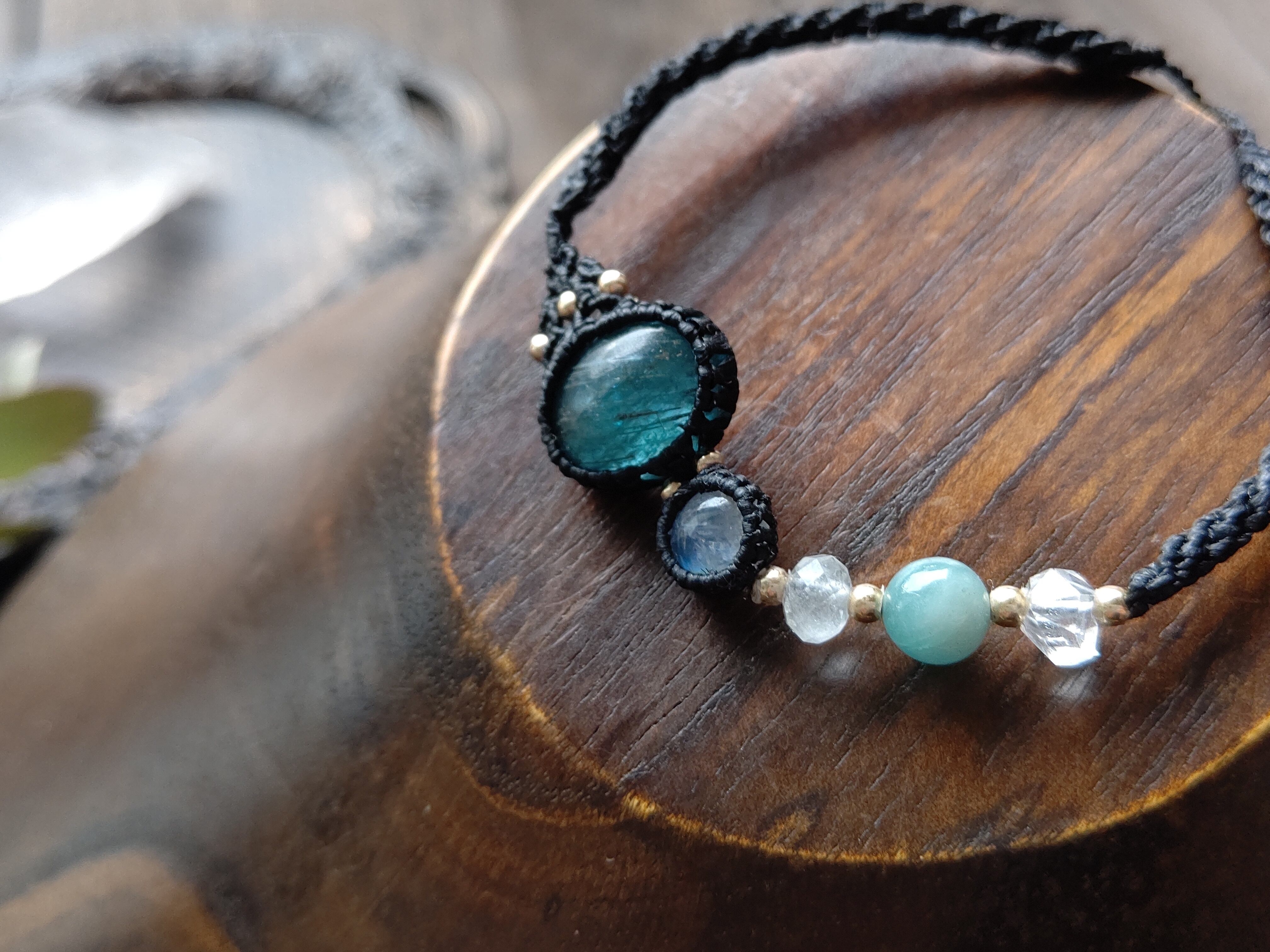 ブルーグリーンアパタイトとハーキマーダイヤモンド、レインボームーンストーンと天然石を組み合わせ手首にかっちり絡まるデザインのアシンメトリーブレスレットを製作しました。