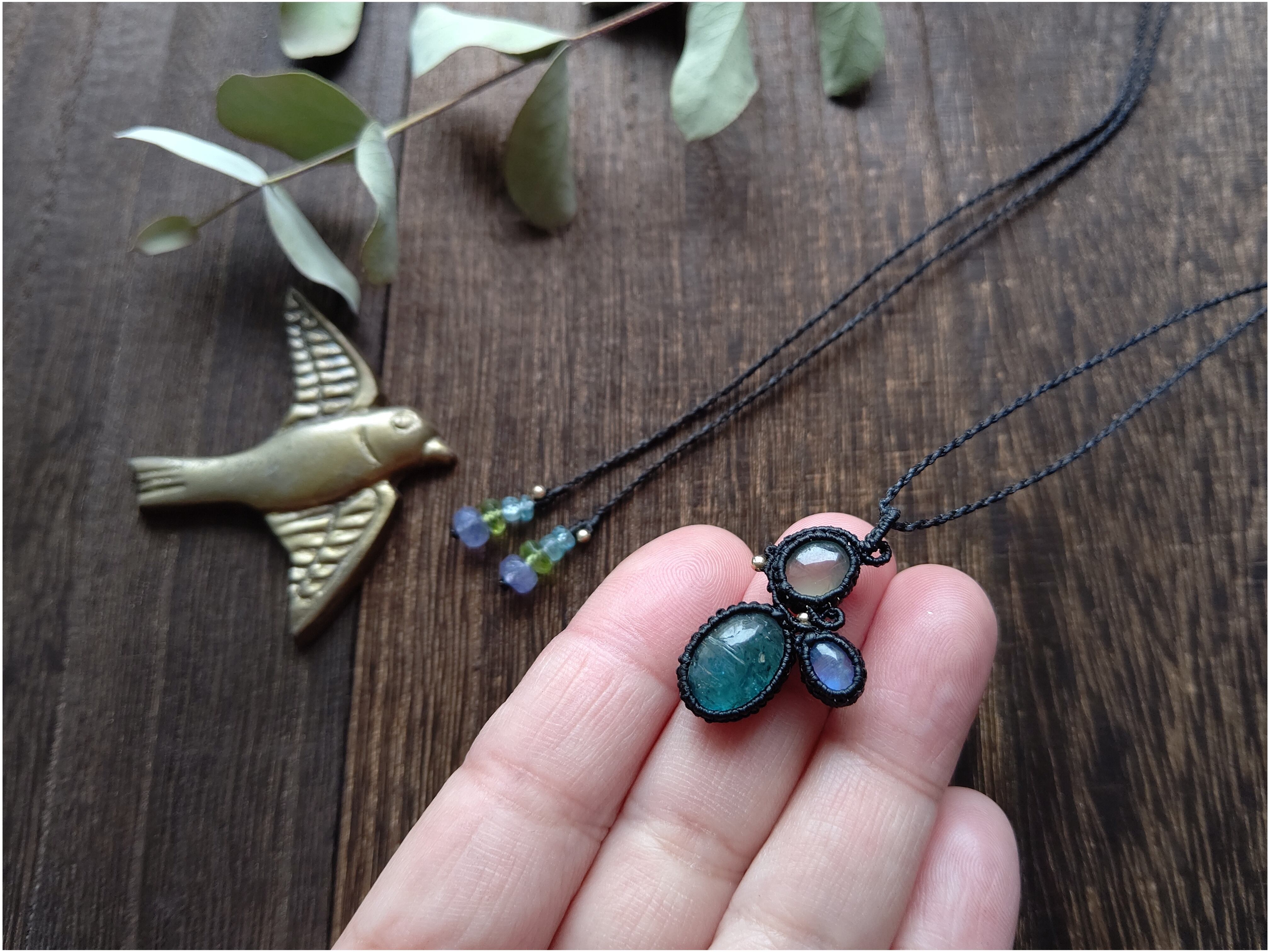 ブルーグリーンアパタイト×ブルームーンストーン×プレナイトのマクラメペンダント