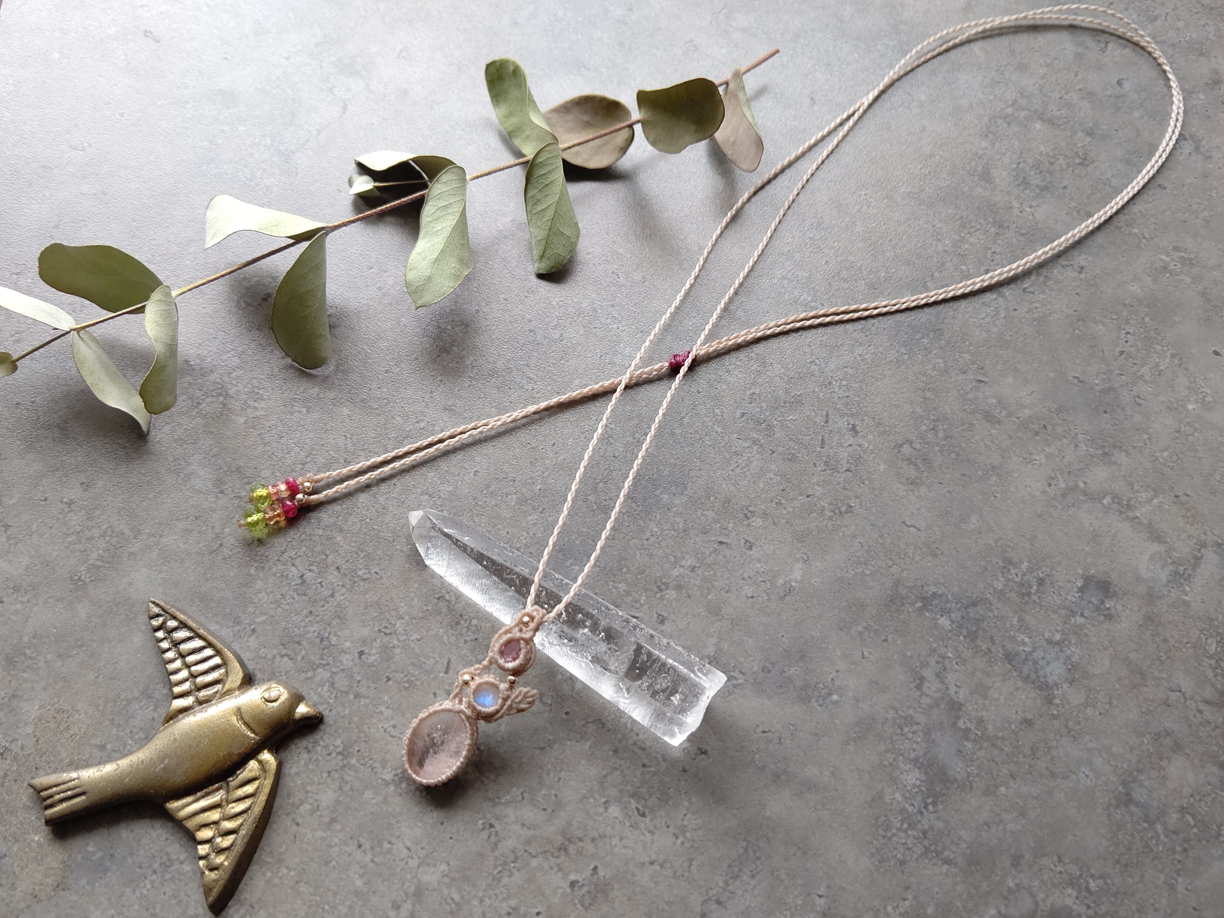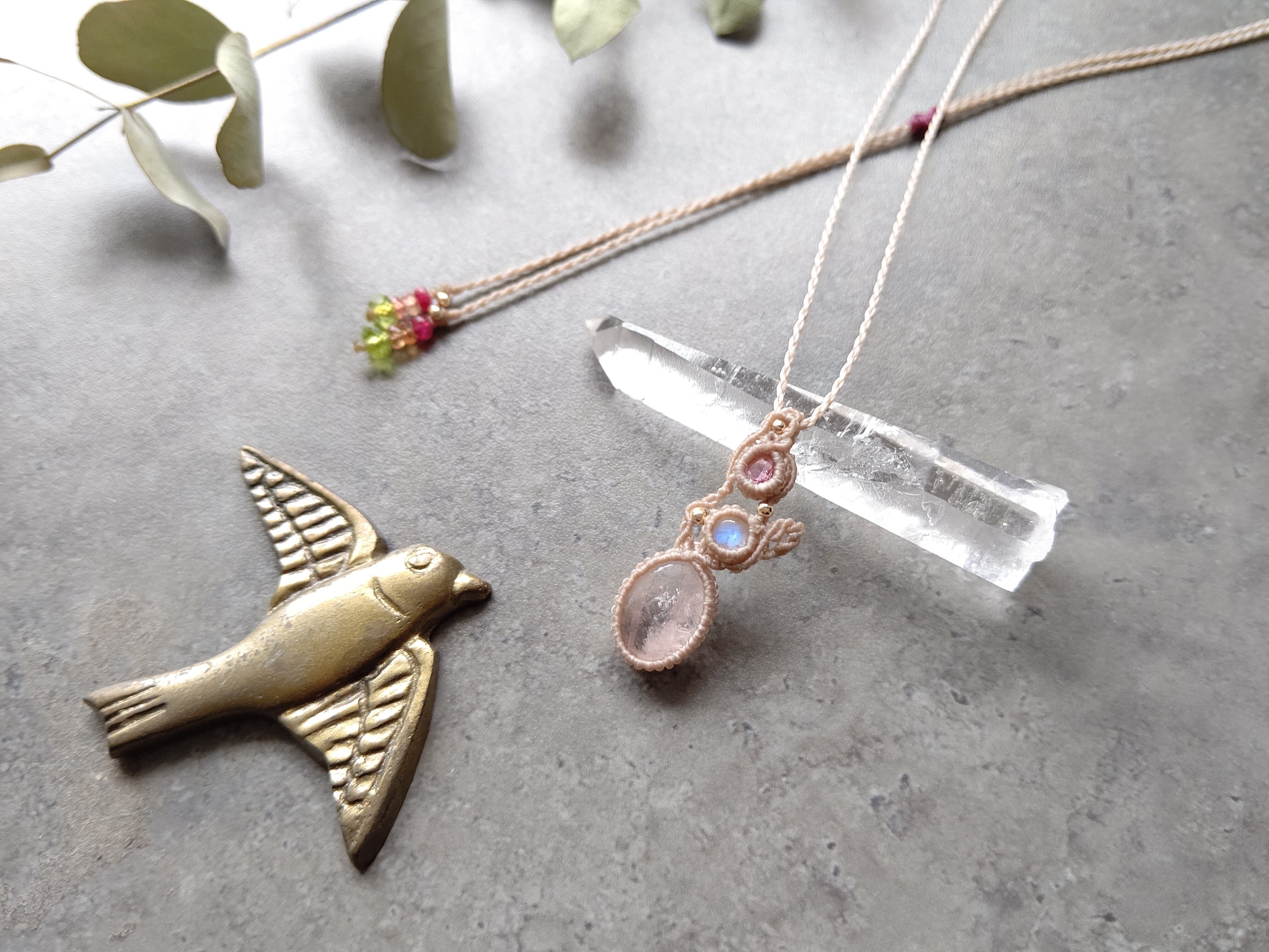 天然石は宝石質モルガナイト、ブルームーンストーン、宝石質ピンクトルマリンです。卵から雛が孵るような、新しい始まりを予感させるようなイメージで編み込んでいます。ピンクトルマリンはジュエリーカットされているルースを使用しました。