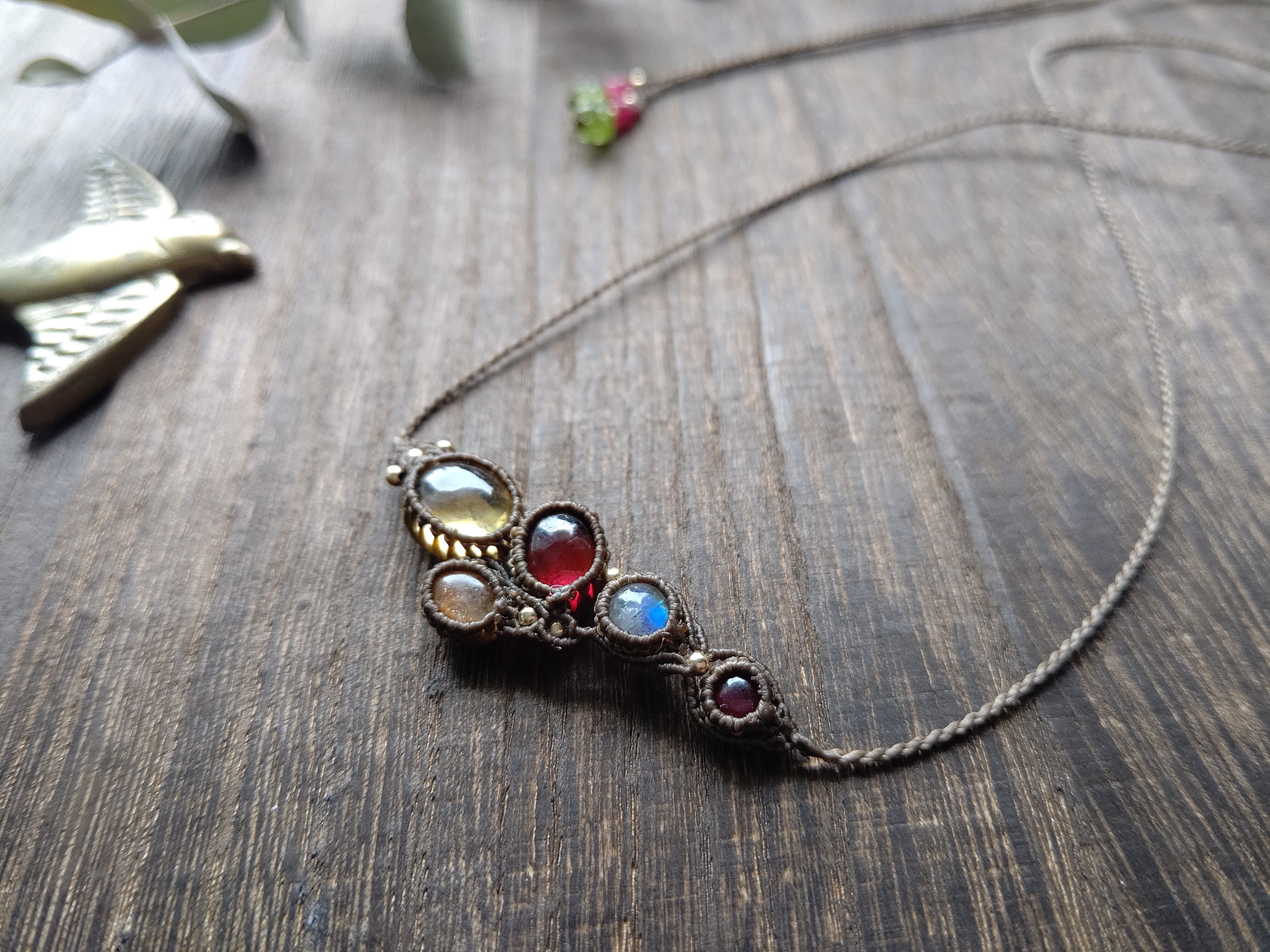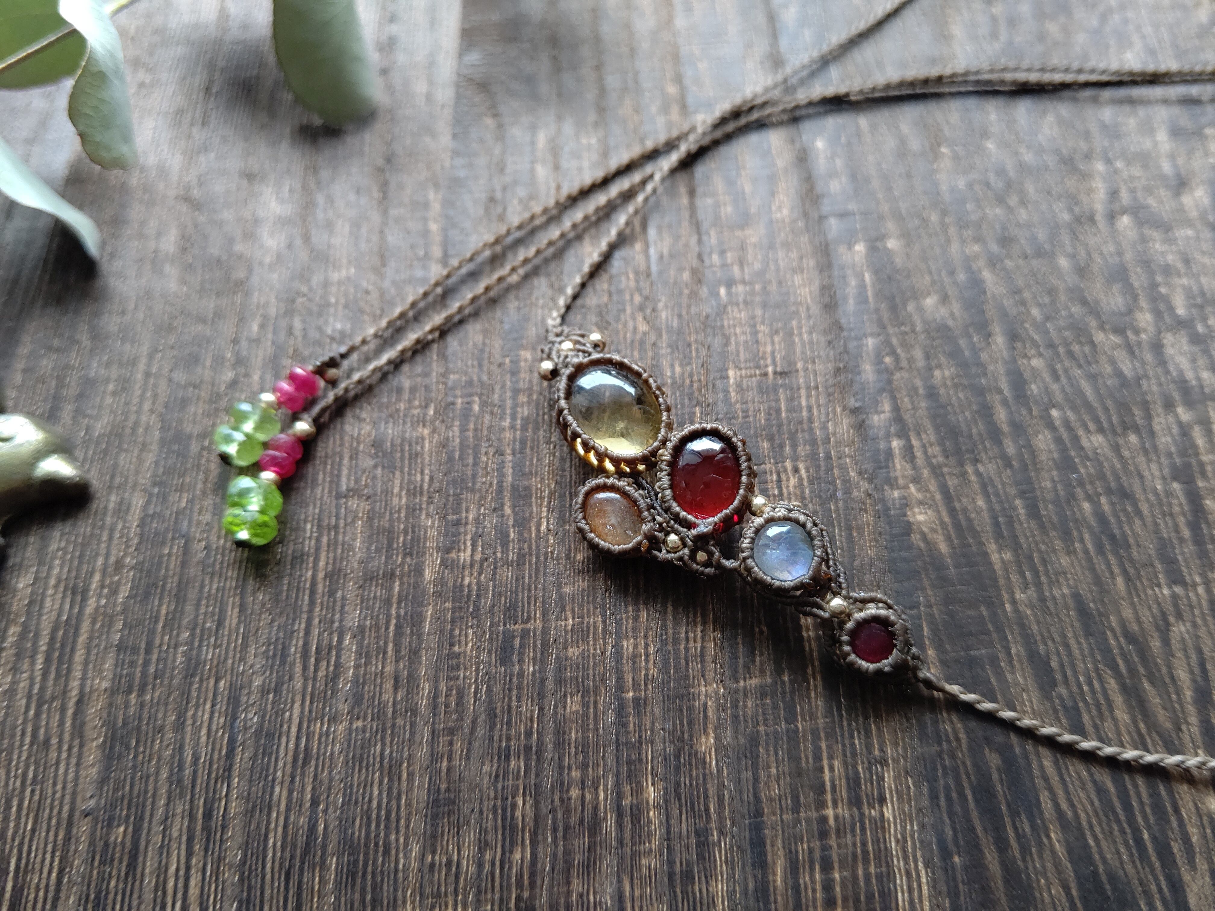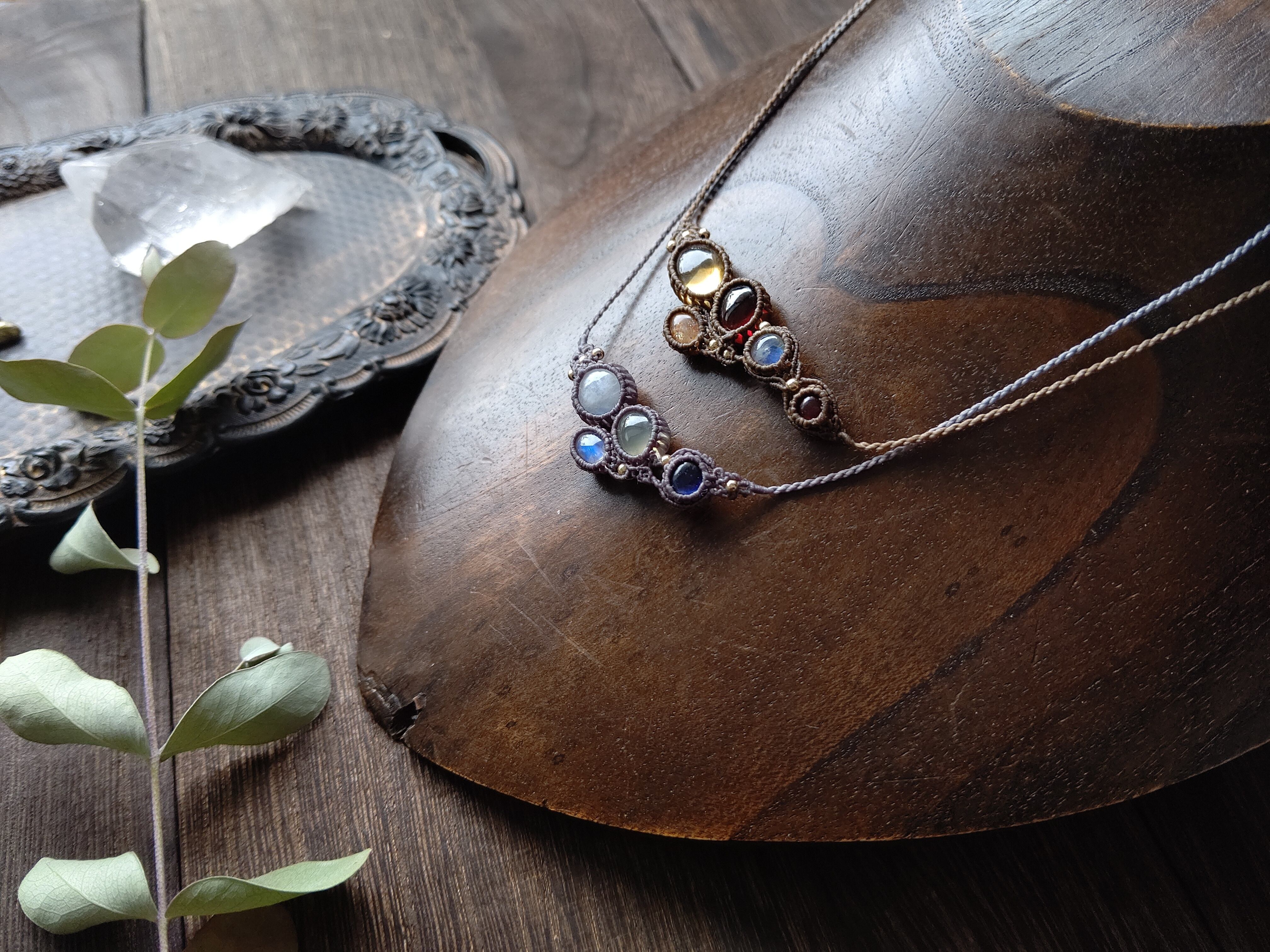 ペンダントトップの横幅は約5㎝、縦は約1.5㎝です。大きすぎず小さすぎず、0.25㎜の極細糸で丁寧に編み込んでいるので、複数の天然石を連結させていますが重さや野暮ったさがなくすっきりとしたデザインでお使いいただけます。