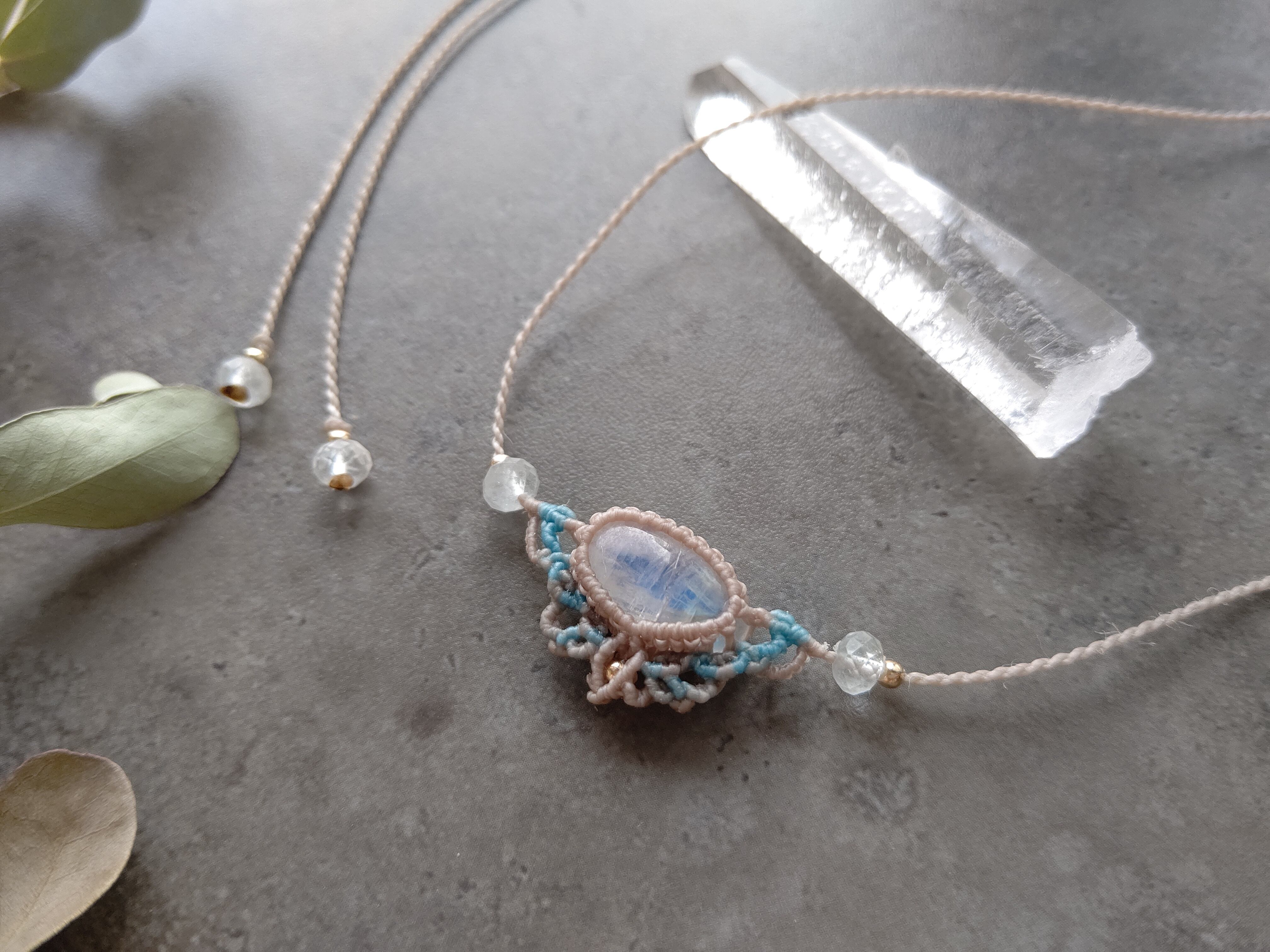 少し透明感のある石質に、角度によってブルーのシラーが美しくご覧いただけるルースです。直上に光がある時などはより強くシラーがご覧いただけます。左右にホワイトトパーズのビーズと14kgfビーズをあしらい、マクラメらしい編み込みがありながらもシンプルにワンポイントになるように仕上げました。