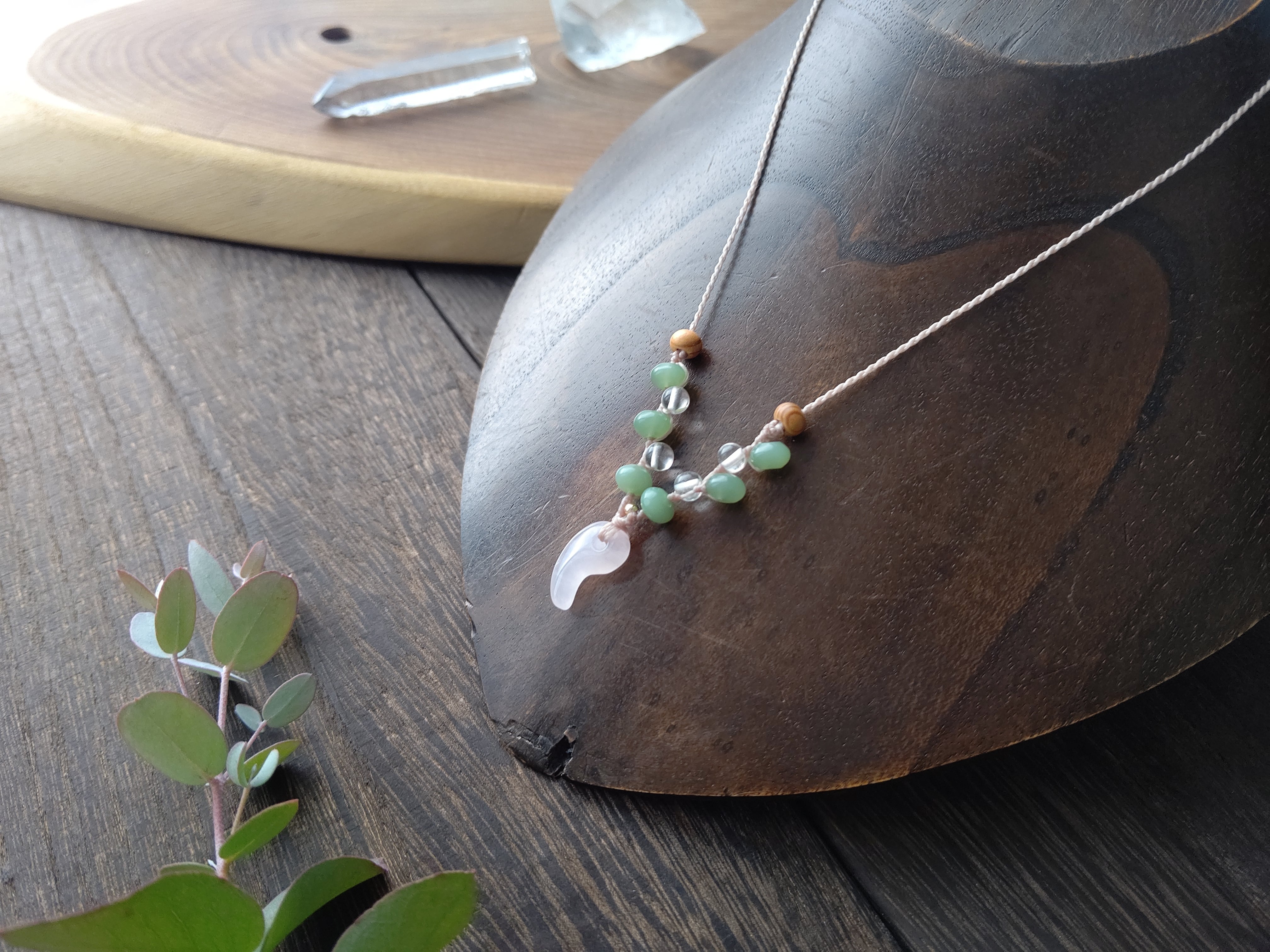 ローズクォーツの勾玉とネフライト×ヒマラヤ水晶×屋久杉のペンダント