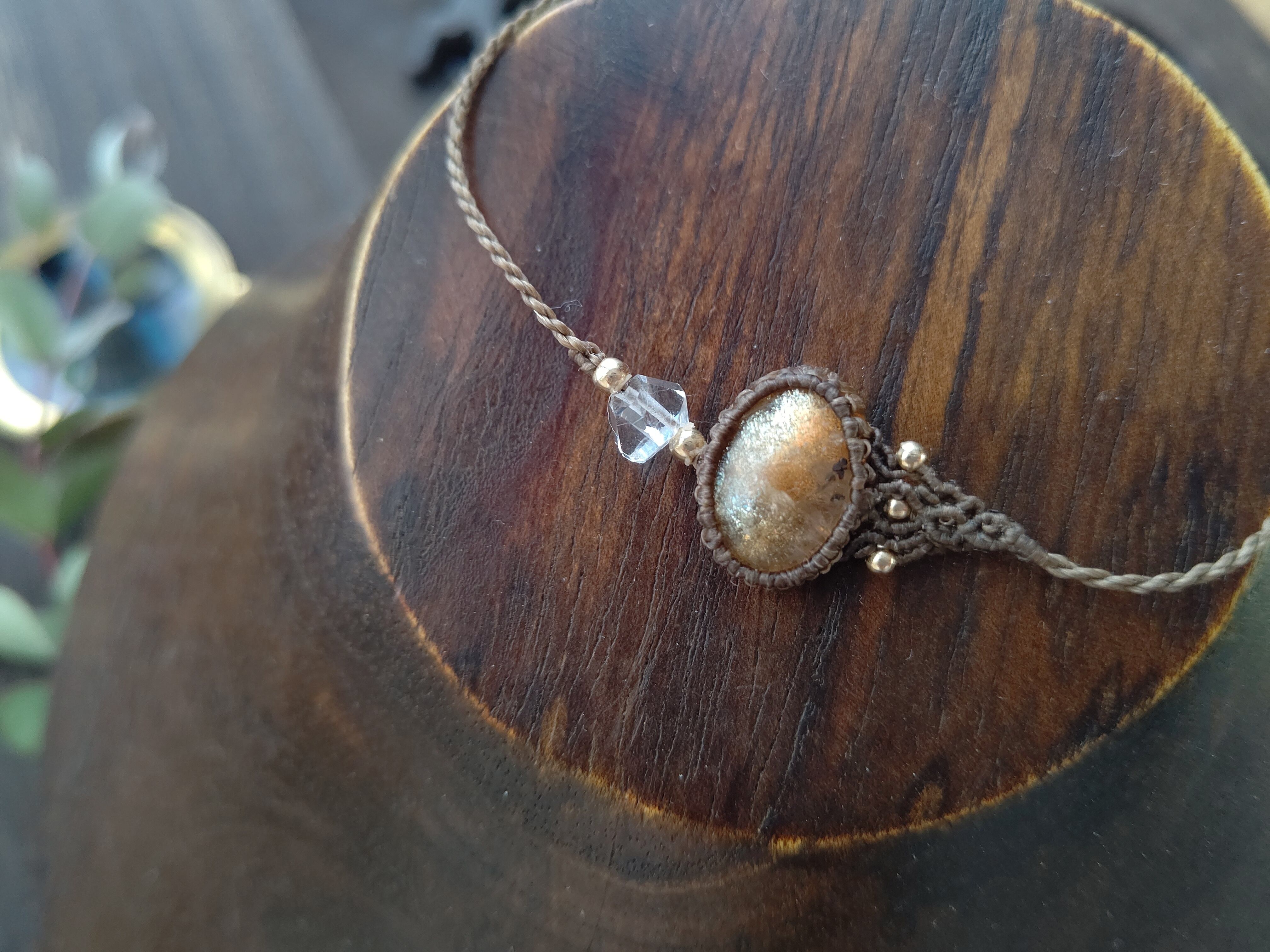 ハーキマーダイヤモンドの原石と少し大きめの虹色サンストーンを組み合わせスッキリとした細身のデザインのアシンメトリーブレスレットを製作しました。