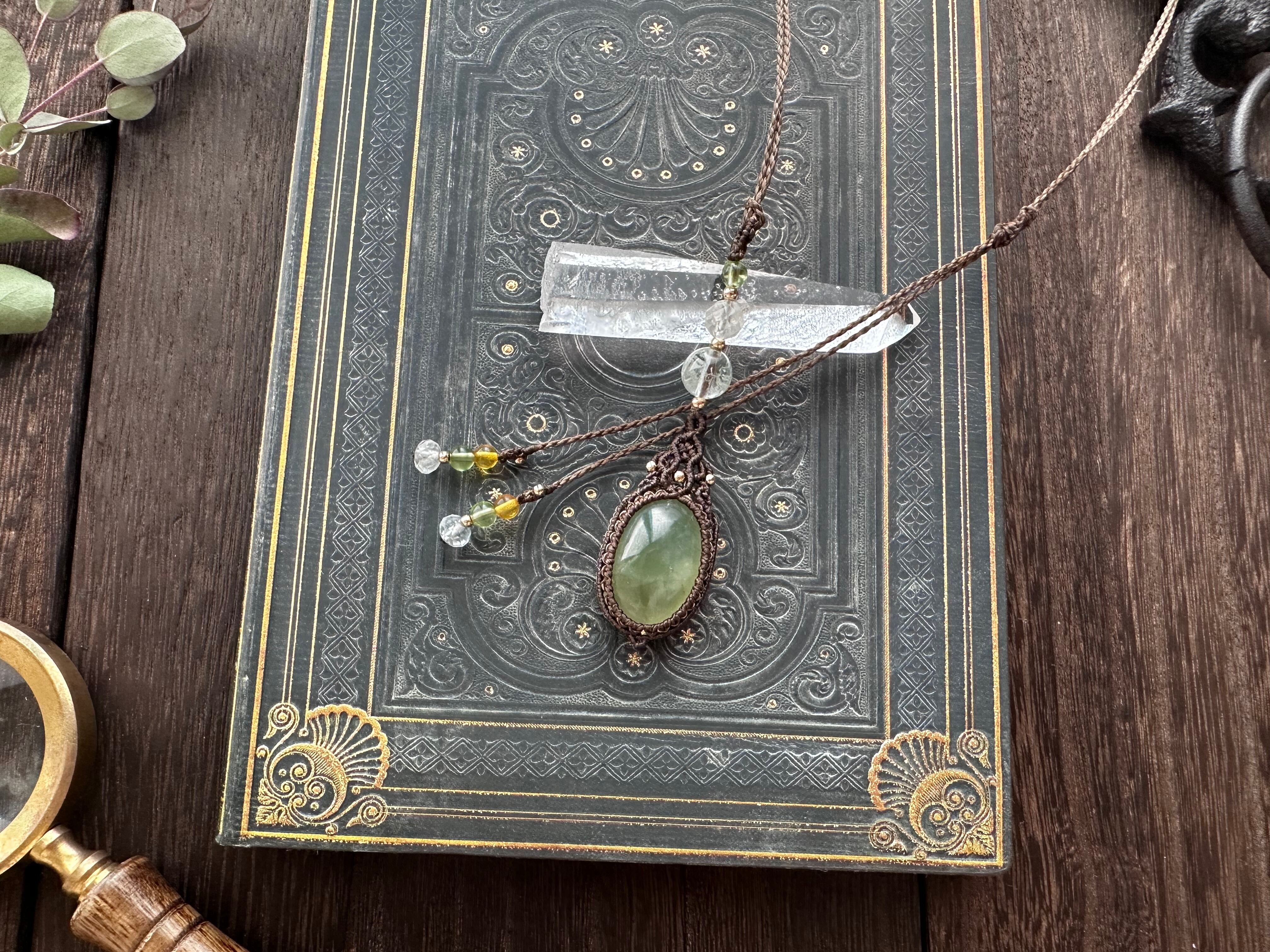 3粒の天然石ビーズと大粒のプレナイトを組み合わせマクラメペンダントを仕立てました。