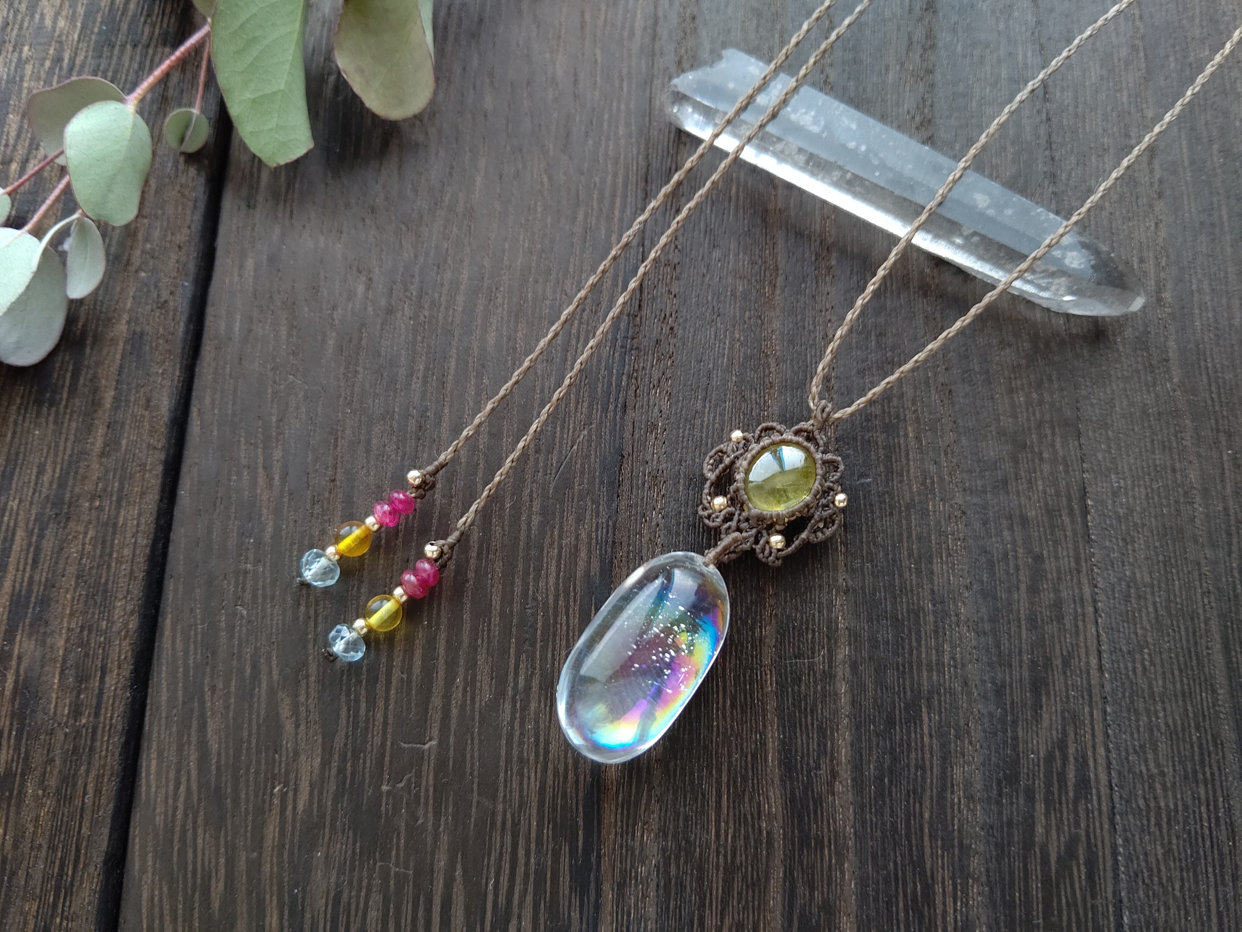 アイリスクォーツ×スフェーンの虹とお花のマクラメペンダント