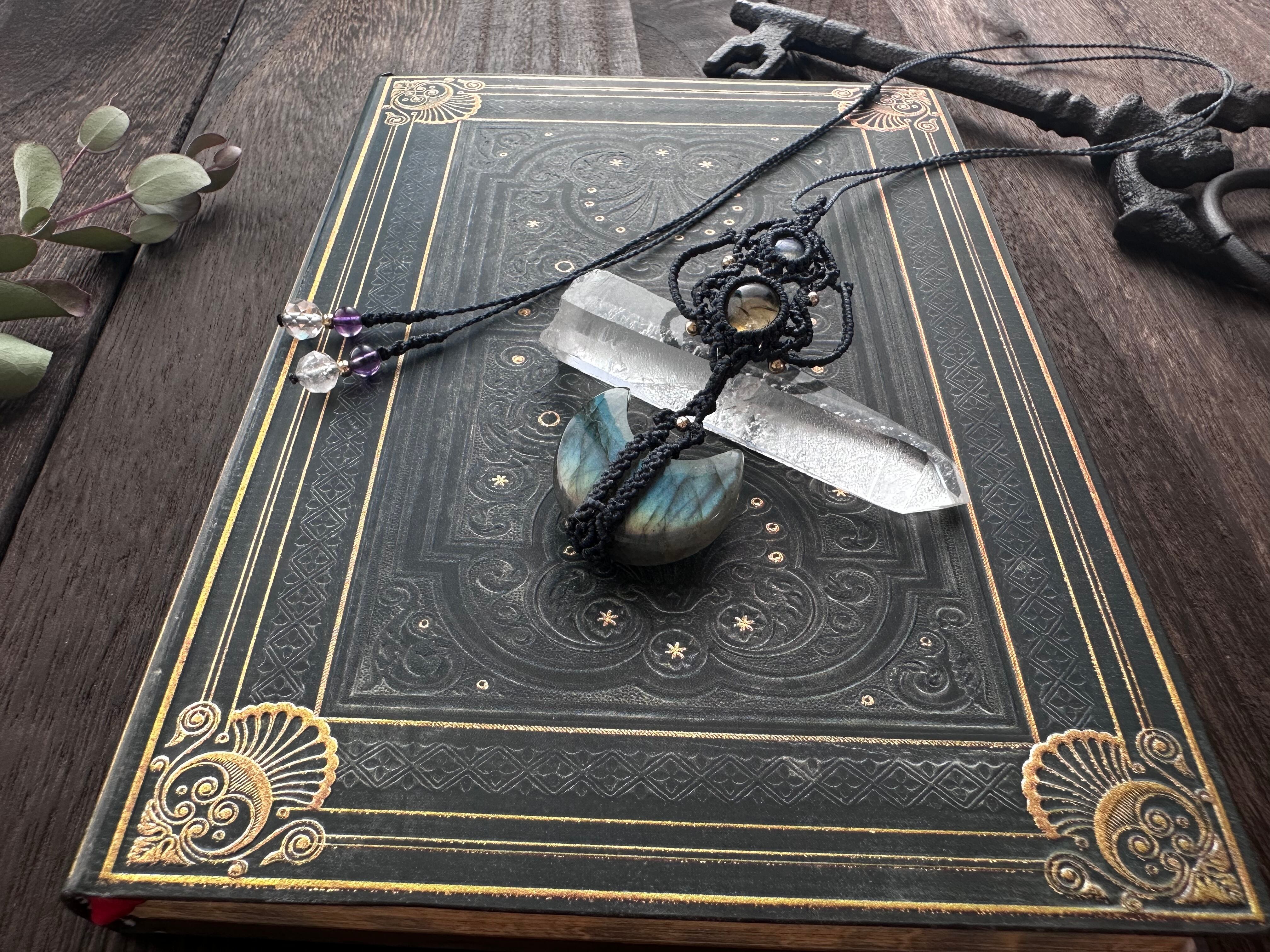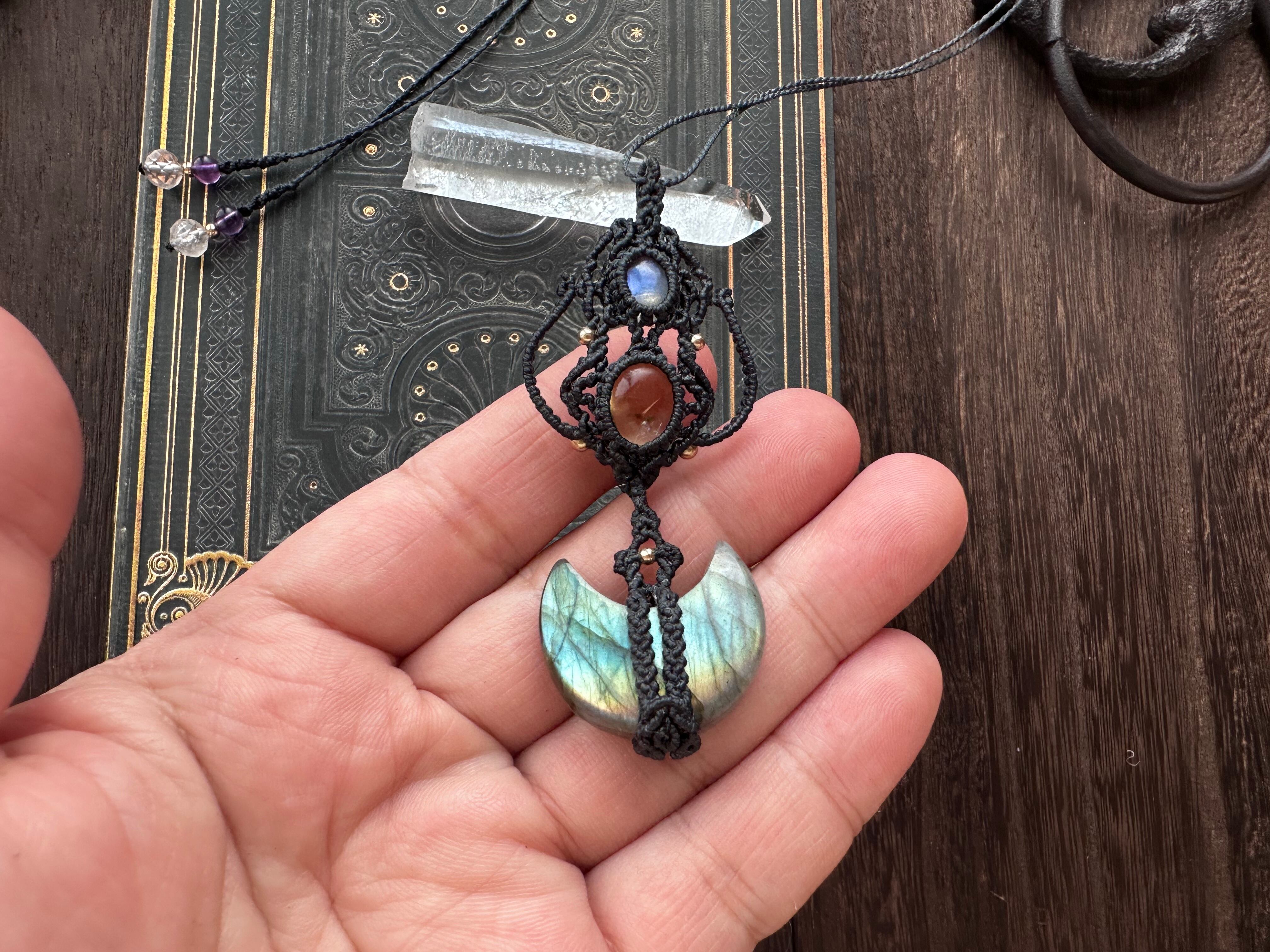 ~月のゆりかご~ 三日月ラブラドライト×シトリン×ブルームーンストーンのマクラメペンダント