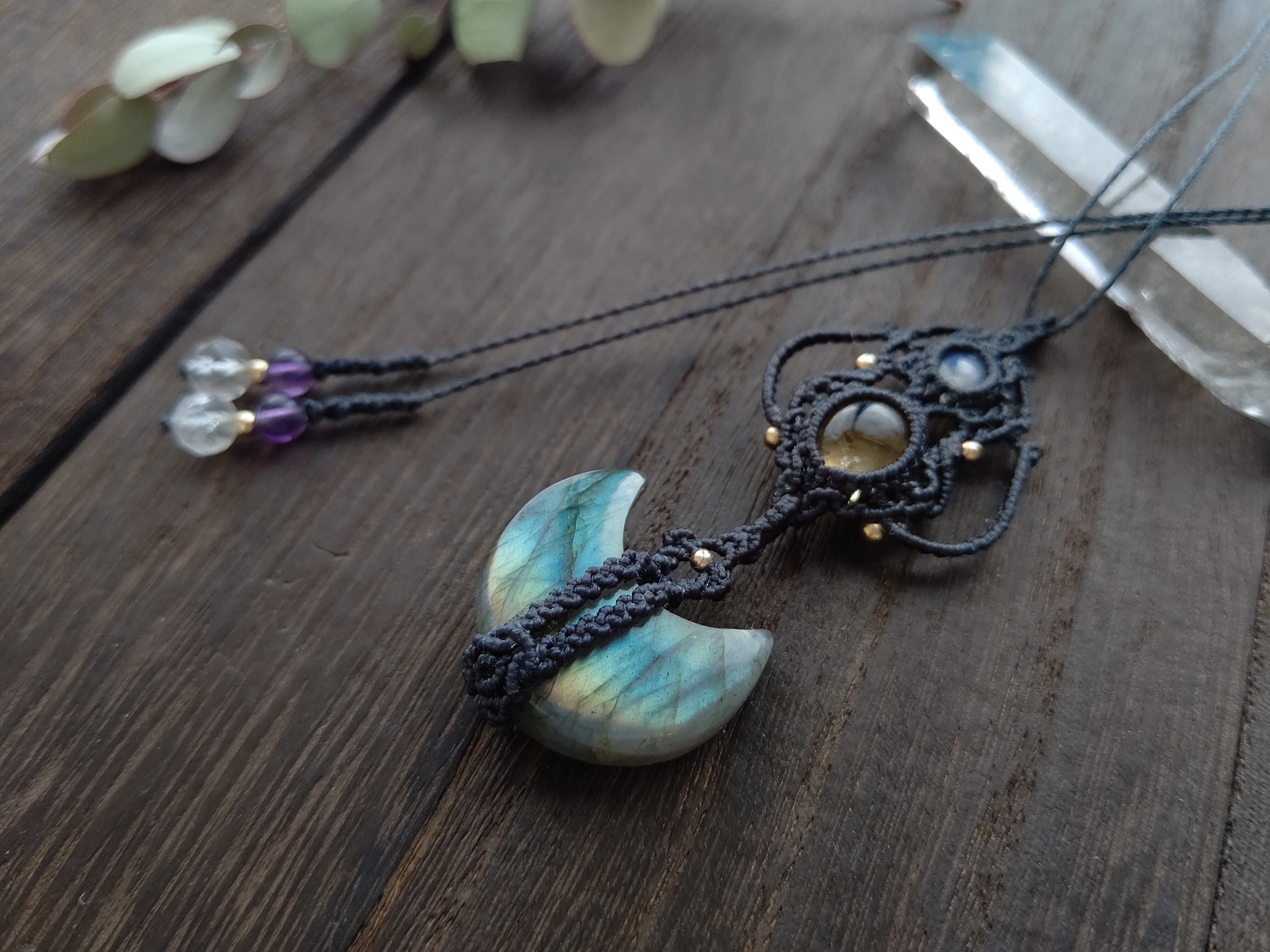 三日月の形状のラブラドライトにシトリン、淡いブルーのシラーが美しいブルームーンストーン(ホワイトラブラドライト)を組み合わせてマクラメならではのペンダントを製作しました。