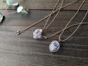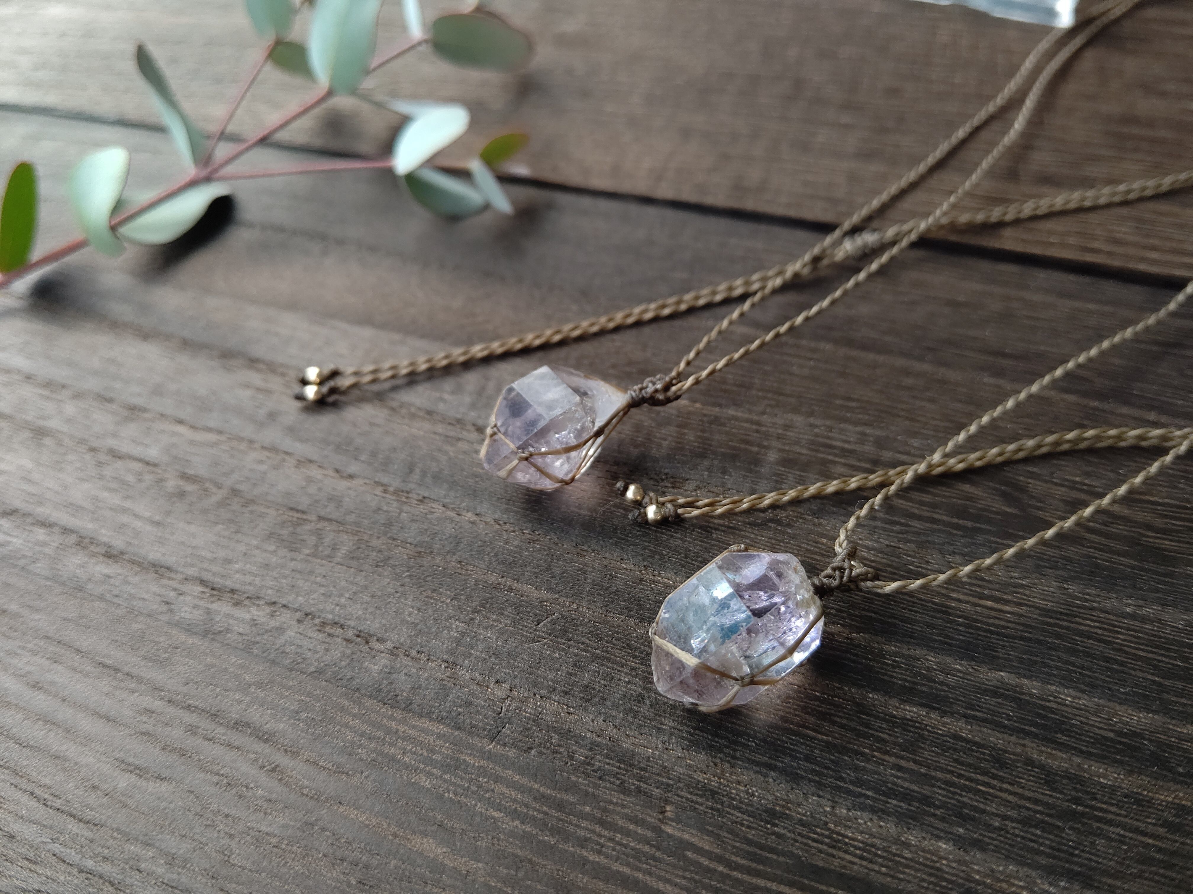 アメジストの色合いは透明感のある美しい結晶で、原石の形状を生かして極細の糸で丁寧に編み上げました。原石由来の欠けや内包クラック、母岩などもが見られるコロンとかわいらしい形状です。(2点並べている写真では奥の方です)