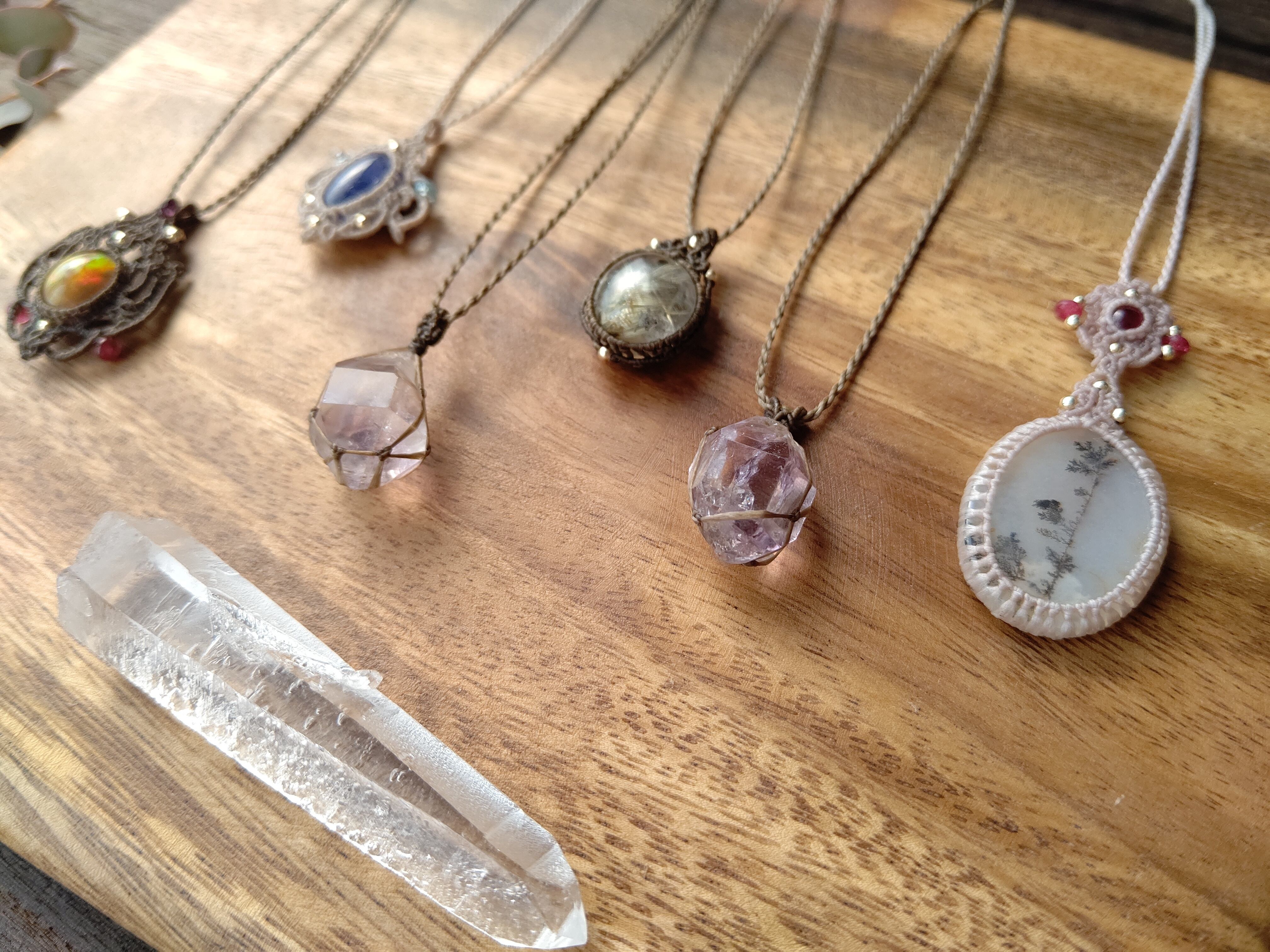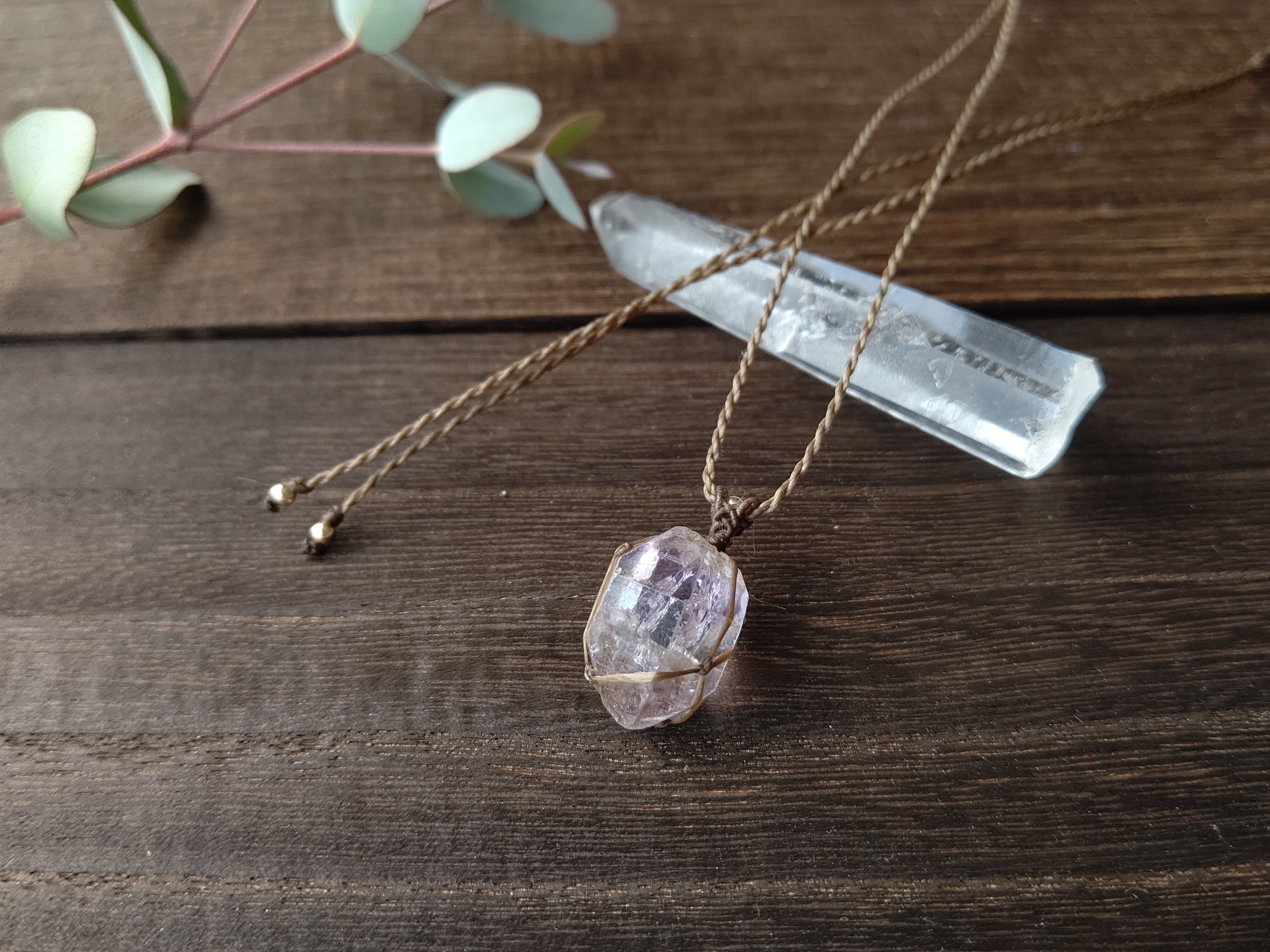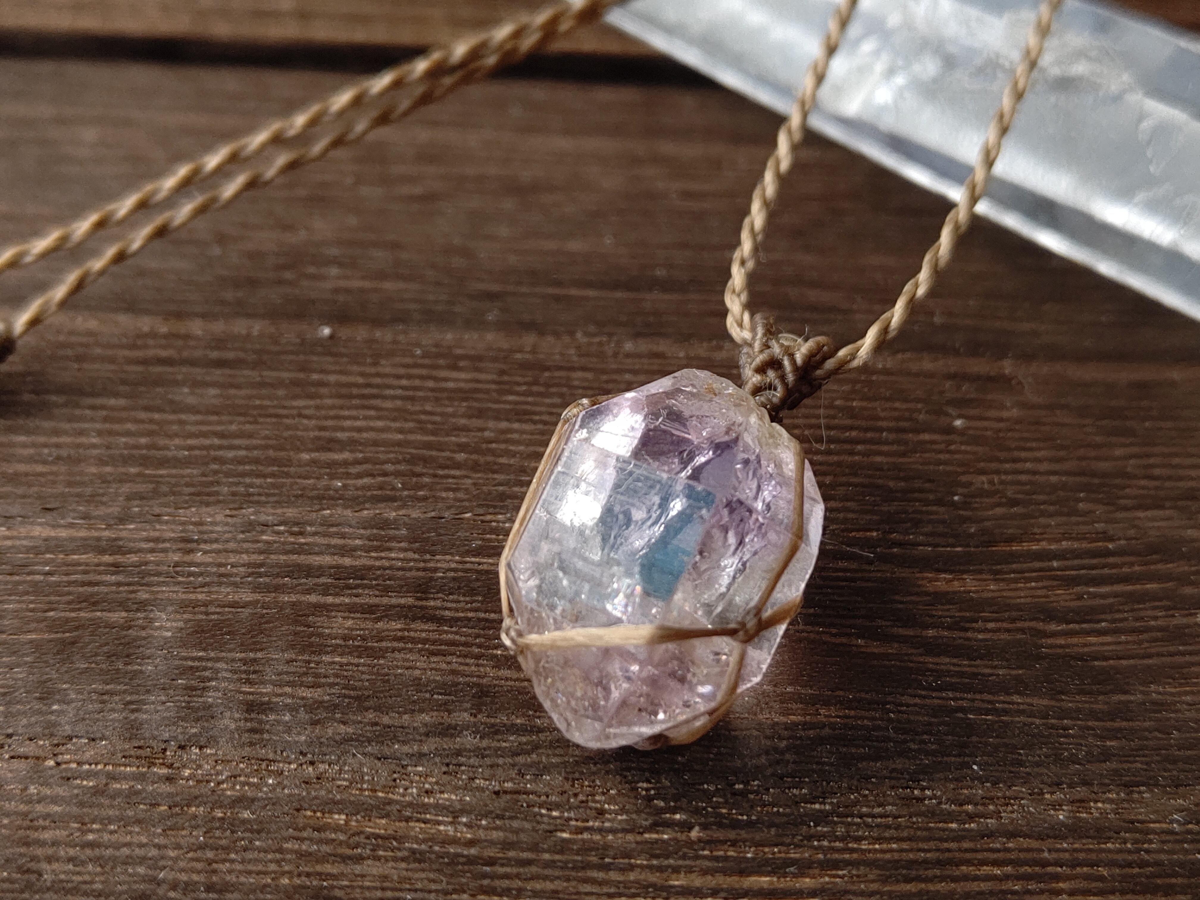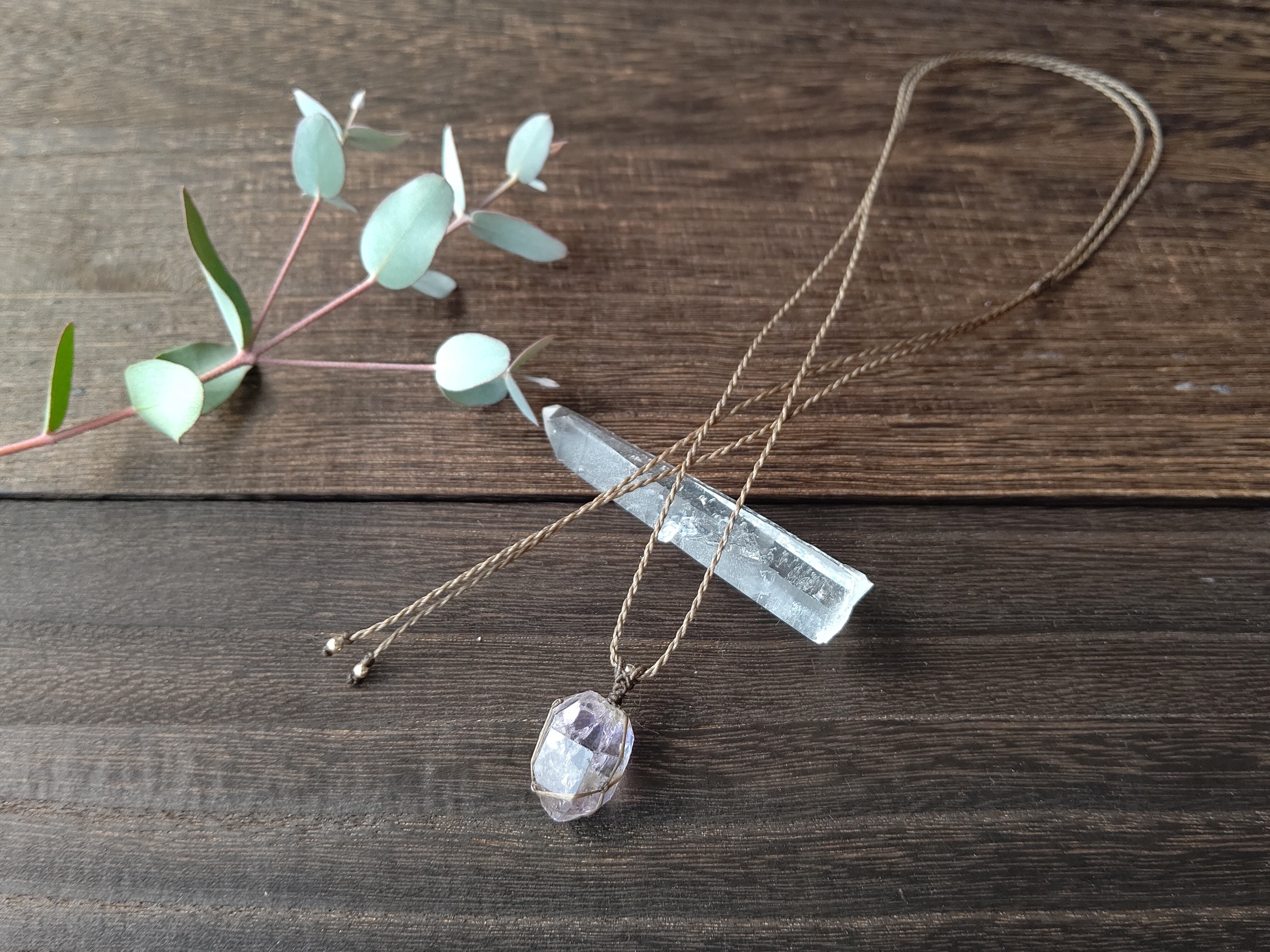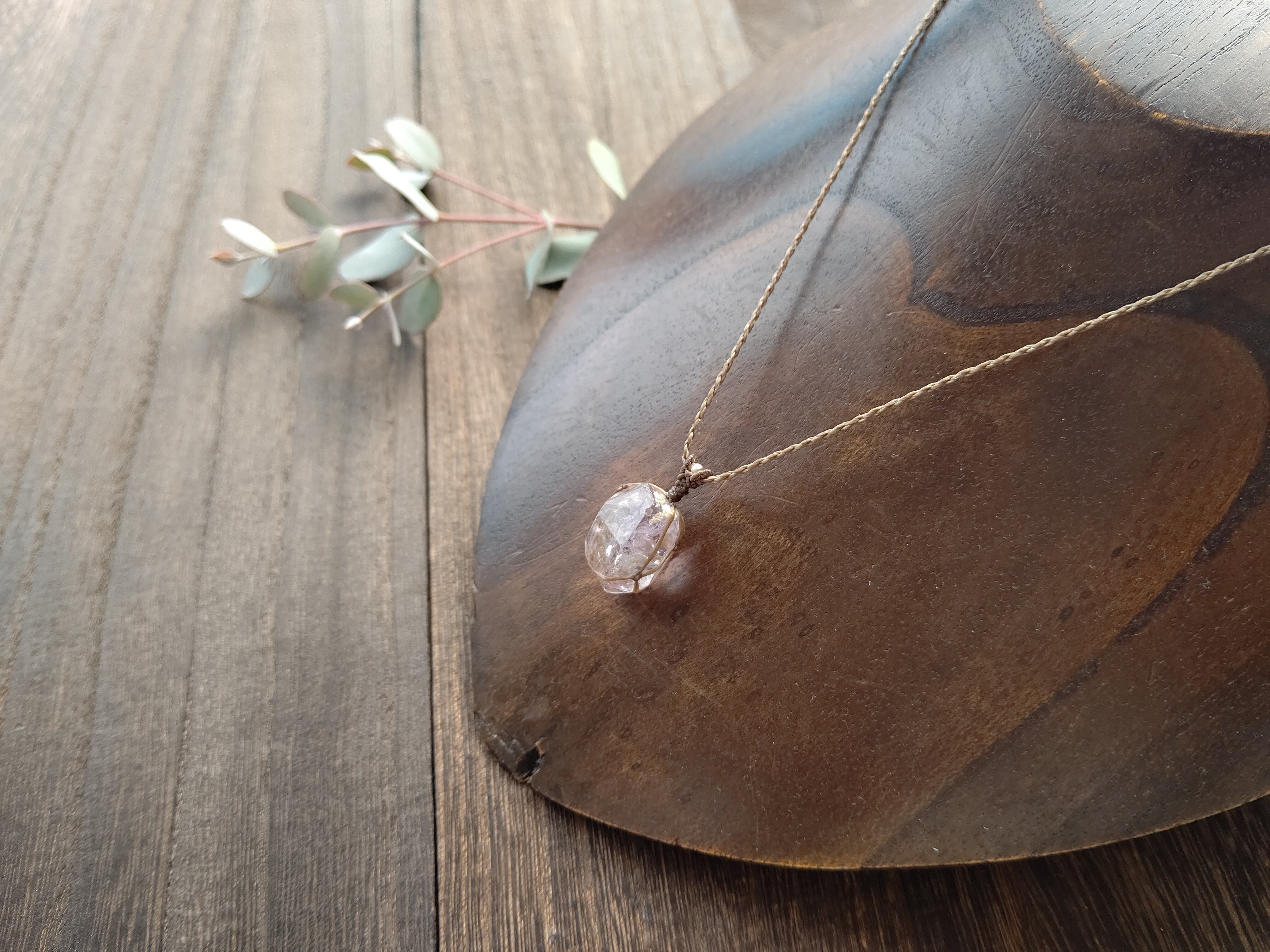 アメジストの色合いは透明感のある美しい結晶で、原石の形状を生かして極細の糸で丁寧に編み上げました。原石由来の欠けや内包クラック、母岩などもが見られるコロンとかわいらしい形状です。