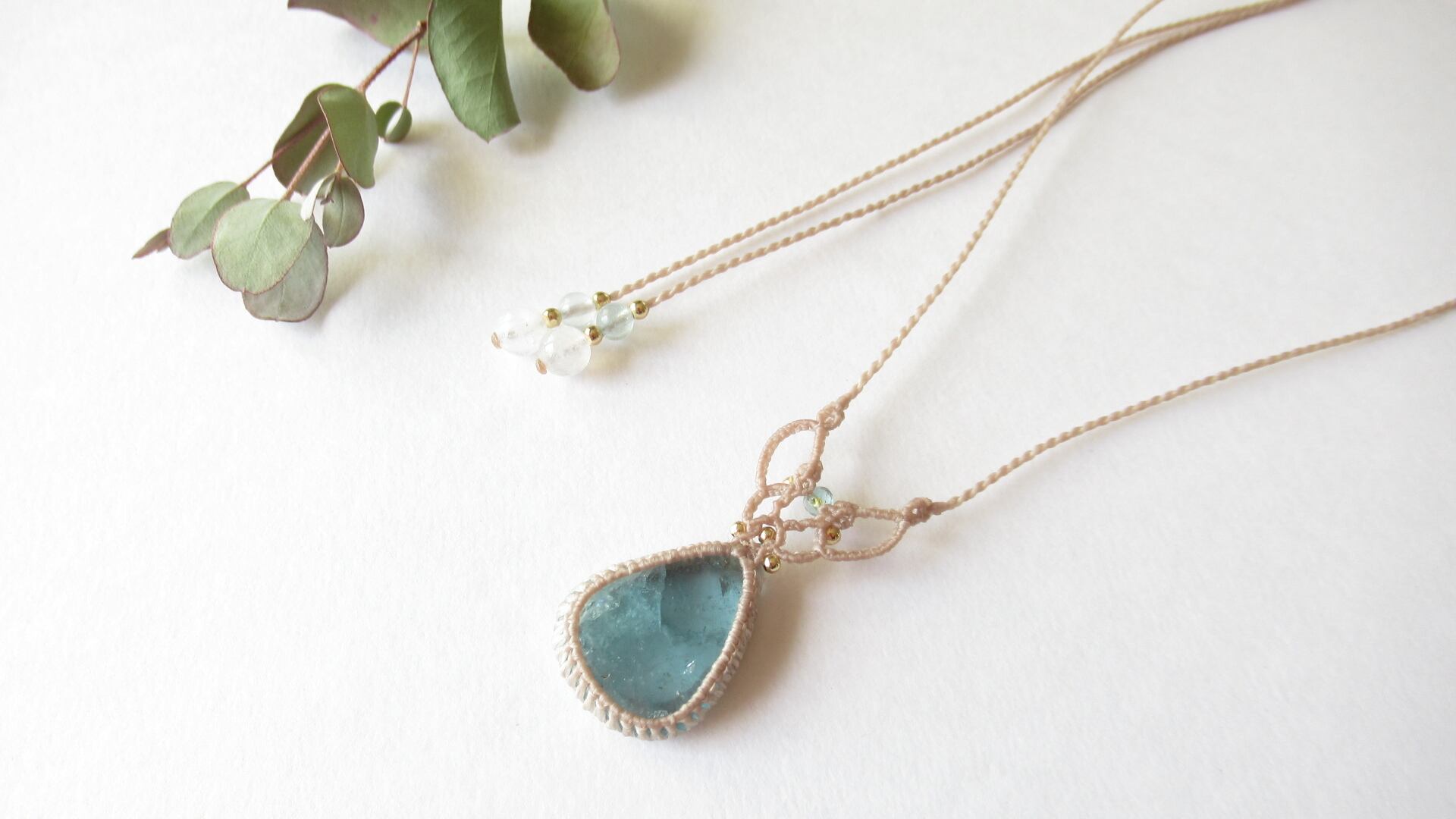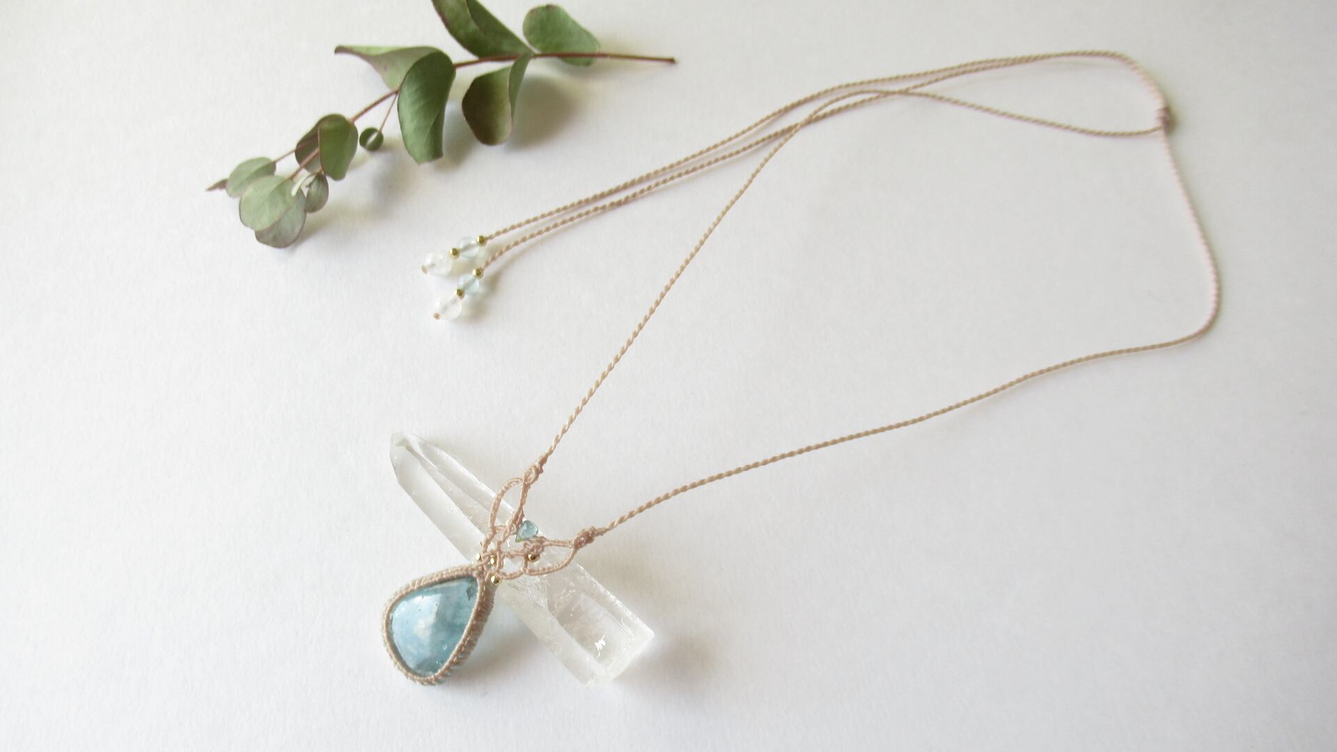 大粒で水色の色合いと透明感が美しいブラジル産の非加熱アクアマリンをマクラメらしい装飾を施してネックレスに仕立てました。