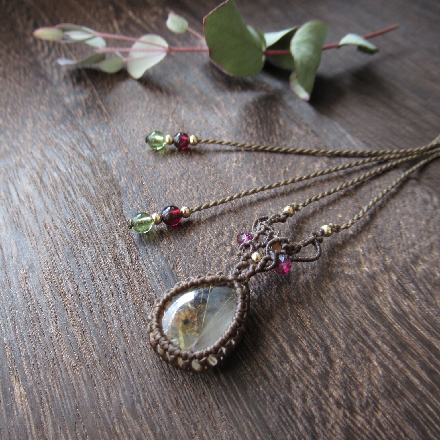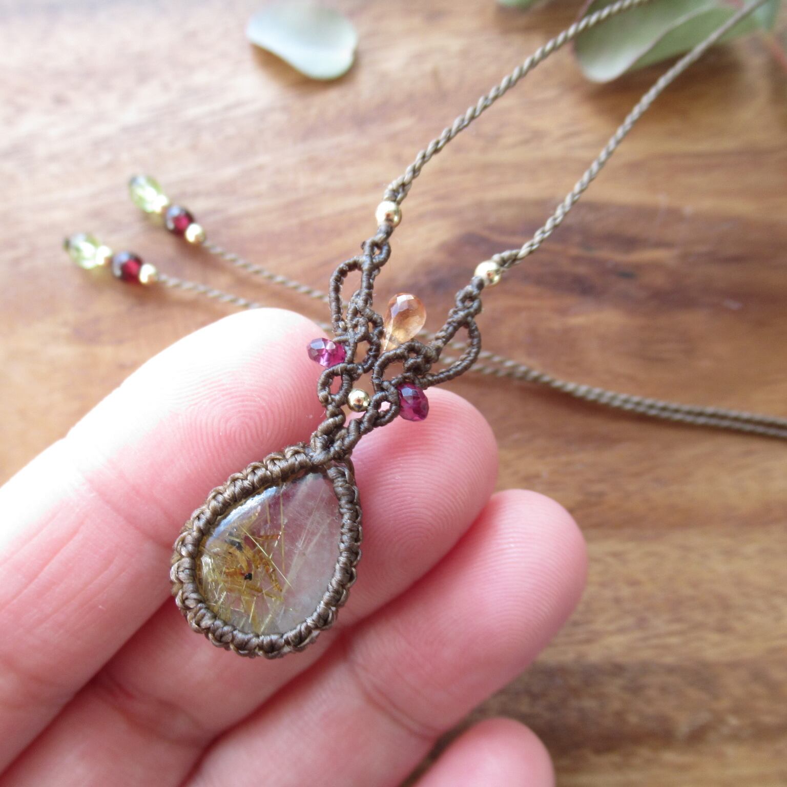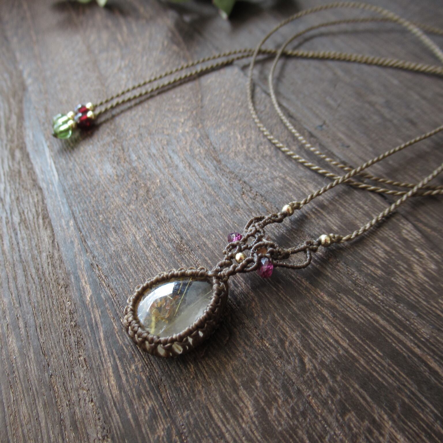 雫型のルチルクォーツをマクラメらしい編み込みのエレガントなデザインのネックレスに仕立てました。