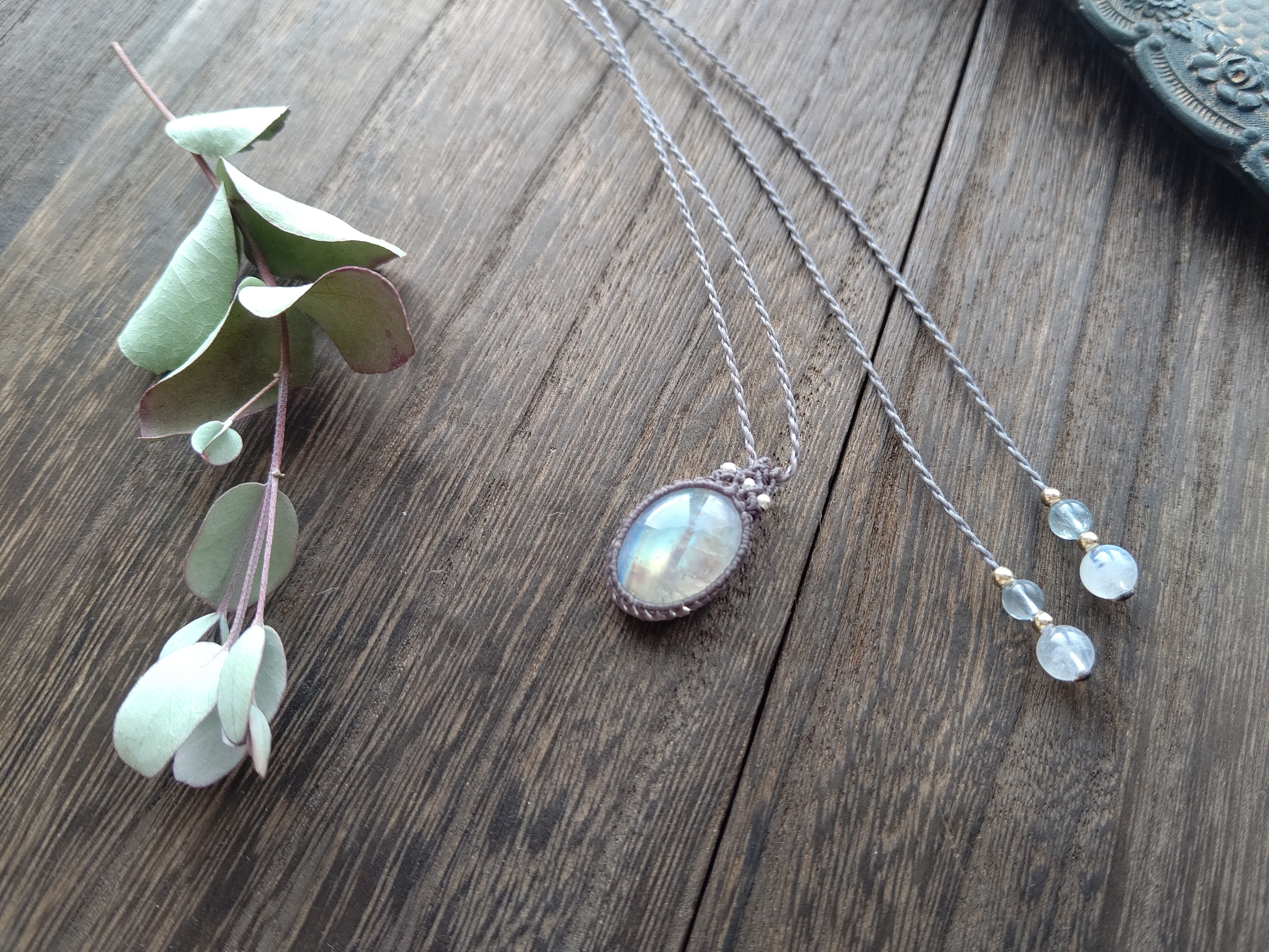 結び石は宝石質のアクアマリン、レインボームーンストーンです。
