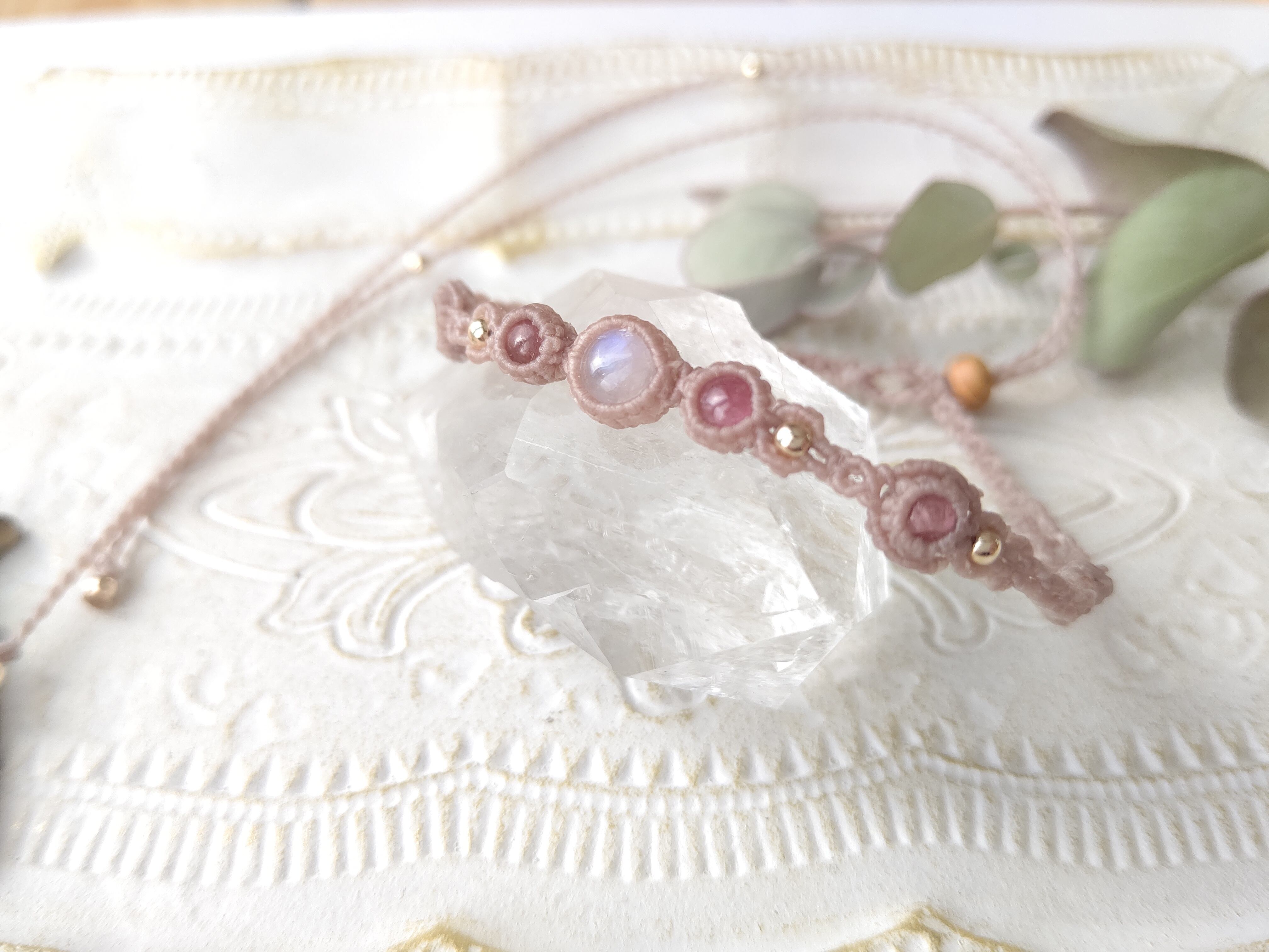 レインボームーンストーンと6粒のピンクトルマリンのクルっとリストブレスレット